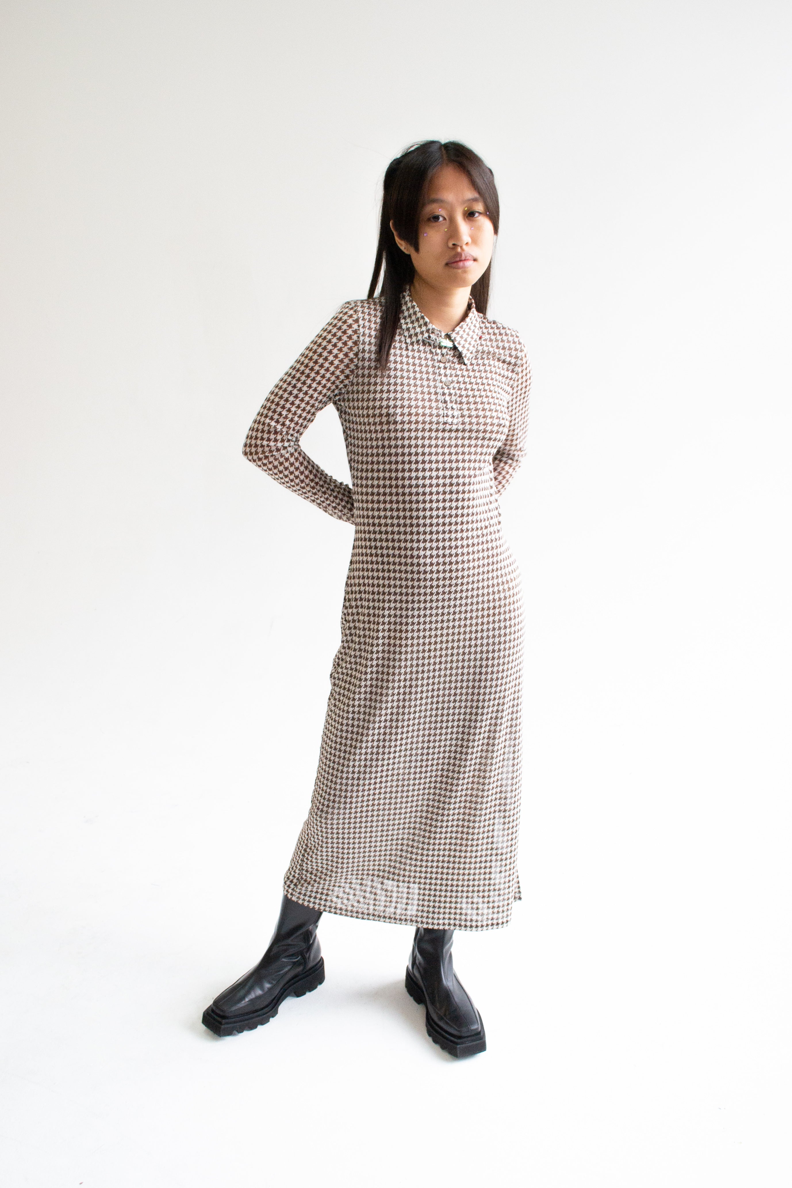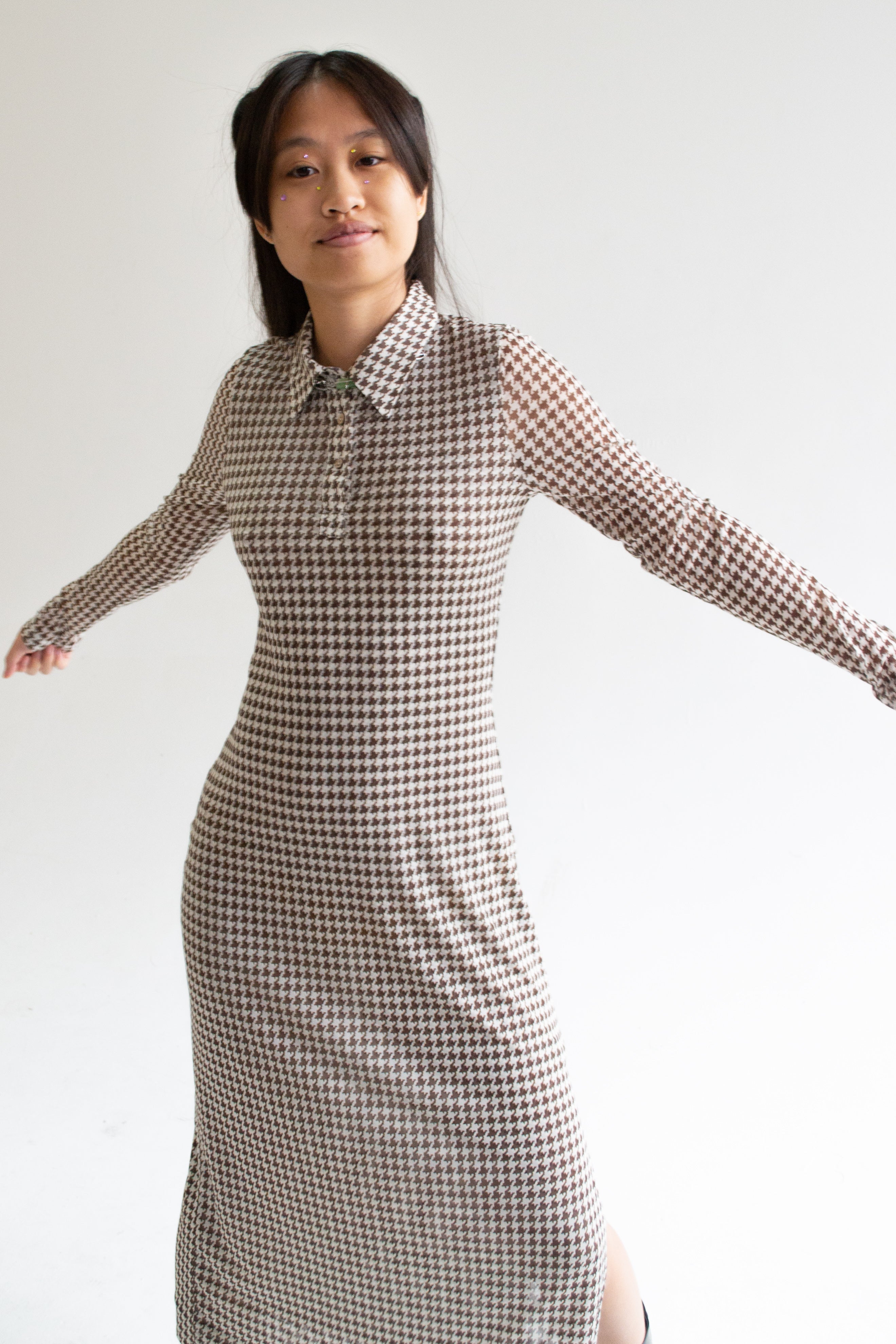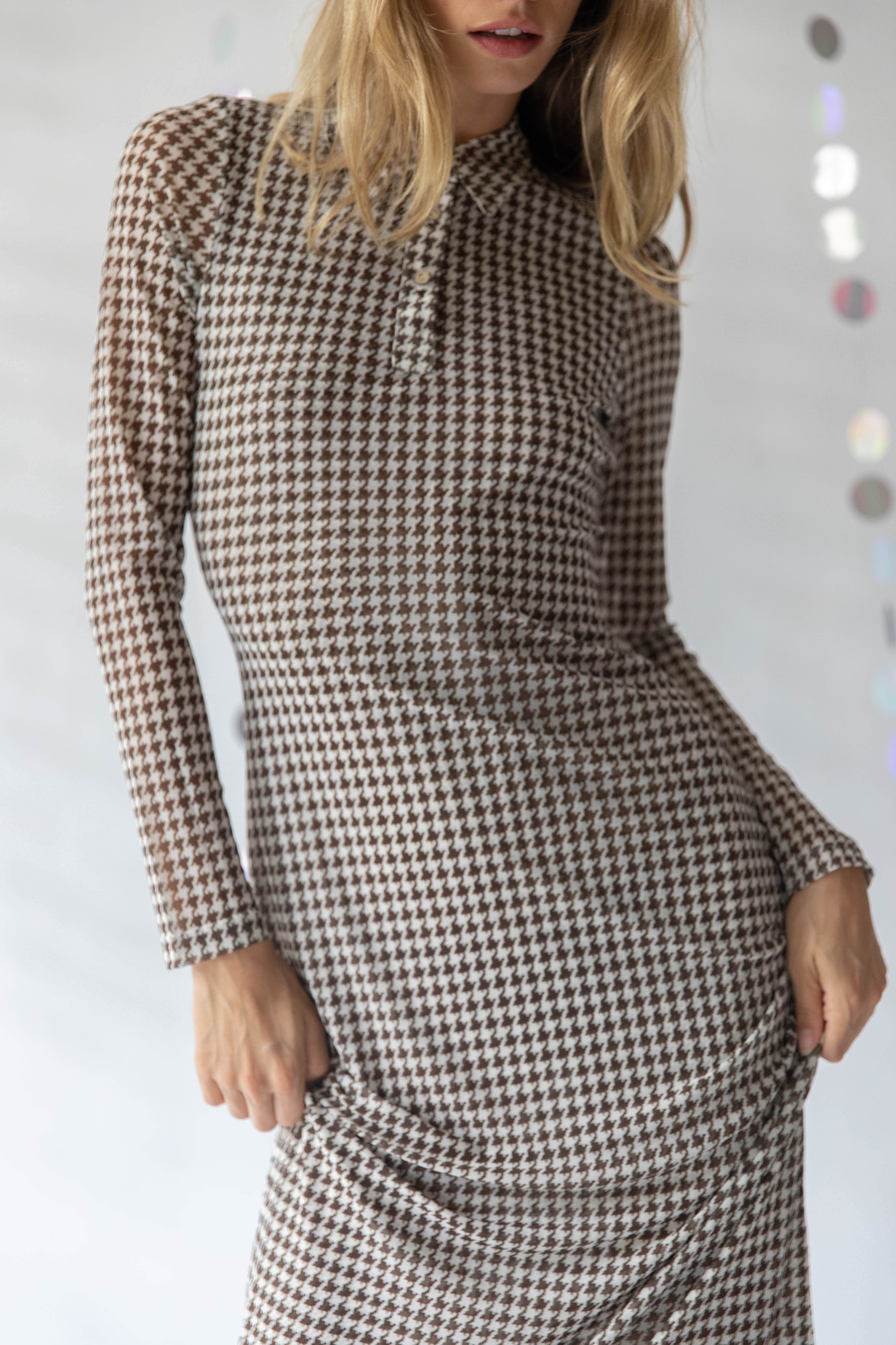 Houndstooth check print mesh midi dress with body hugging fit. Double lined to ensure coverage and a flattering fit. Fits true to size.