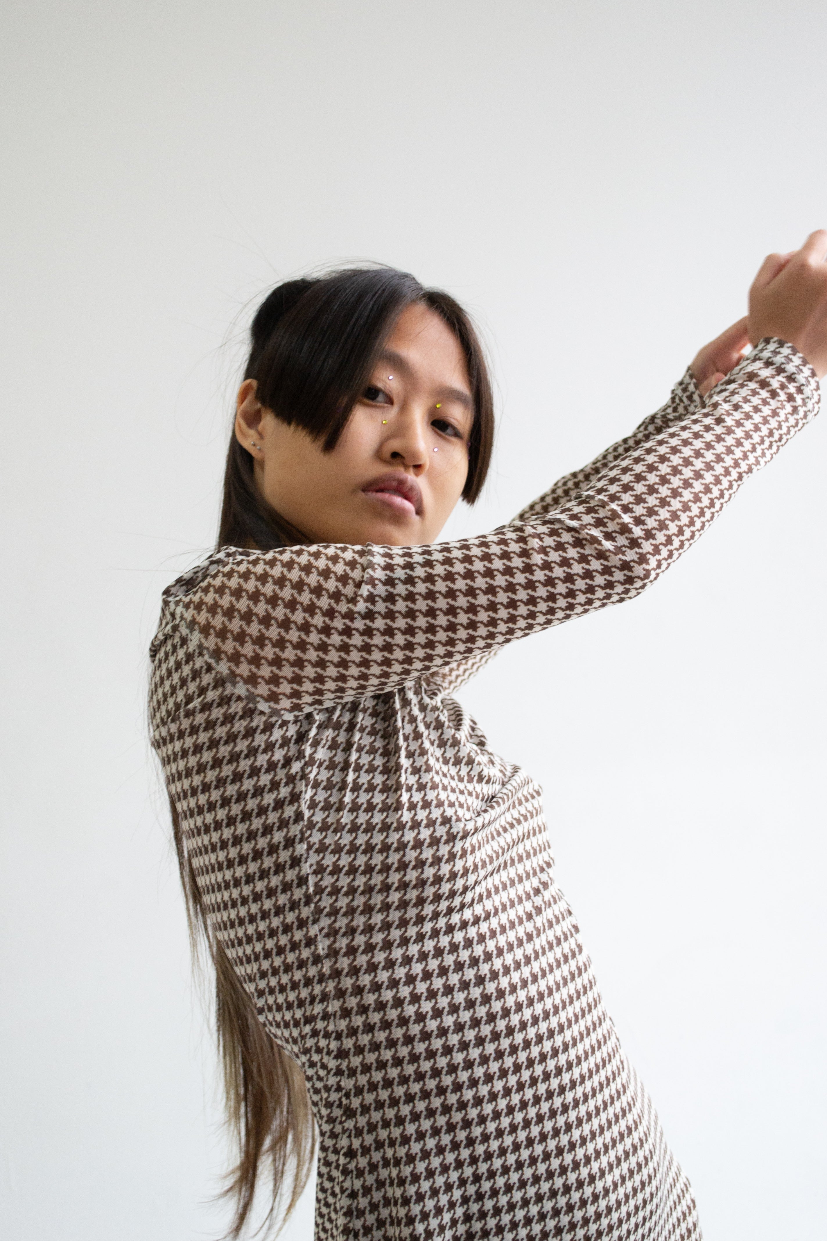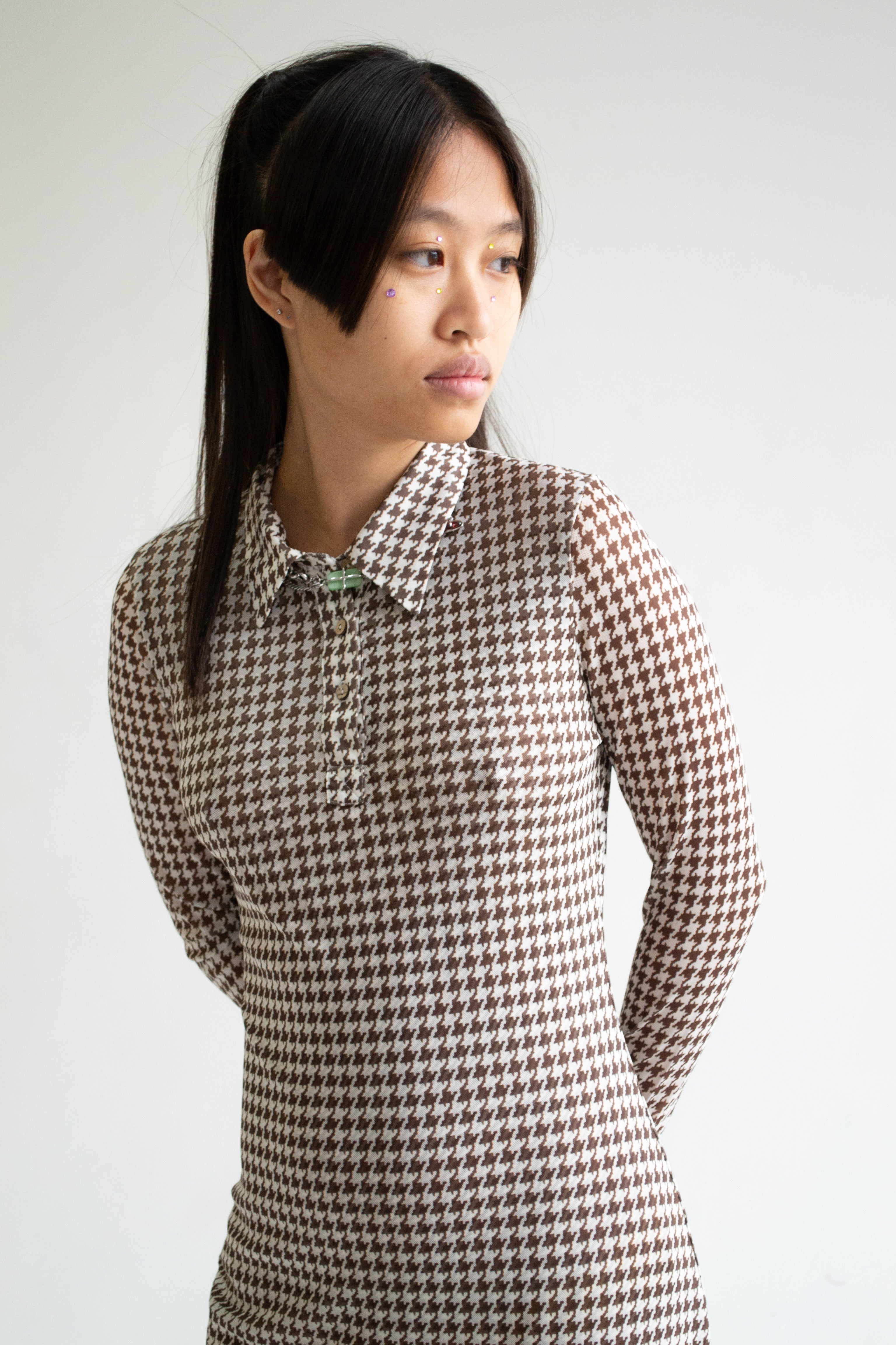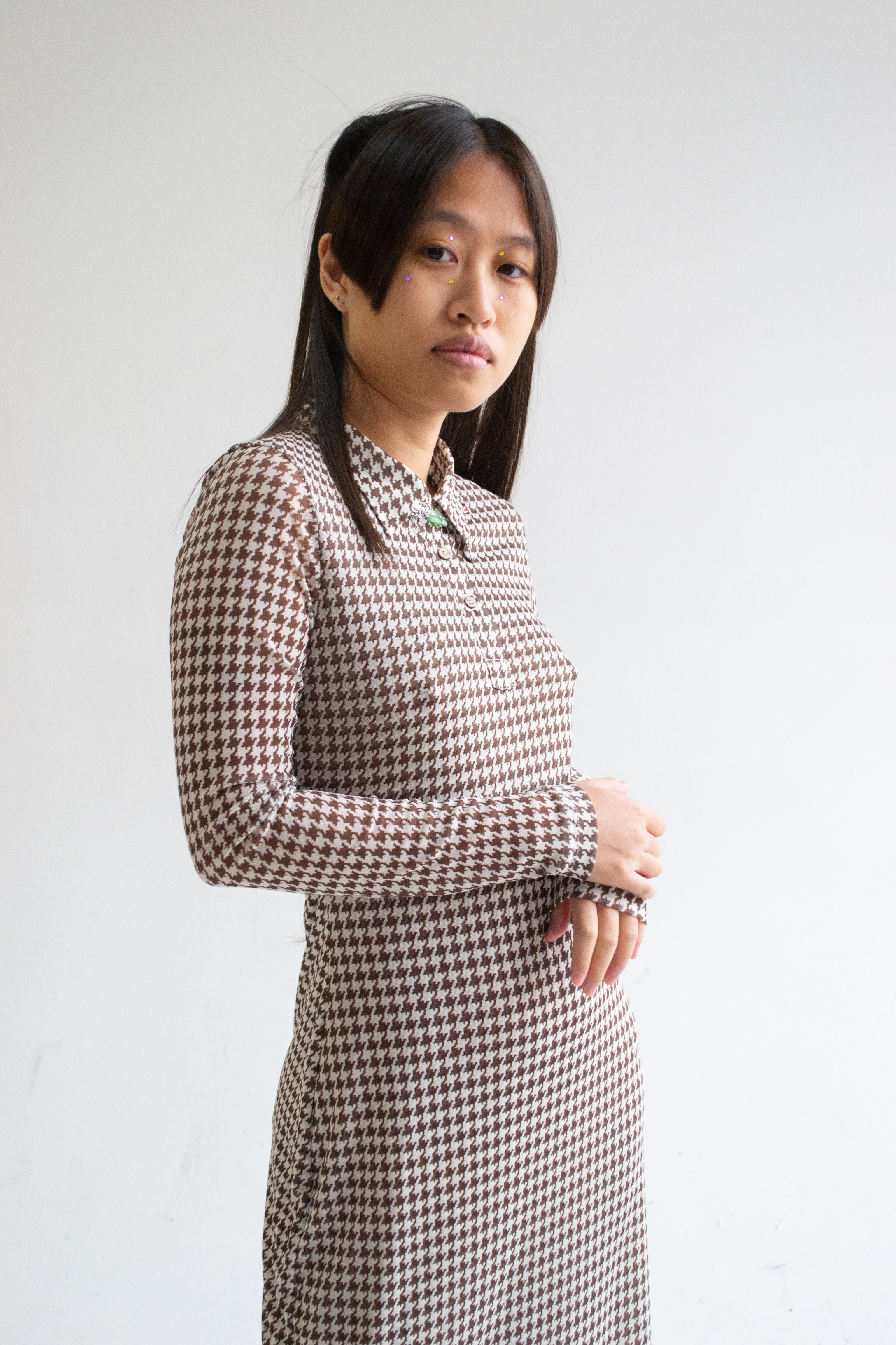 Houndstooth check print mesh midi dress with body hugging fit. Double lined to ensure coverage and a flattering fit. Fits true to size.