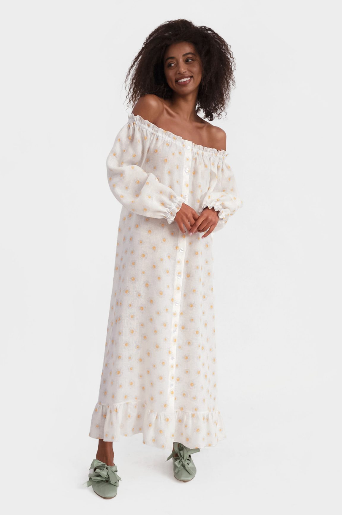 This 100% linen dress is perfect for chilling at home, chucking on with your sandals or styling up for a Summer occasion . The sleeves and neckline are fixed with a soft elastic so you can wear off or on the shoulder, buttoned up or down, or add a belt. The loungewear dress comes in one size, and with it's oversized styling and elasticated neckline, it comfortably fits sizes UK 6 - UK 14.