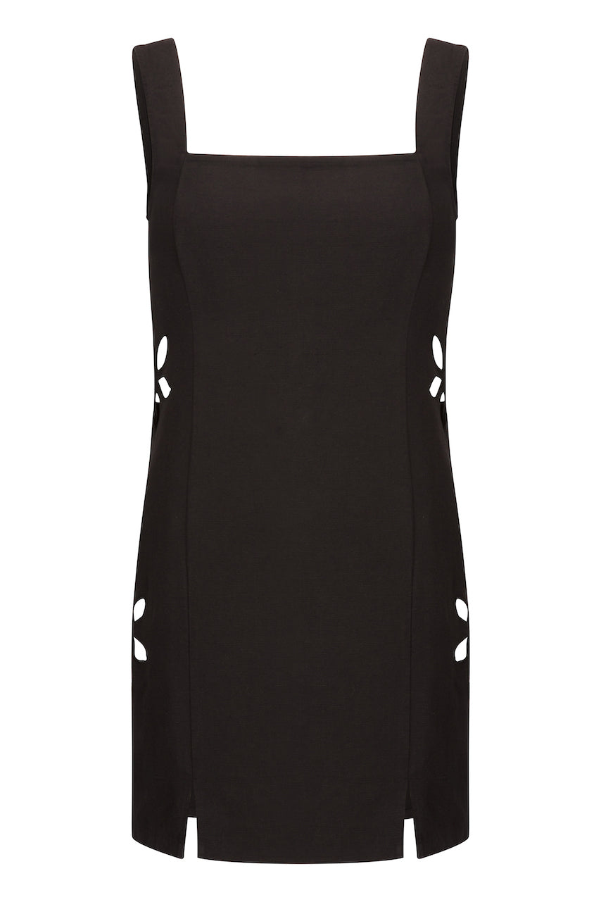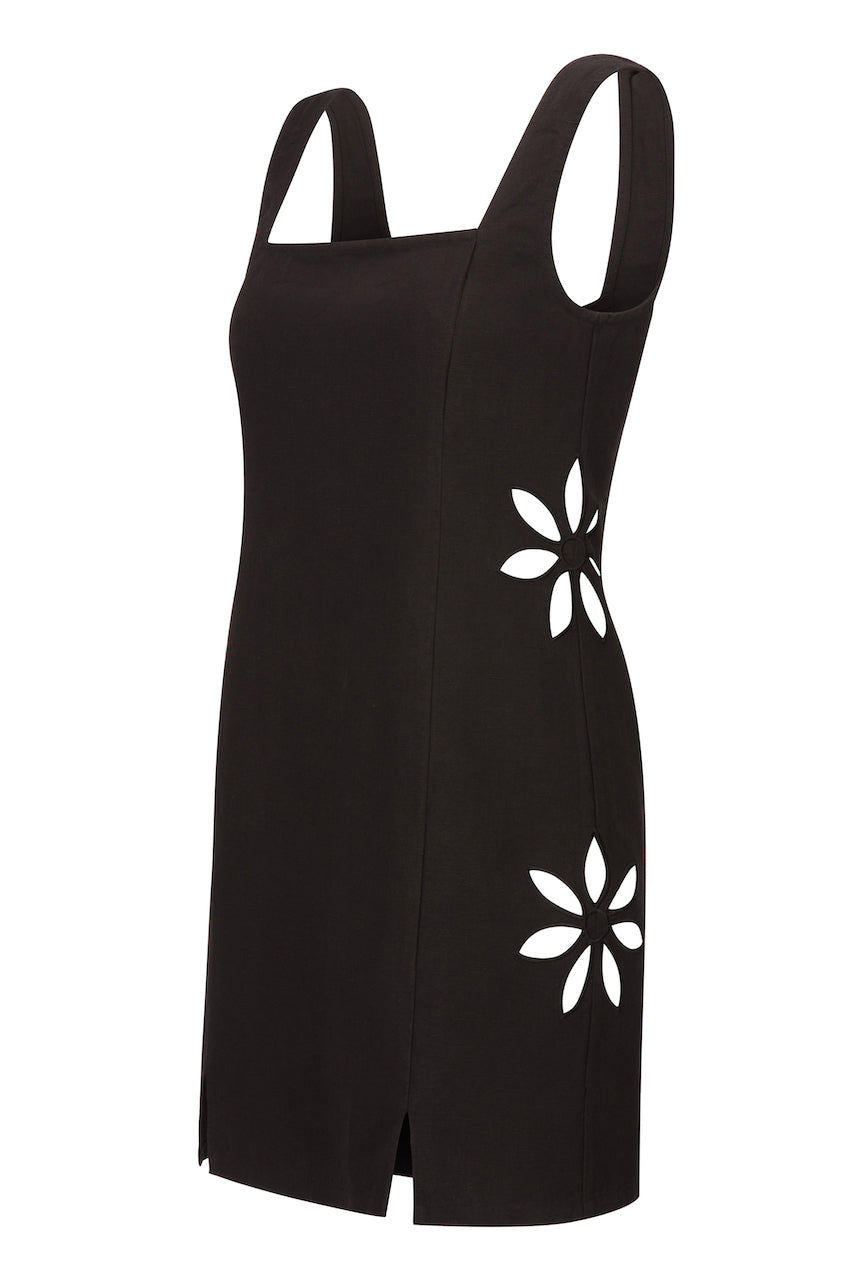 Our favourite Summer dress in Black! Short linen a-line dress with square neckline. This beautiful dress features cheeky embroidered cut out flowers down the each side.