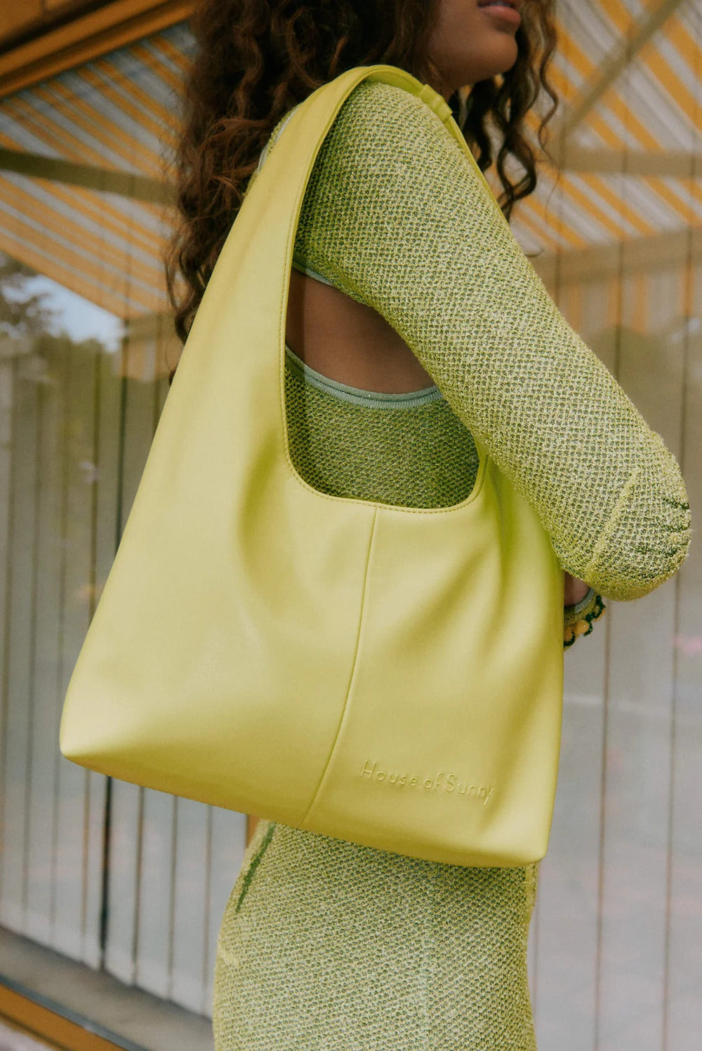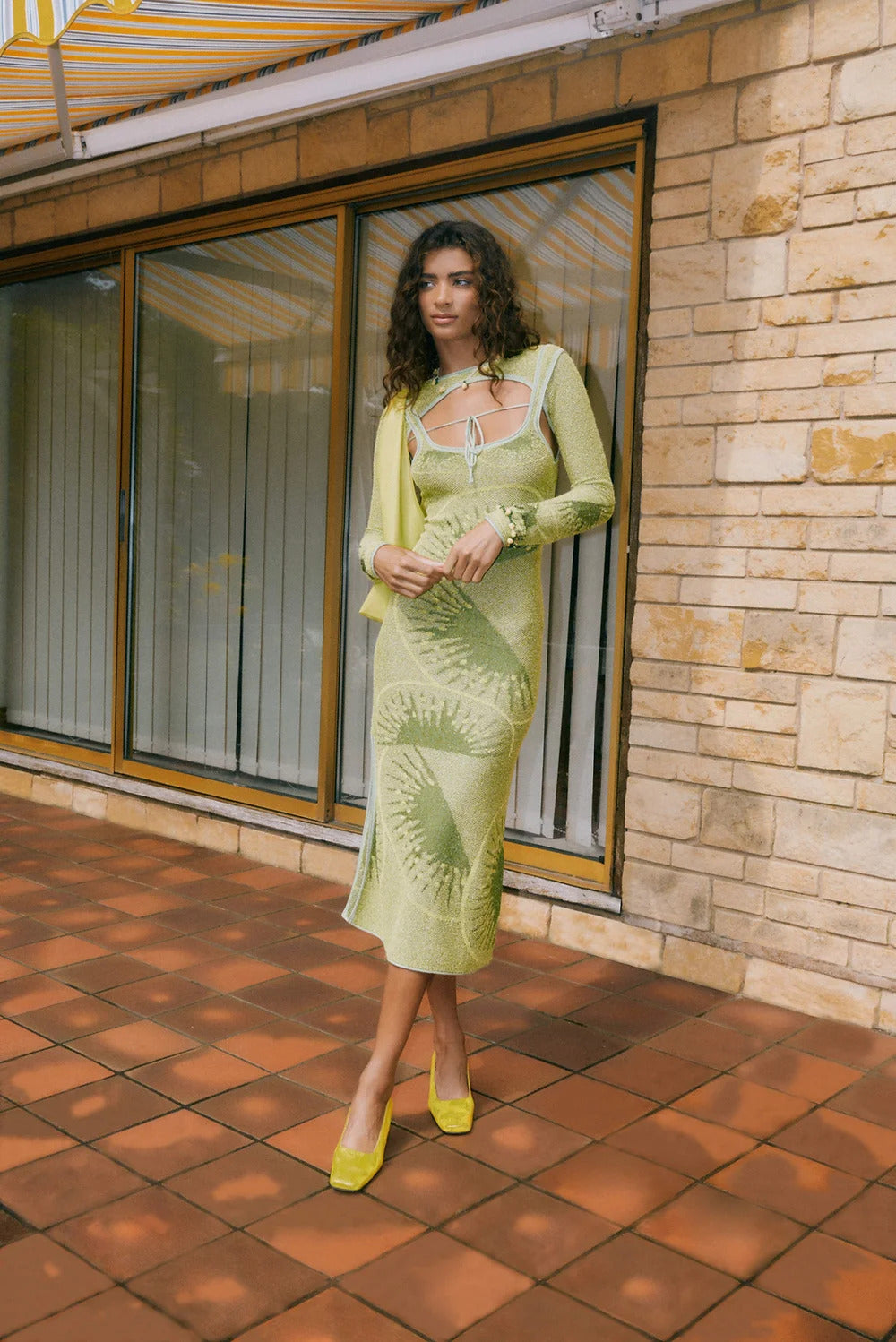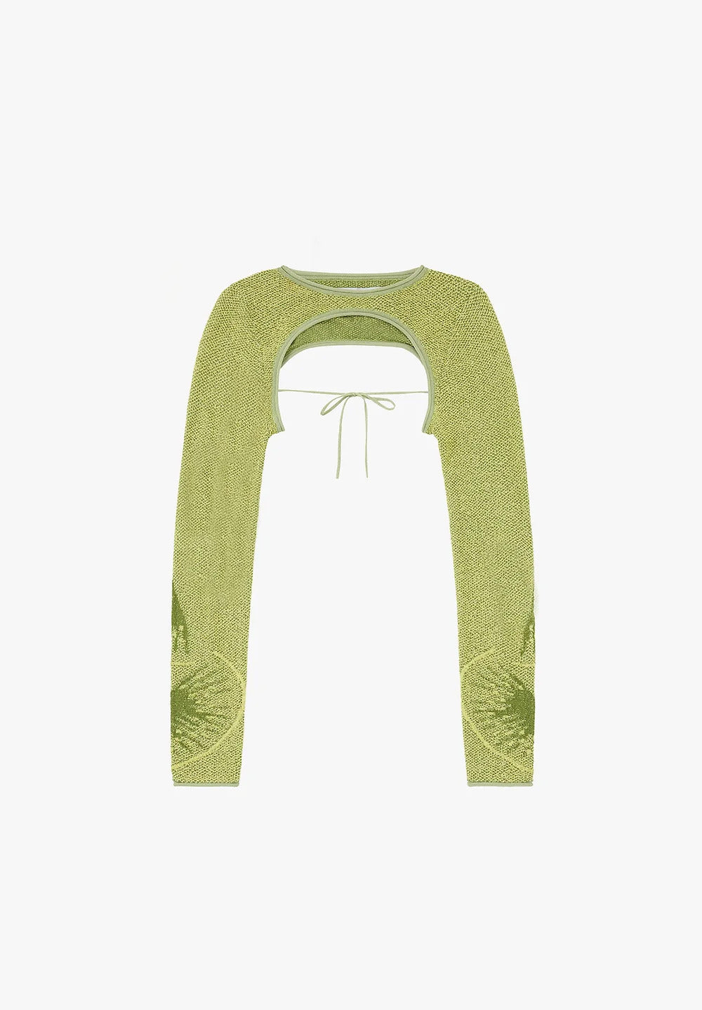 Crafted from vegan and form-fitting yarn, these sleeves feature a kiwi motif in refreshing tones of green, yellow and hints of metallic. A brand new silhouette to the House of Sunny repertoire, these sleeves are the perfect fashion piece to elevate an everyday look. Wear on its own with a relaxed tank top and denim look or style it with our matching Hockney dress to complete the set.