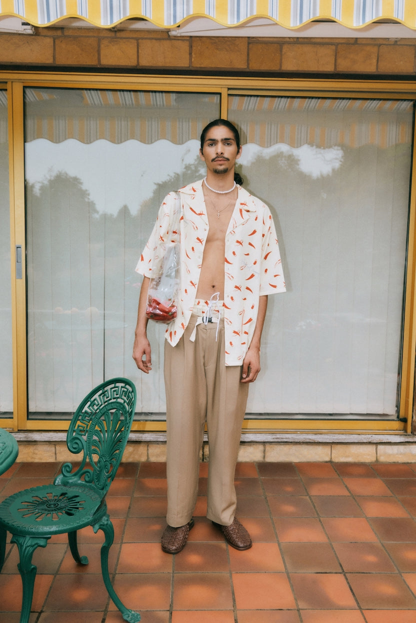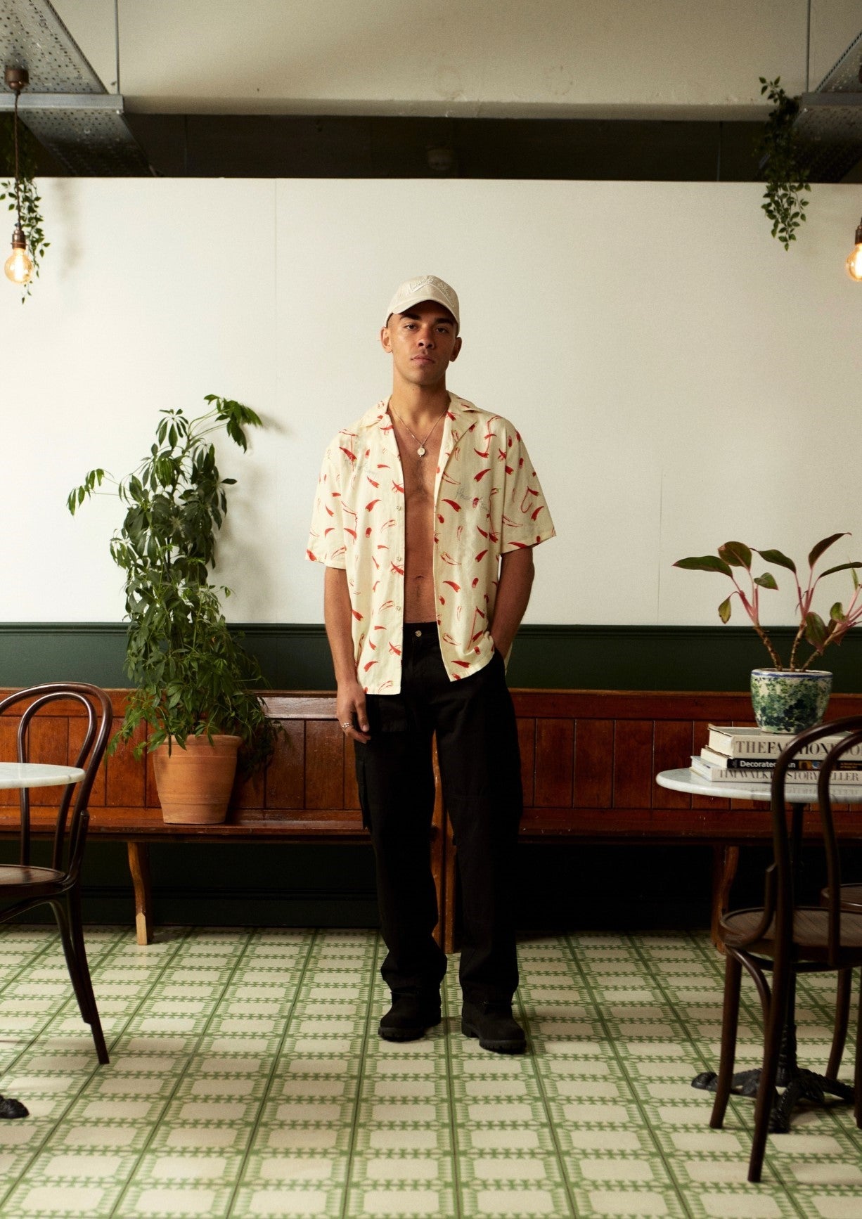 Laid-back and loose, the Signature Chilli Shirt is a short-sleeved number with a playful chillis print, careful placed elements of embroidery against a warm neutral background. It’s crafted from breathable cotton and features an open spread collar for a sunny look.
