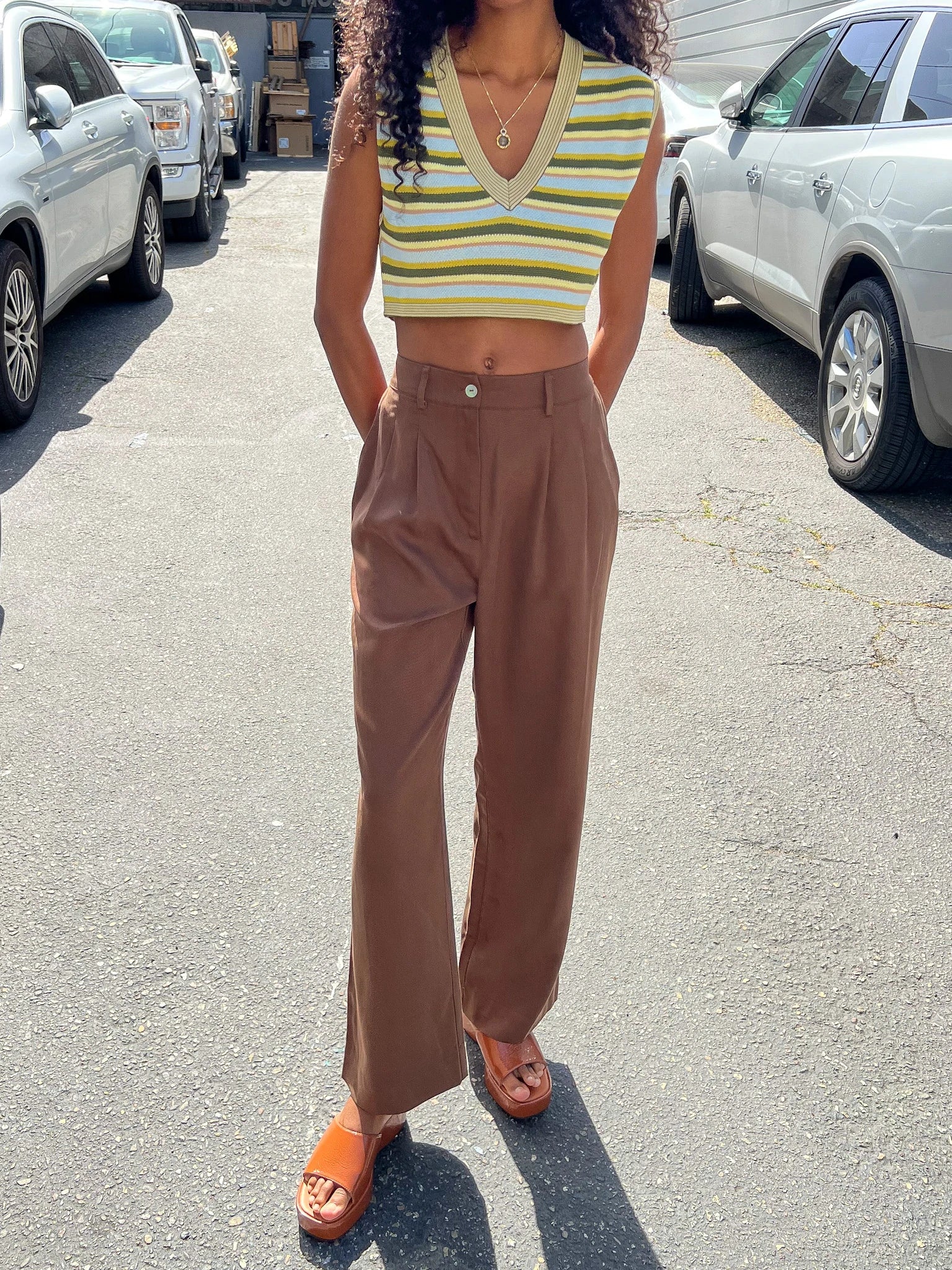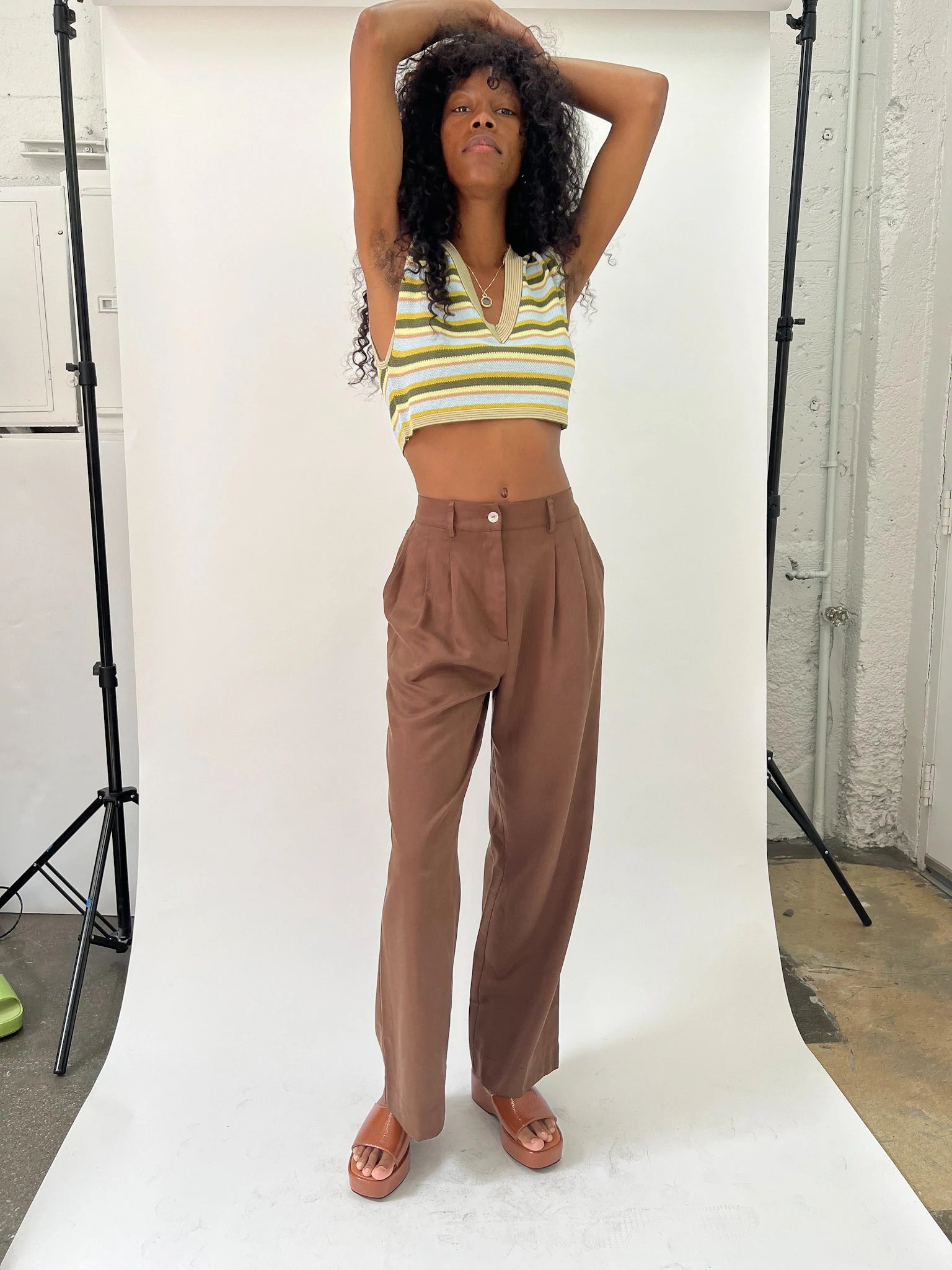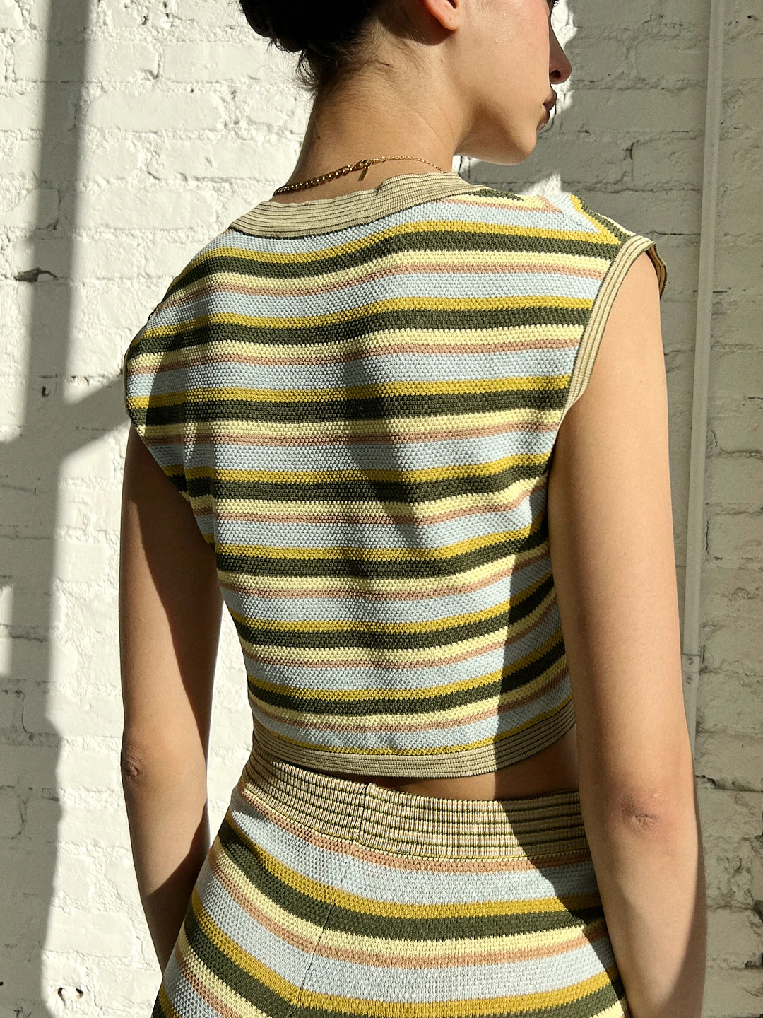 Cropped v-neck sleeveless top in the LSG super luxe Sky Stripe texture knit, featuring light blue, green and yellow hues. Match with the Luca pant which you can find here.