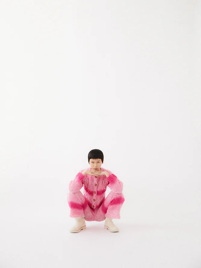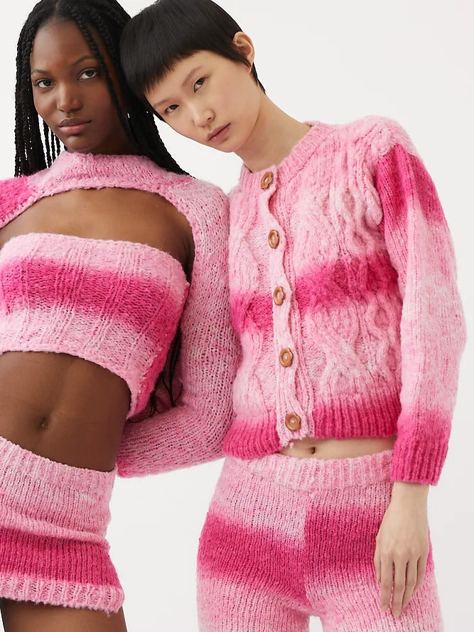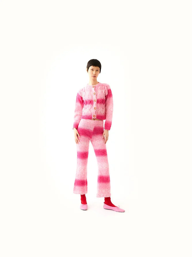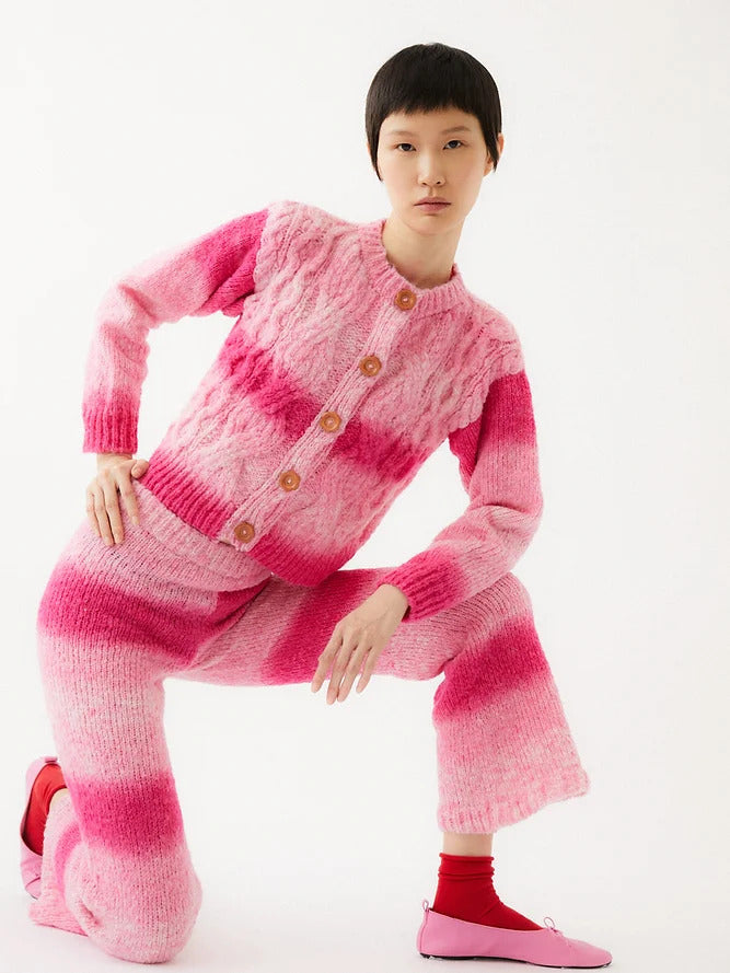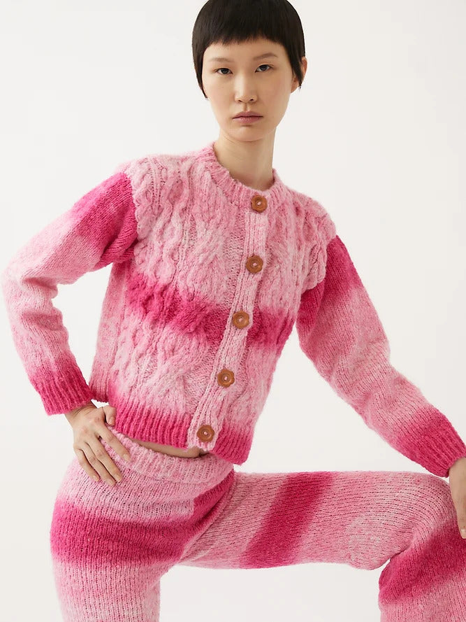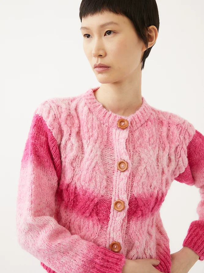 Tonal pink knitted cable cardigan. Wooden button closure. Crew neckline.