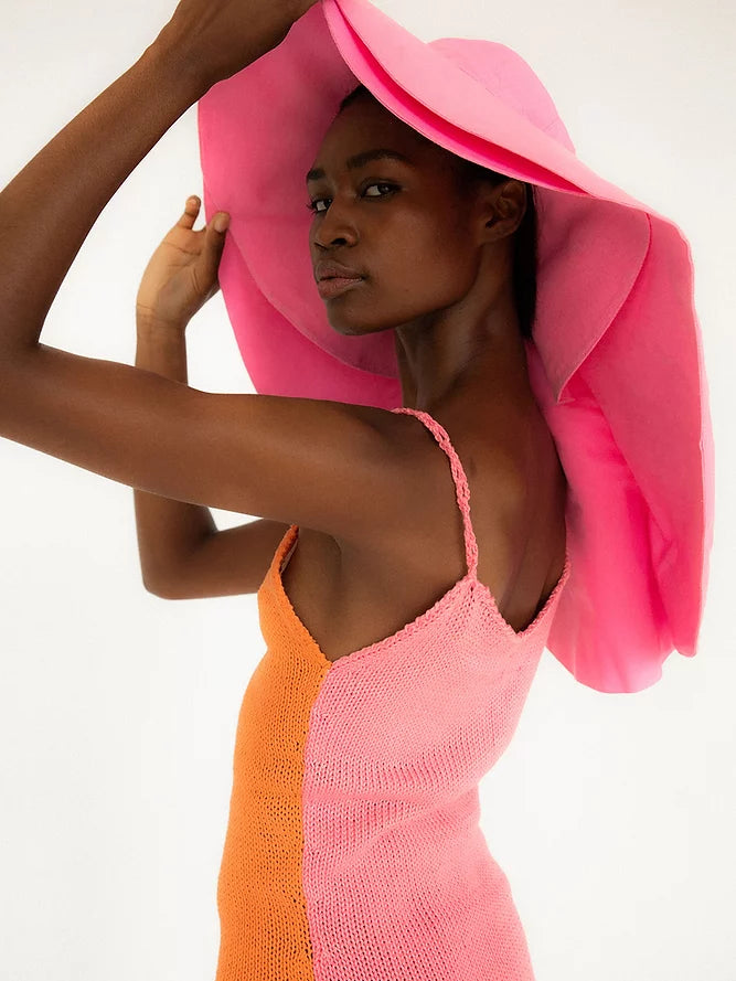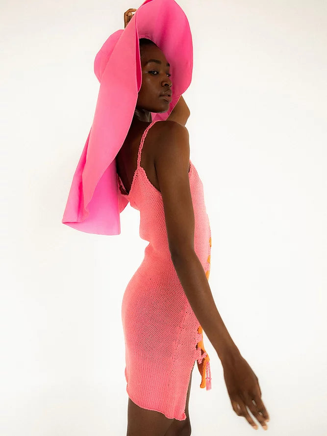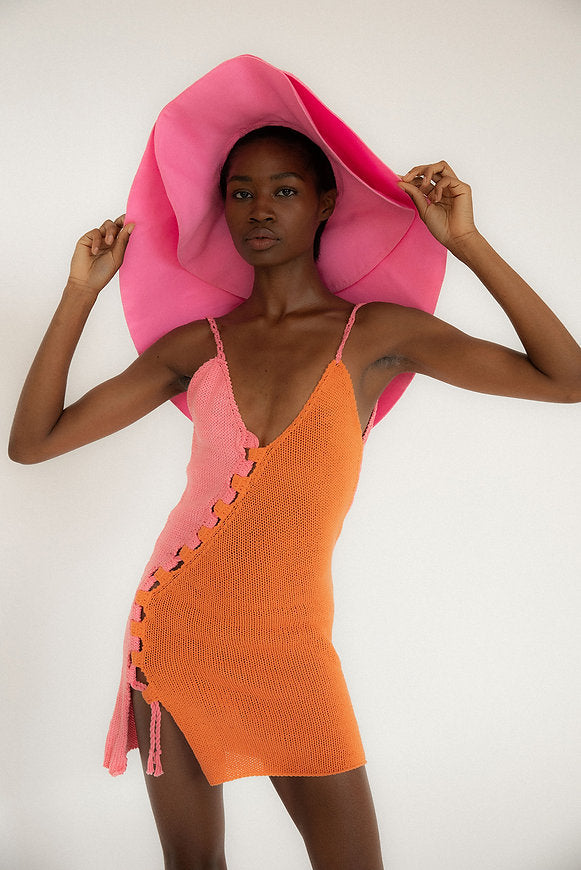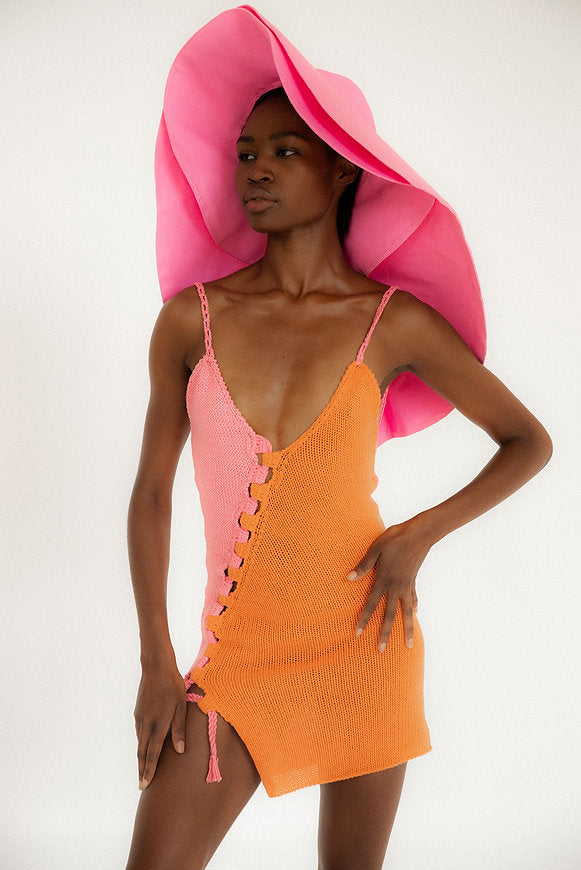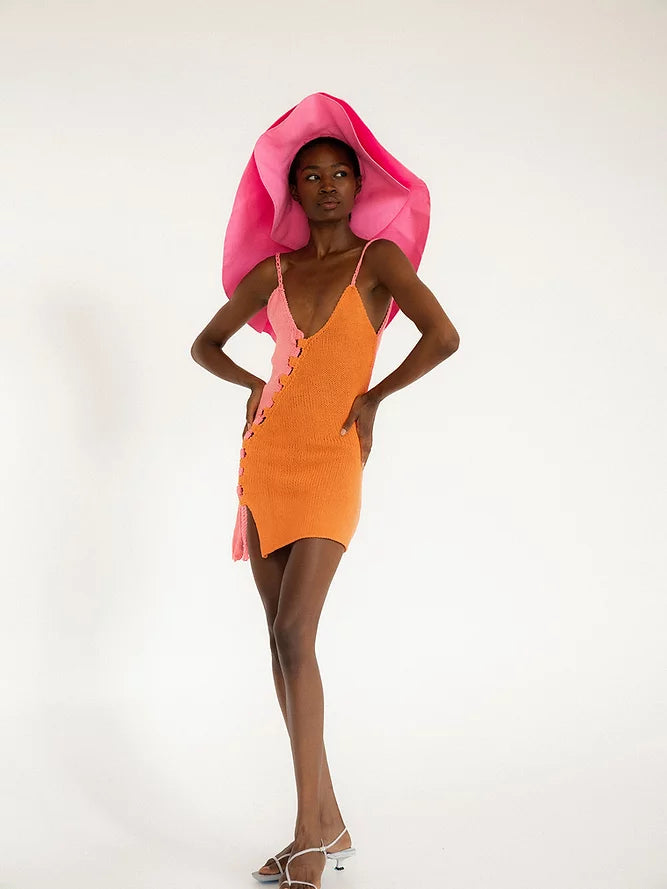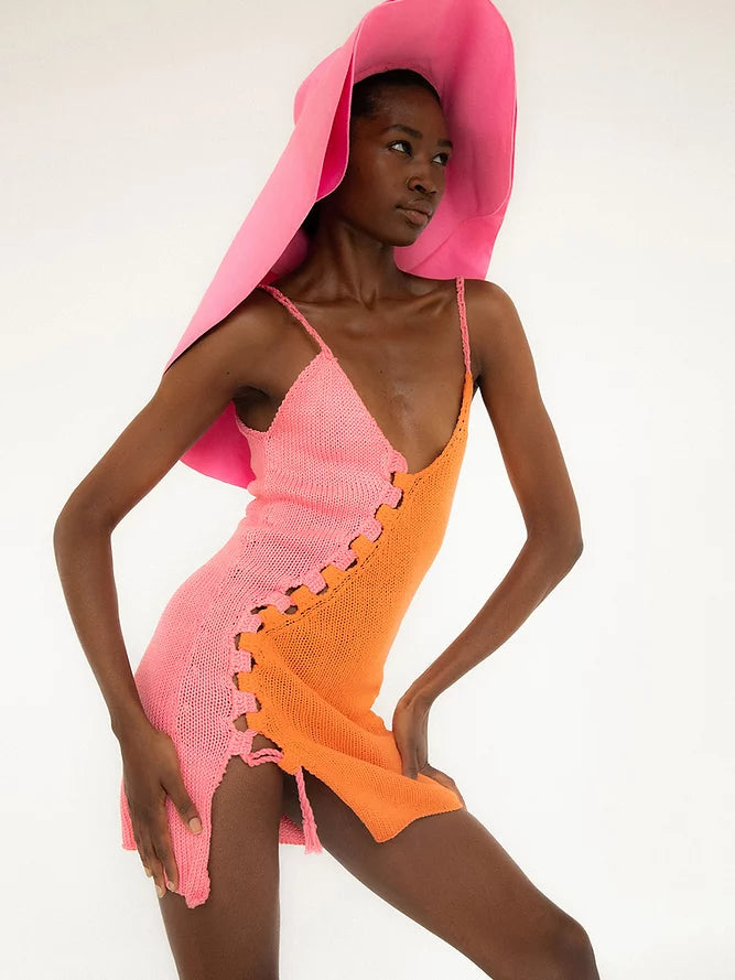 Knitted lace-up orange and pink colour block mini dress by Tach. Super flattering asymmetric tie detail which ties just on your thigh. Cami straps and v-neck. Perfect for your Summer holiday.