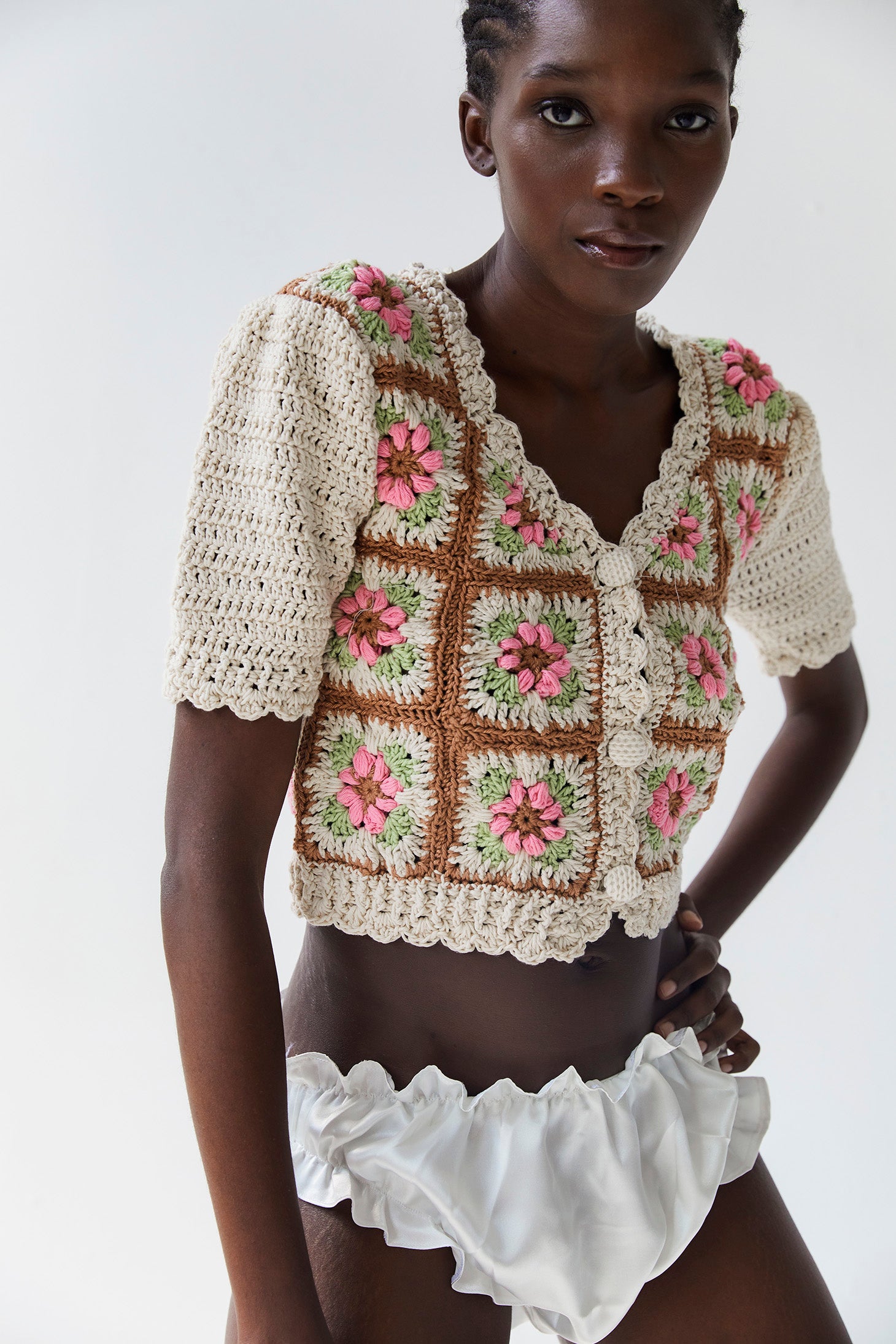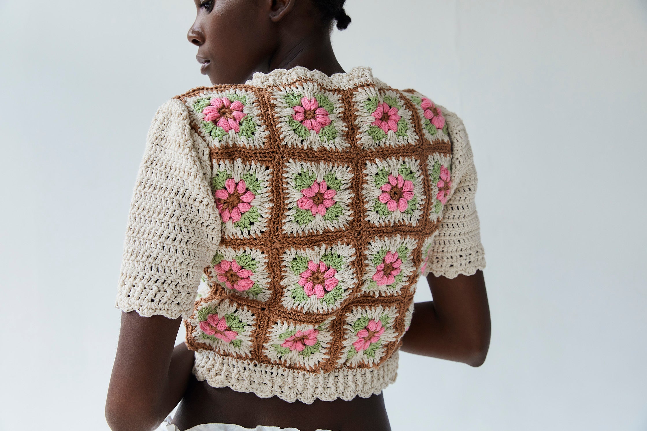 A hand-knitted crochet cardigan by Tach Clothing. NURIA features a floral pattern, crocheted in the most perfect colour palette.