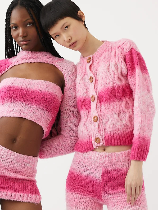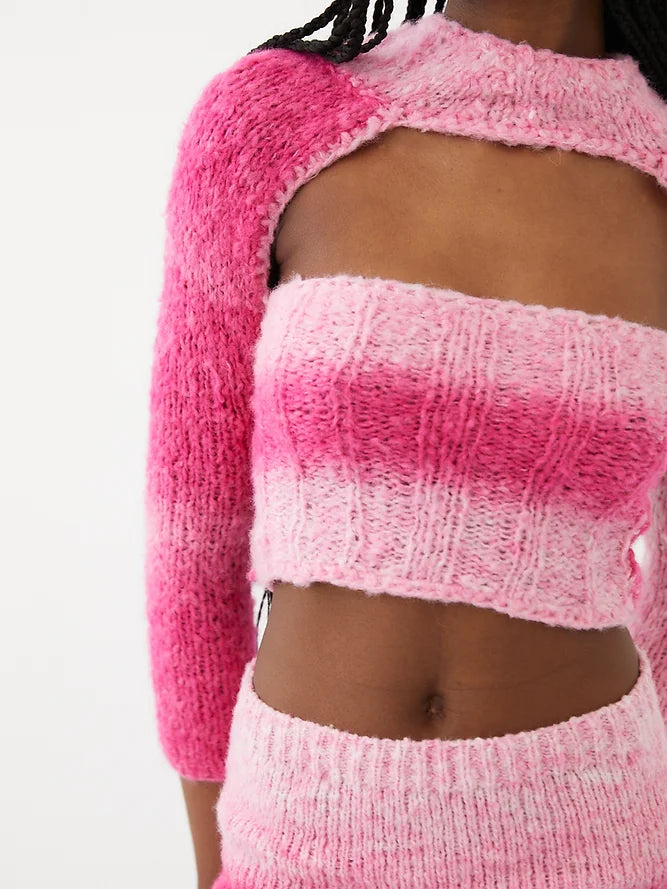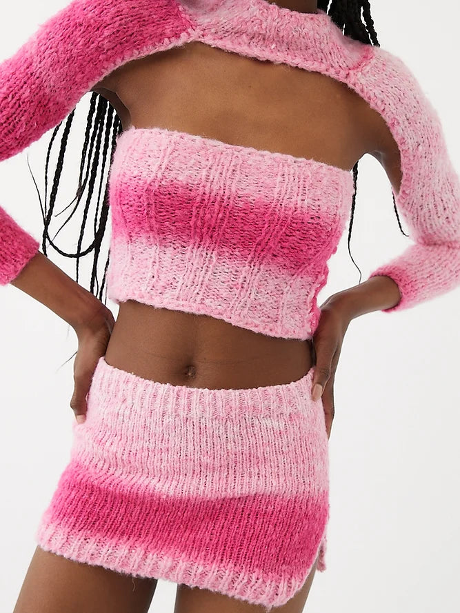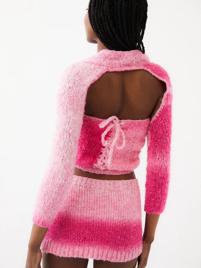 Tonal pink knitted top & sleeves set. Features adjustable tie at back of top.