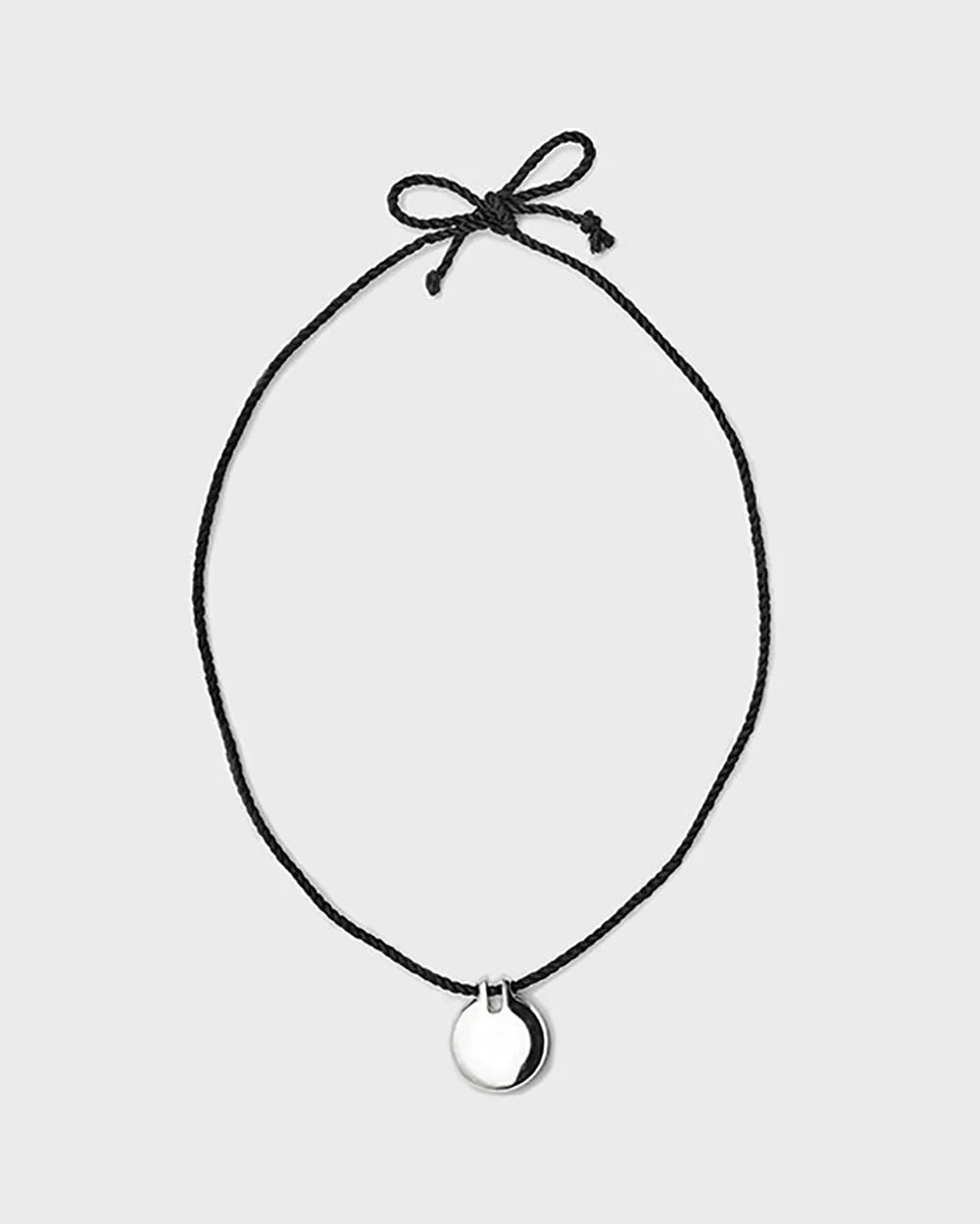 Sterling silver pendant held by 27" silk twine. Inspired by modernist sculptural silver and the sensuality of the material. The classic round shape invites touch with its smooth, curving surfaces.