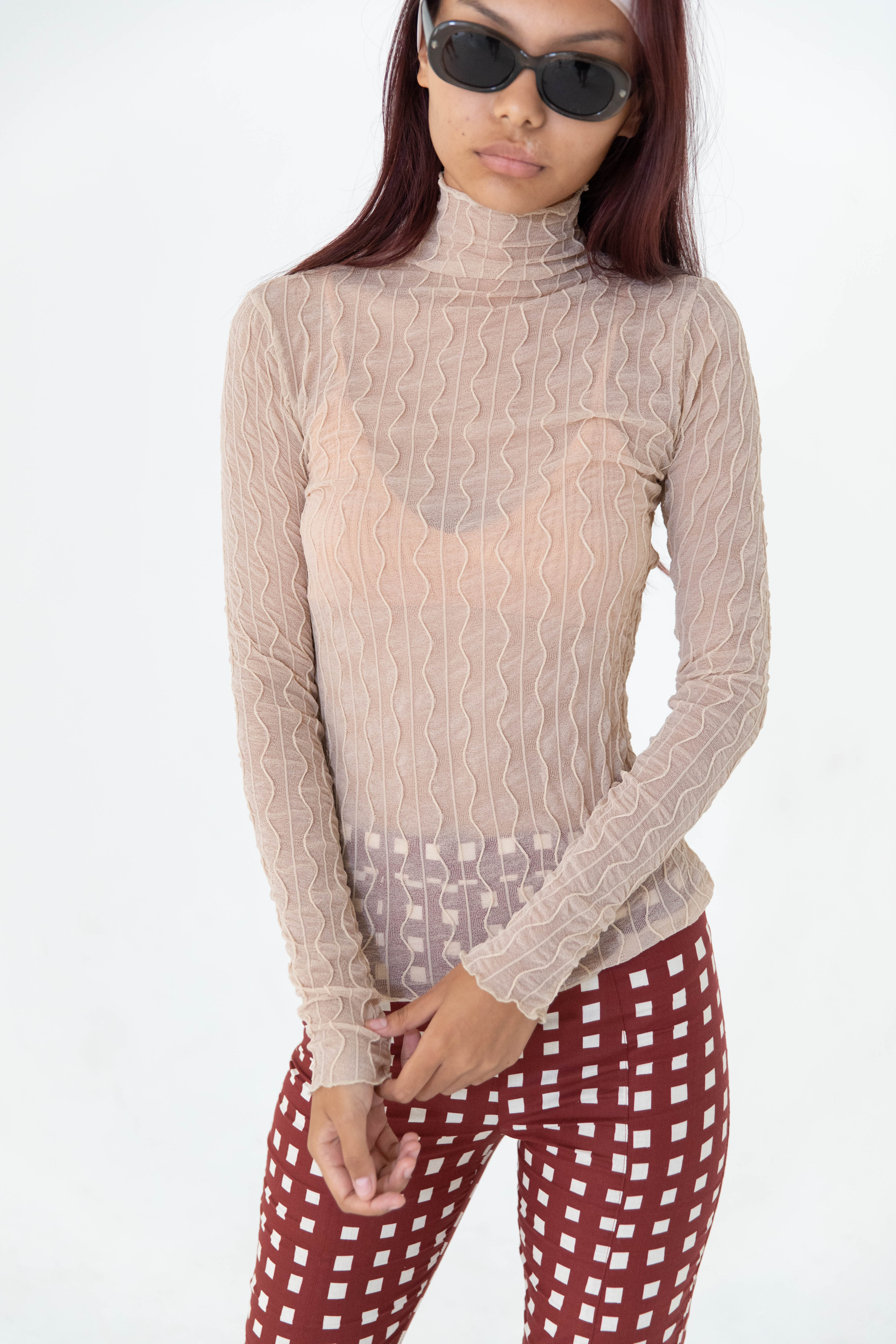 Super versatile mesh top, made for layering over or under. Wear over a cute knit bra or under your favourite sweater for added warmth. Mock neck with stretchy body and smocking throughout.