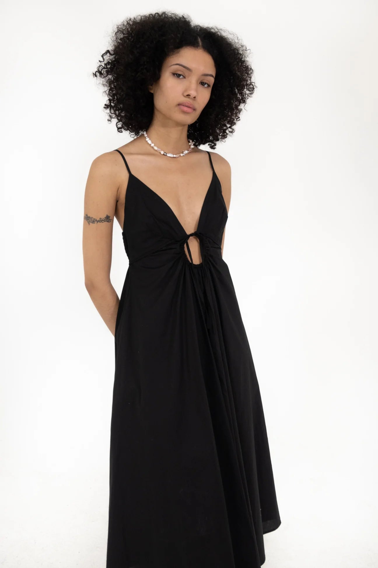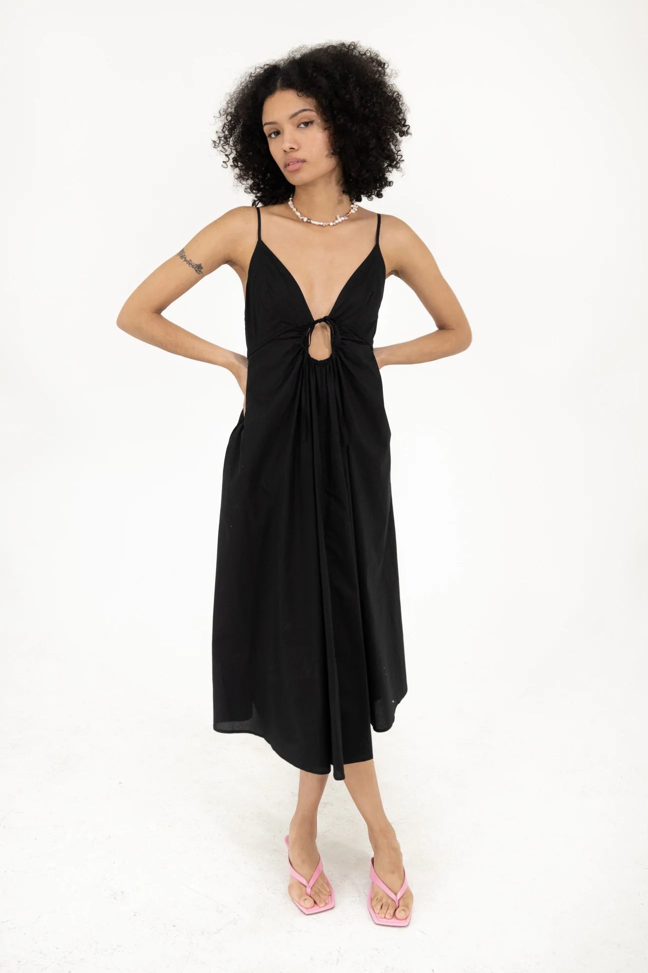 The Sonatina midi dress is light and airy, with front ties and midriff peekaboo cuts. Smocking at the back for the perfect fit and hidden pockets at the side. Take this baby on holiday for day or night dressing. A chic dress for special occasions too!
