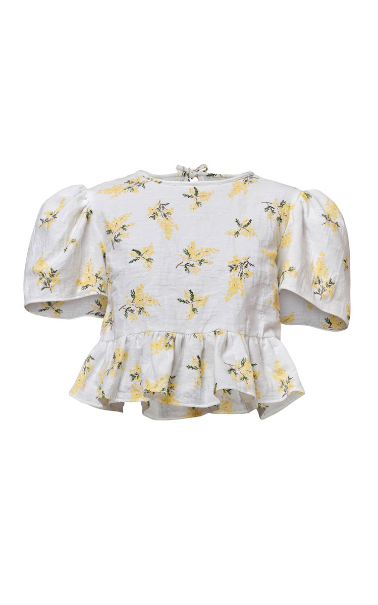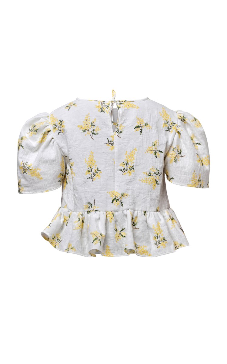 The Anna blouse is a cotton jacquard printed top with peplum frill hem. It has beautiful volume sleeves and ties at the back neck for the wearer to slip on. We also have the matching Zena skirt, a gorgeous head to toe look and perfect for a wedding guest.