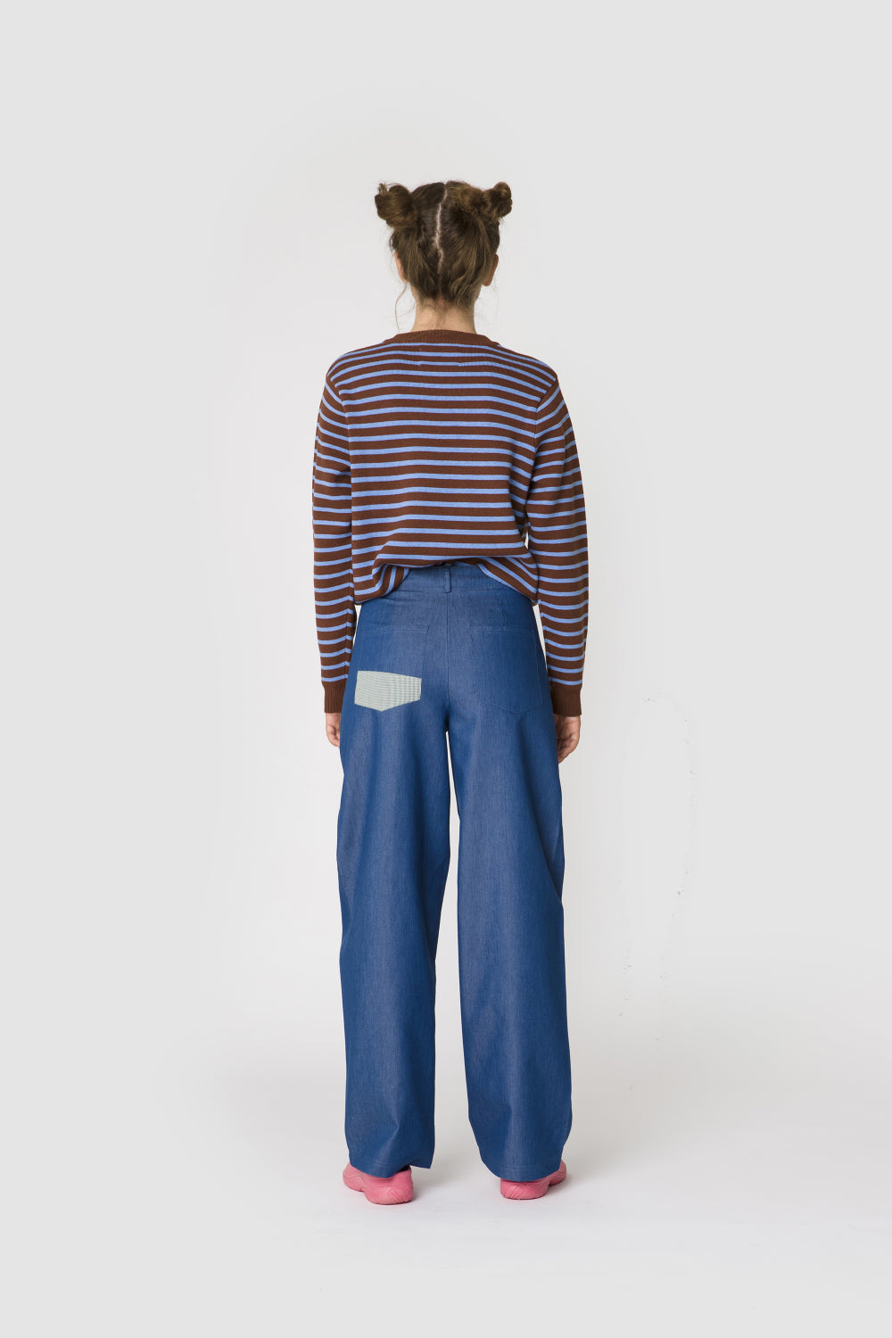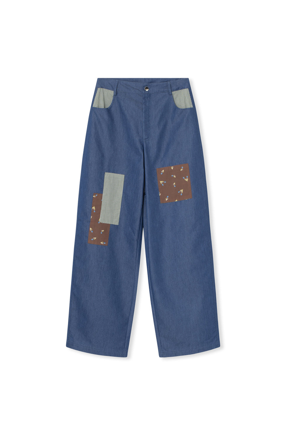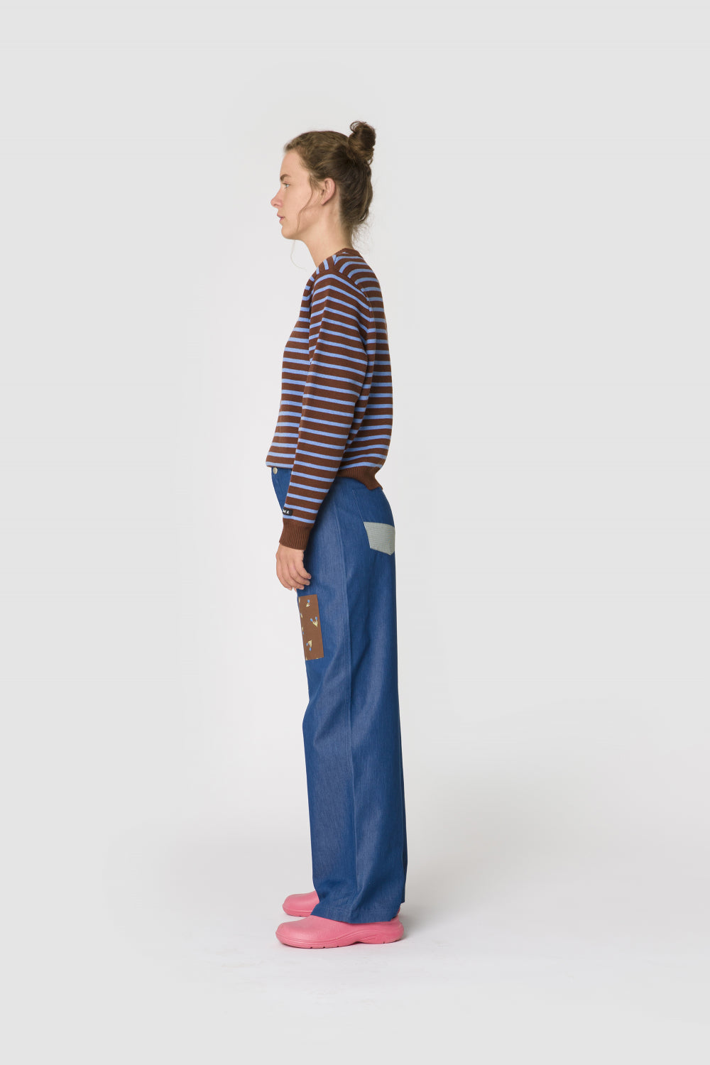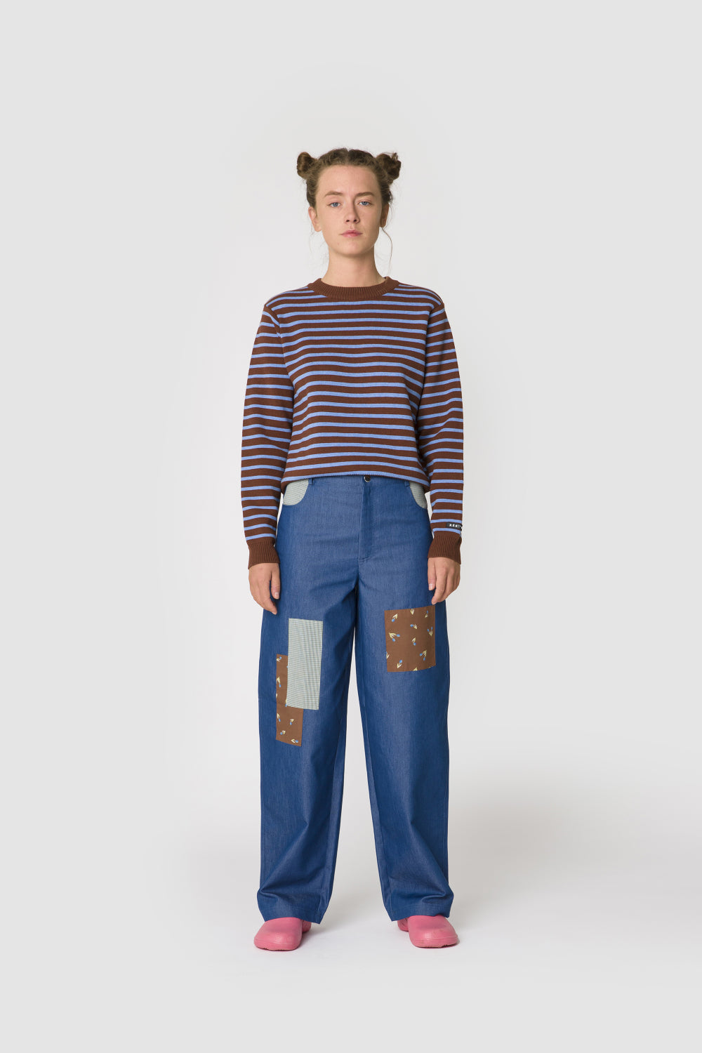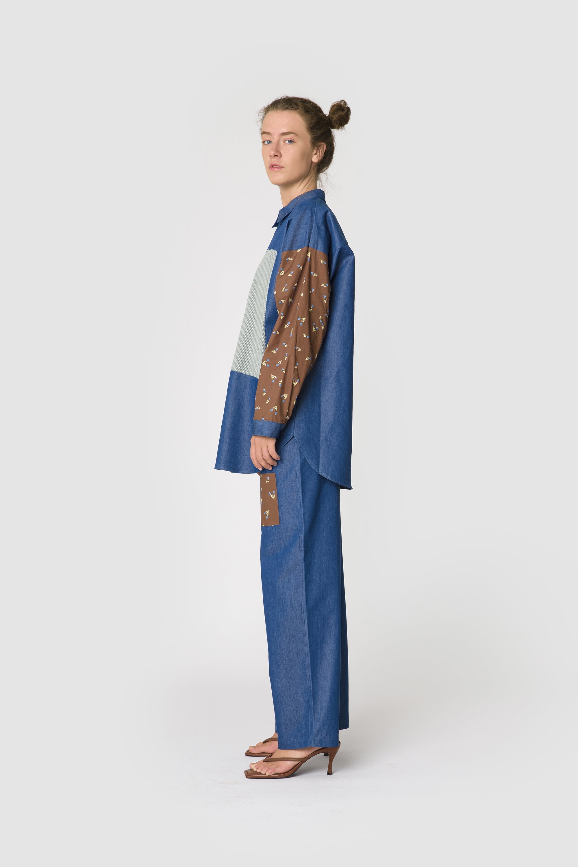 JadaRS Pant by Resume Copenhagen. High waist relaxed wide leg fit and a medium denim wash. Brown floral print and patchwork details. Wear it with the Jackie Shirt, found here, for a head to toe look.