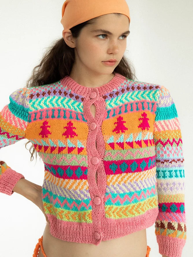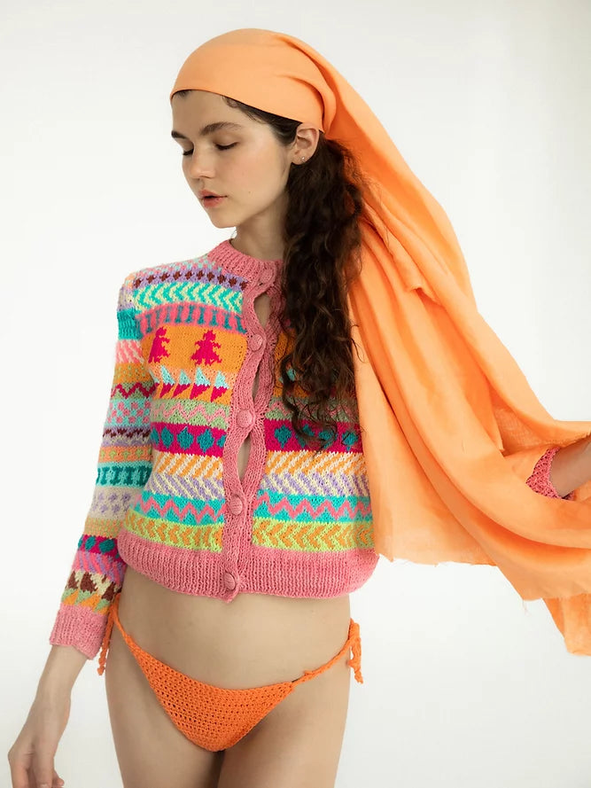 New colours on everyone’s favourite cardigan, but this one comes in a lighter weight cotton knit for Summer. The Anais cardigan by Tach Clothing is hand-knitted in Uruguay. This joyful and nostalgic knitwear design is a slightly cropped fit with bracelet length sleeves.