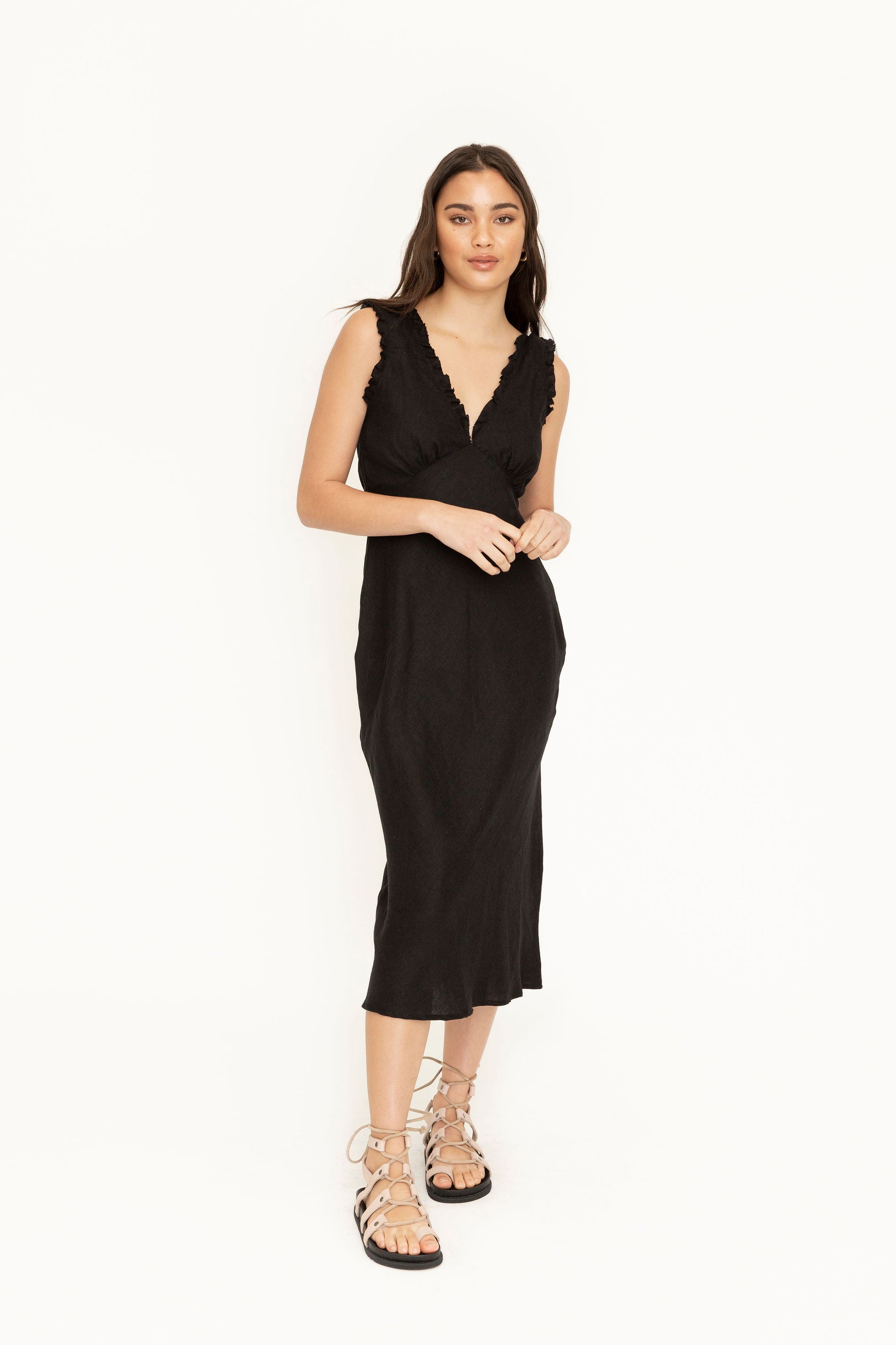 Everyone needs a cute black summer staple. The Ricci dress is a bias cut slip dress made in 100% Linen. V-neck front and back with a subtle gathered ruffle trim. Cut on the bias for a chic fit, and hidden side zip.