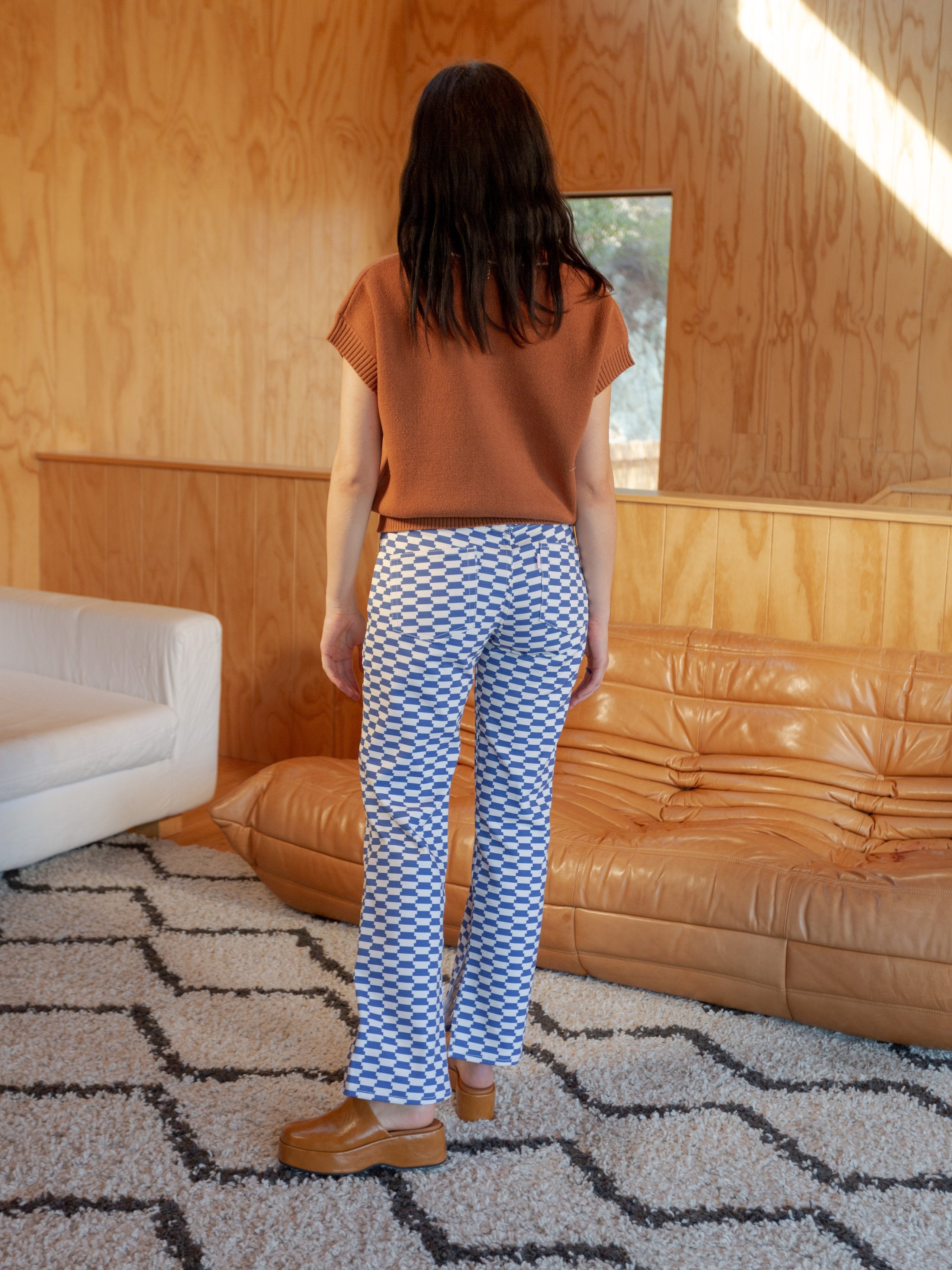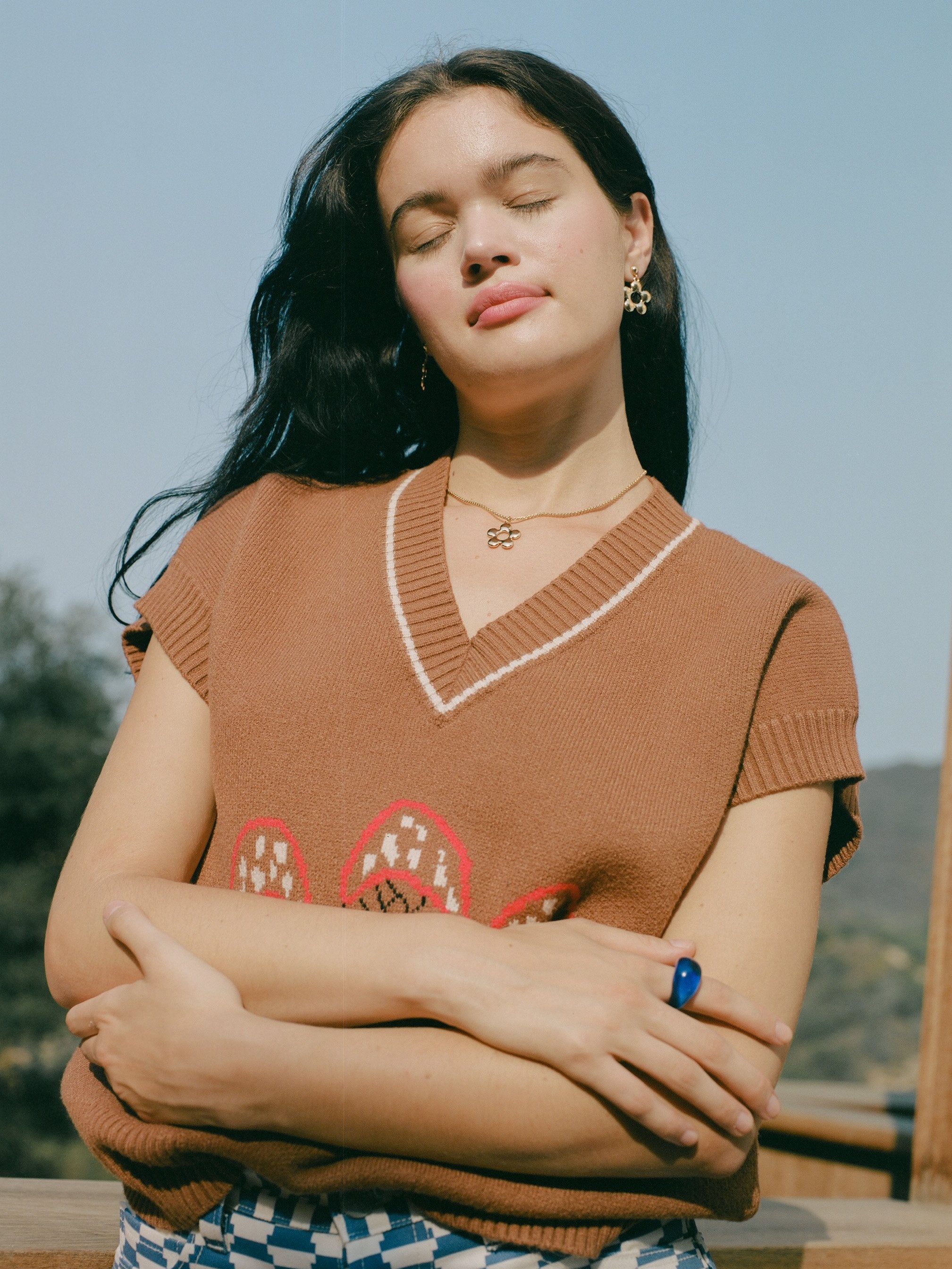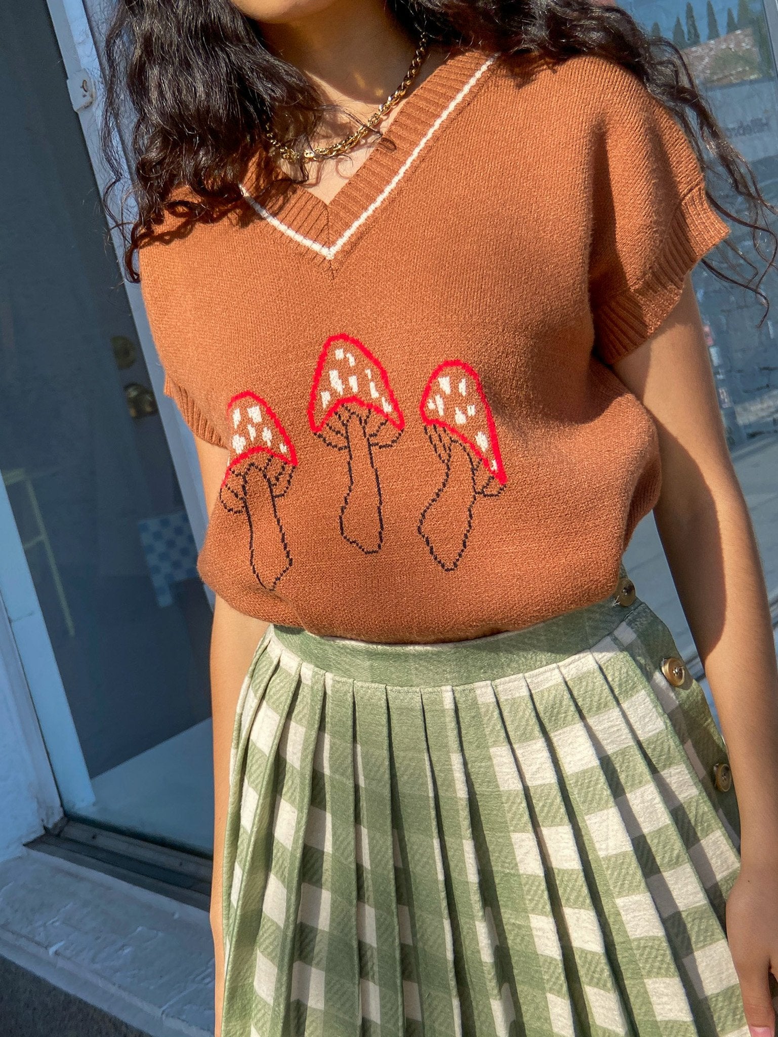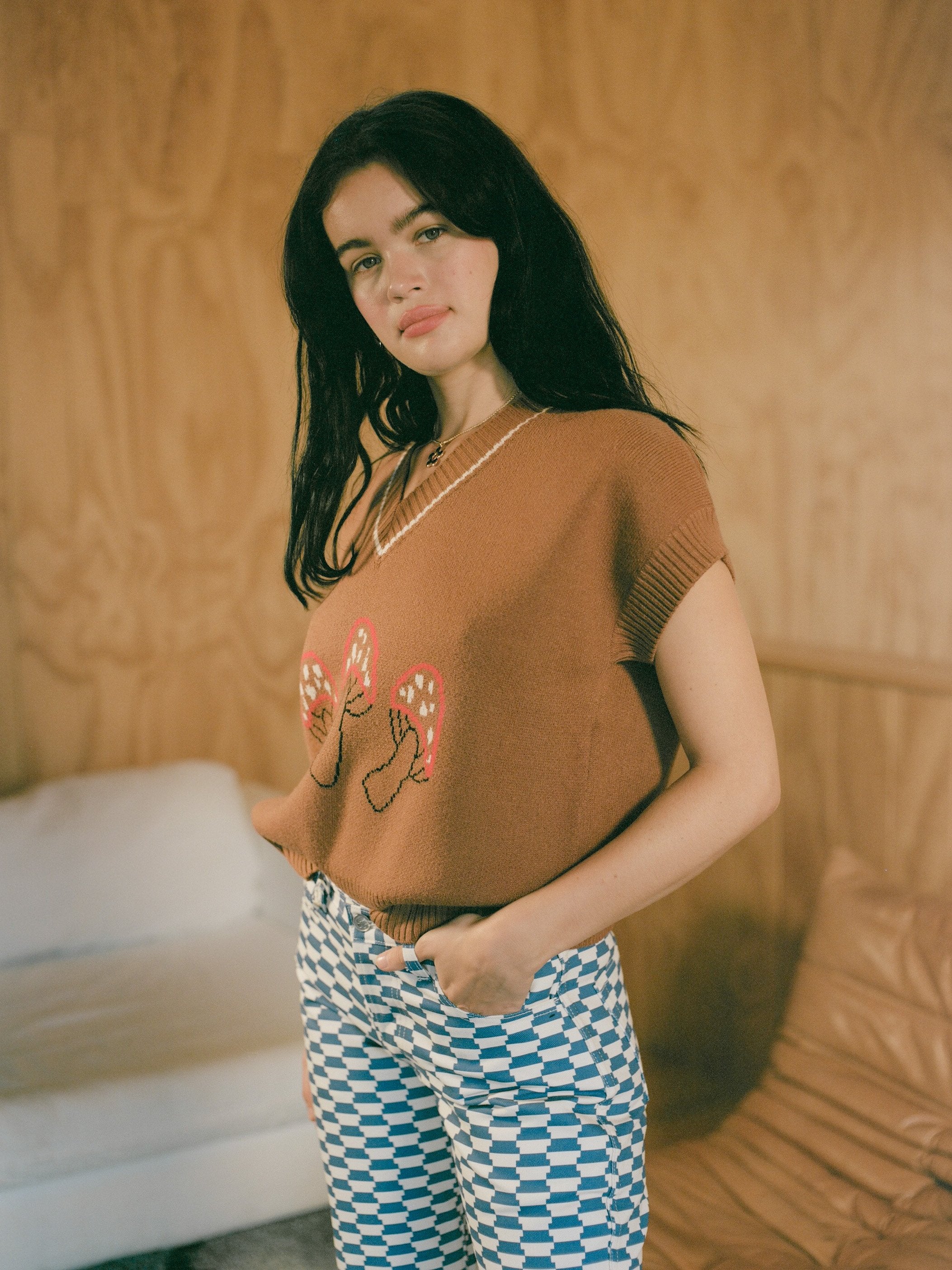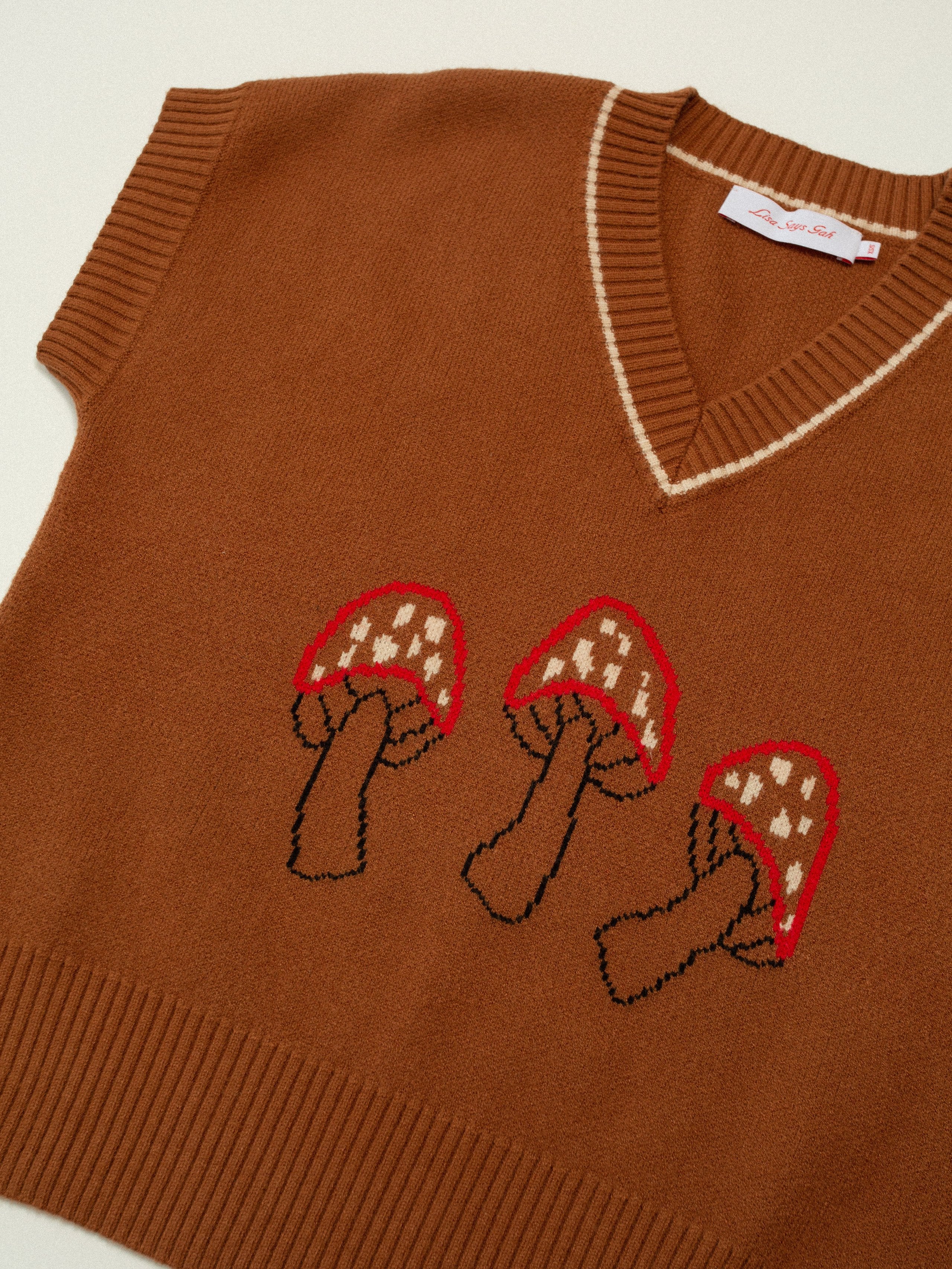 The Fangio Vest, an oversized v-neck sweater vest in a camel brown with a custom mushroom graphic print. Super soft and not itchy!