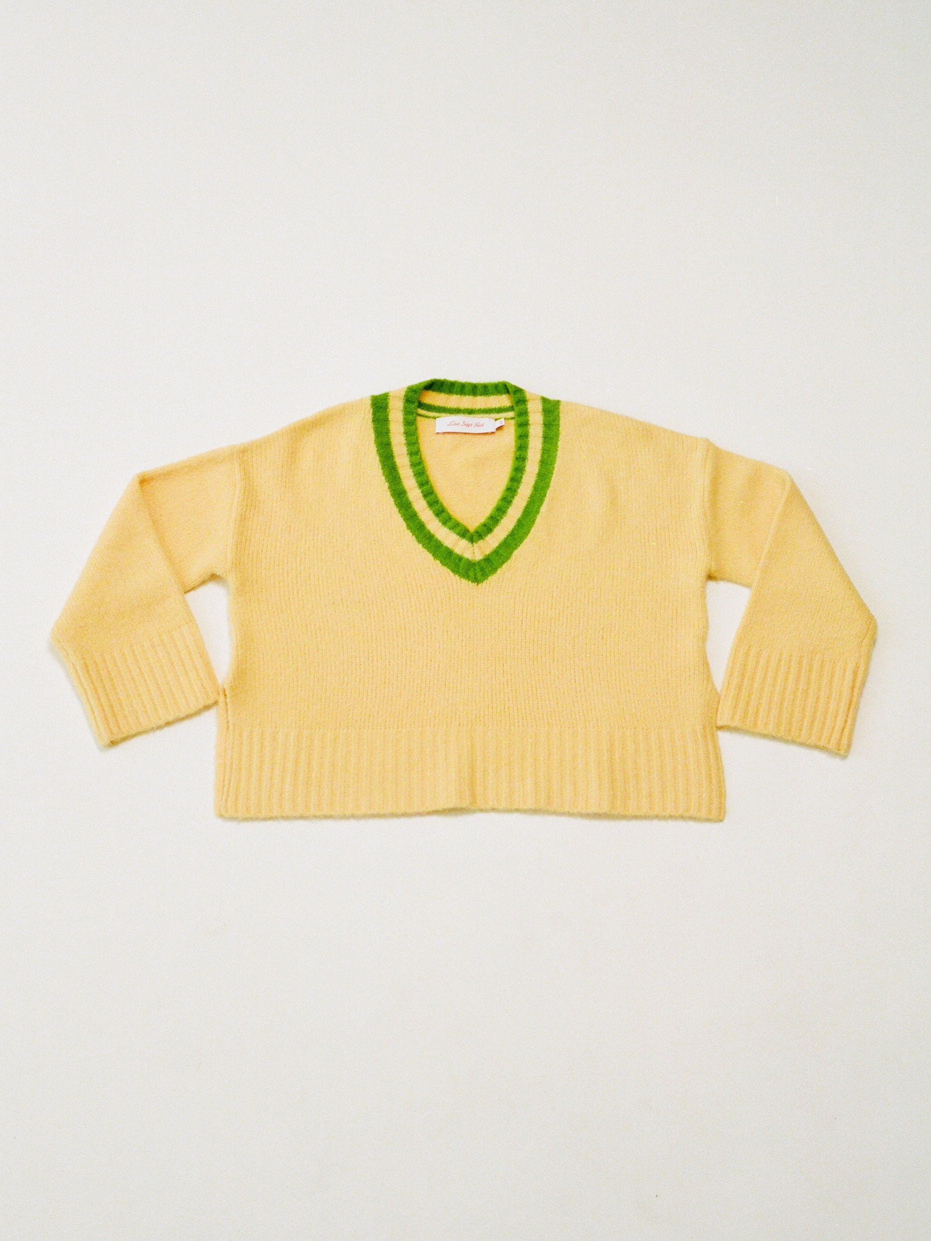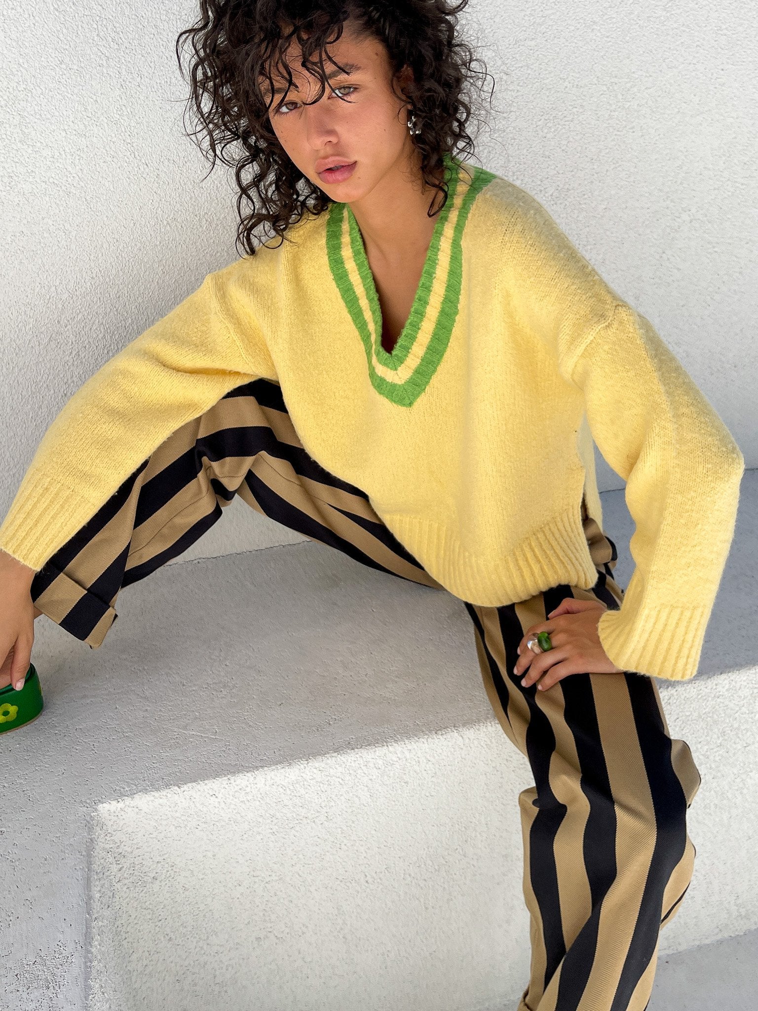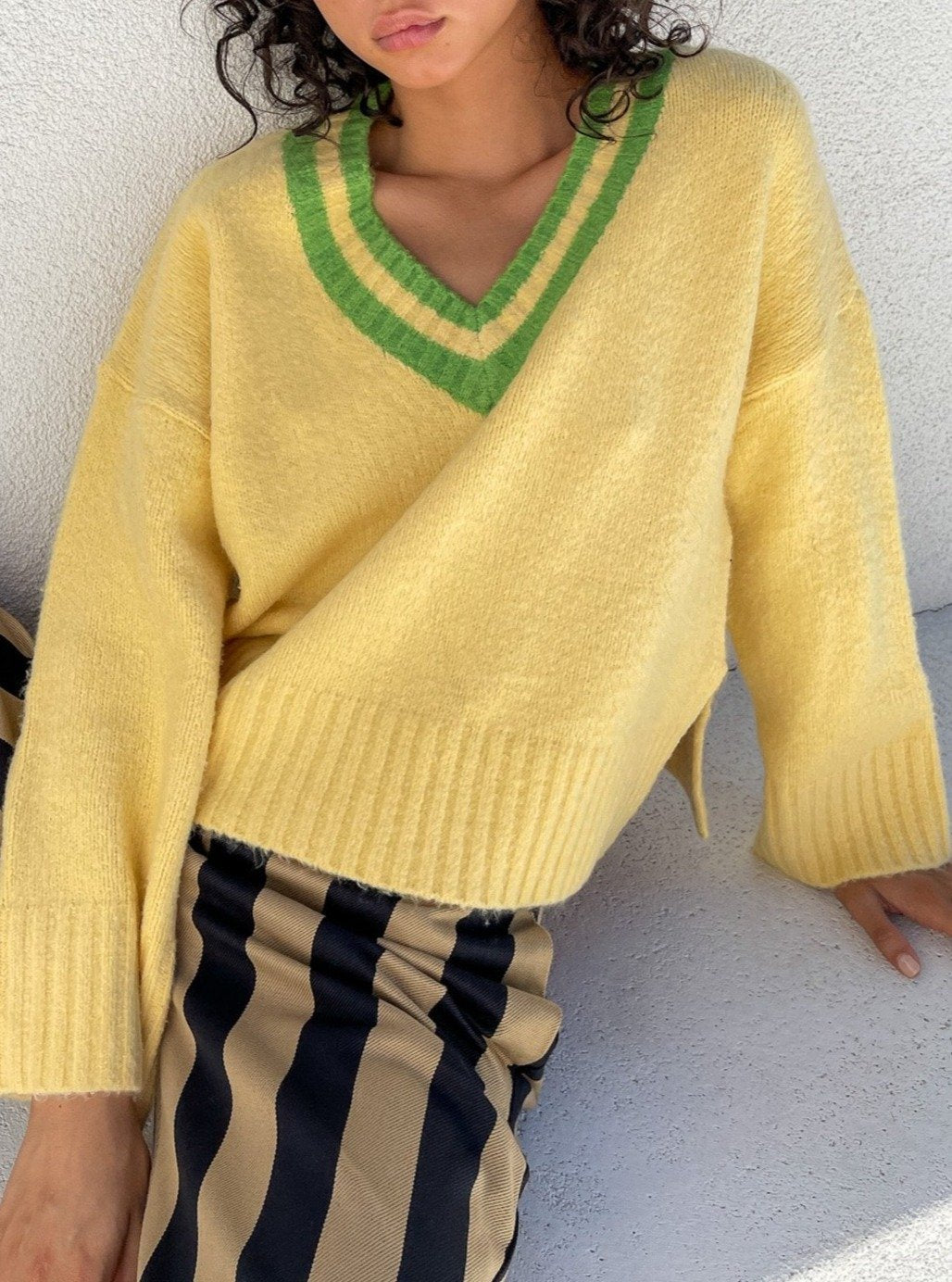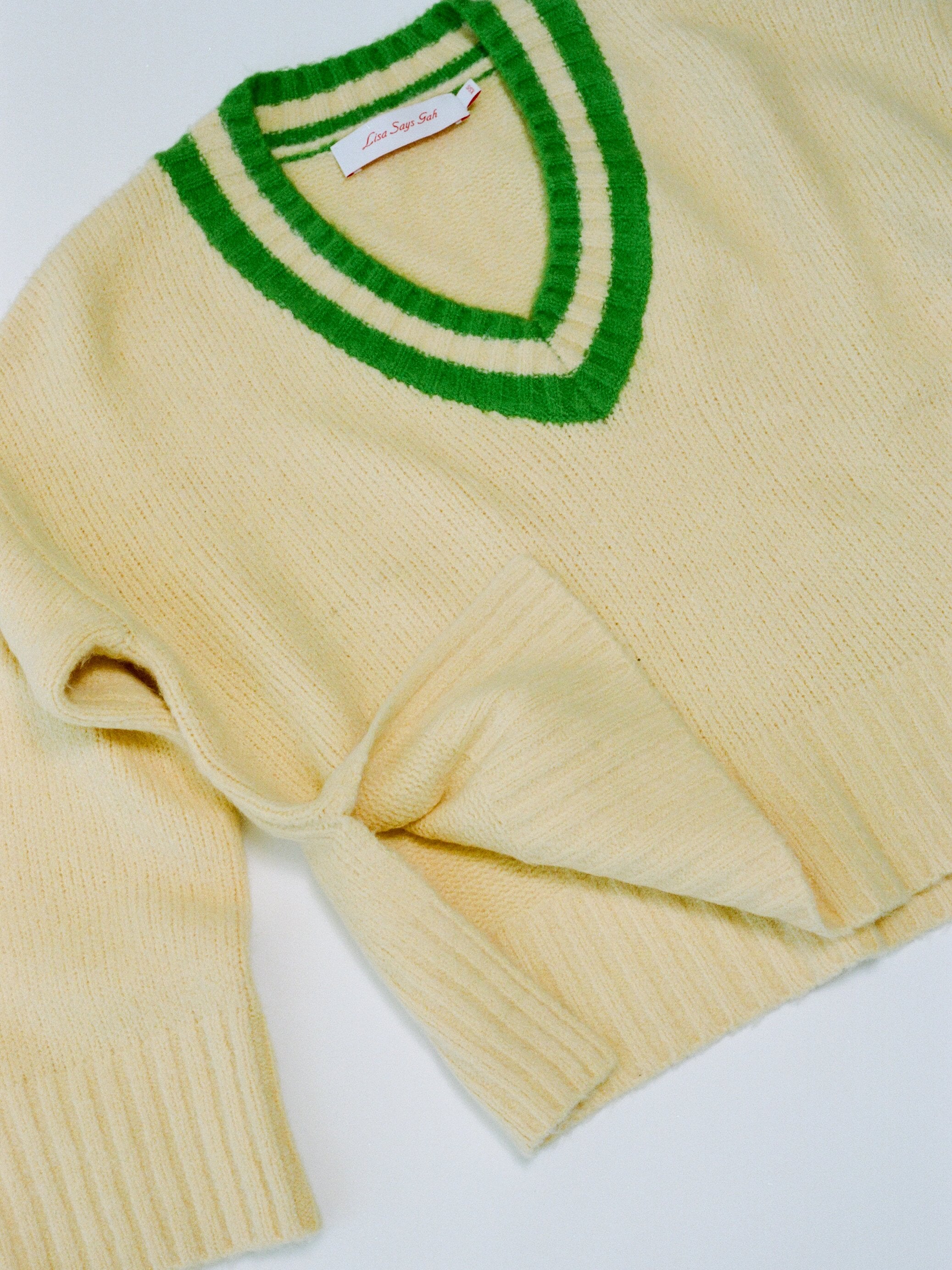 This buttery HELENA knit is a super soft, not itchy collegiate-inspired v-neck sweater featuring a green varsity stripe.