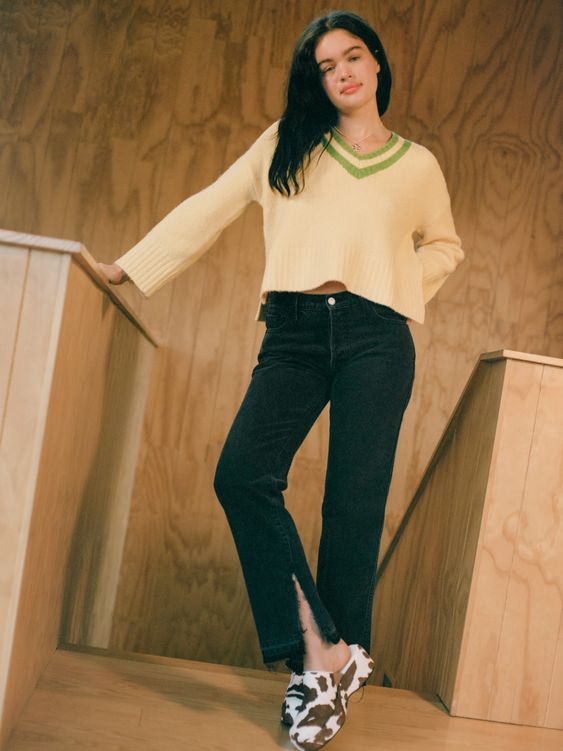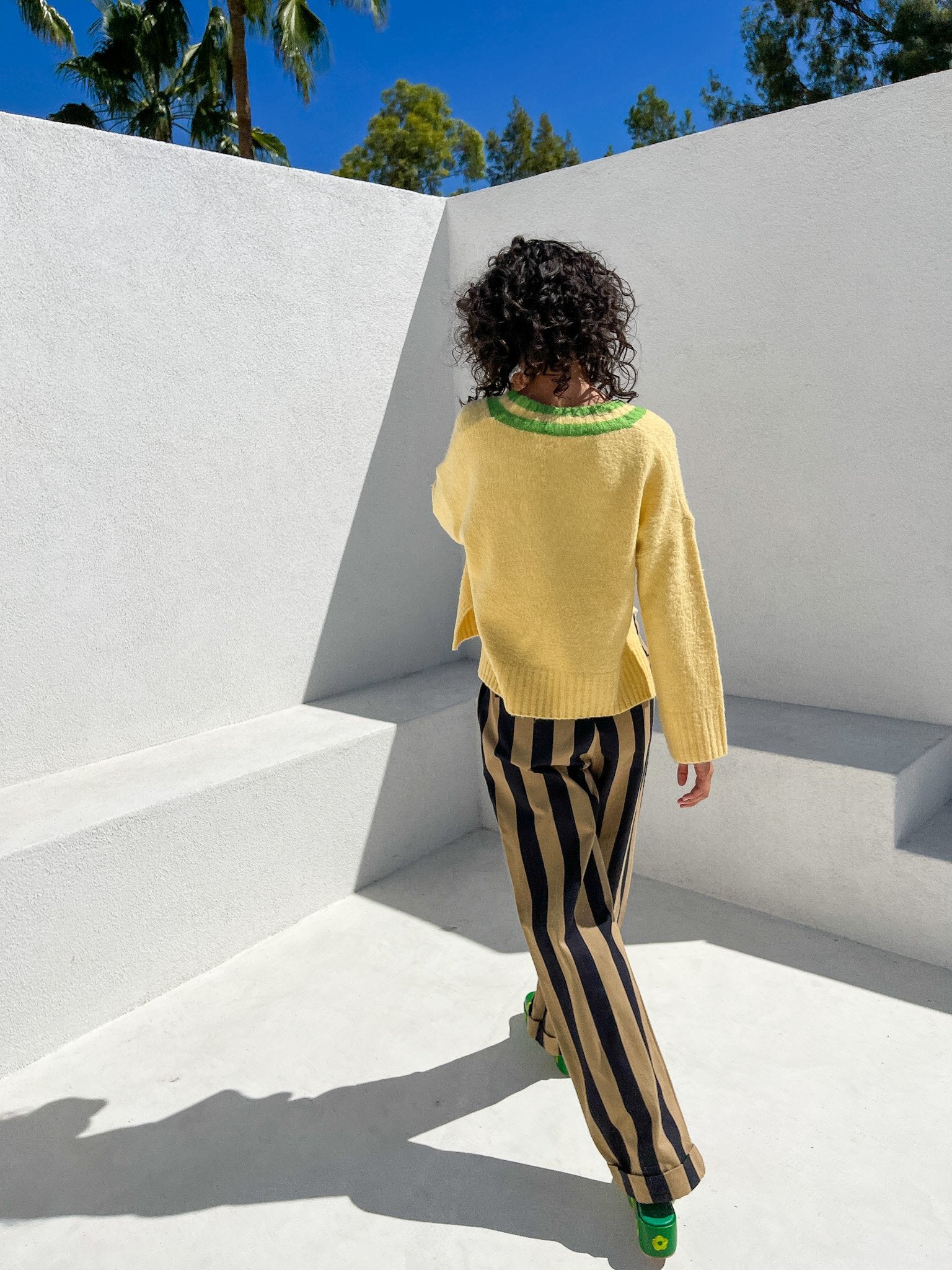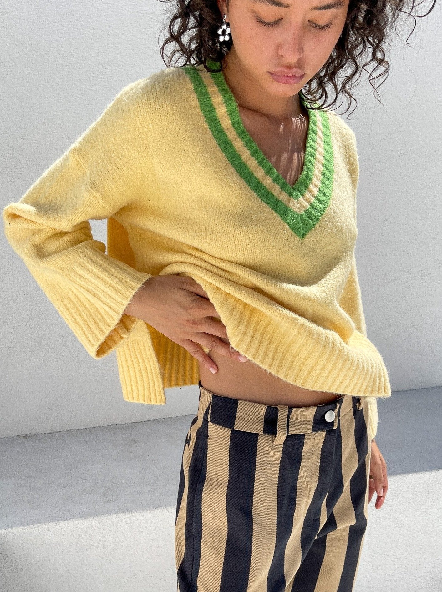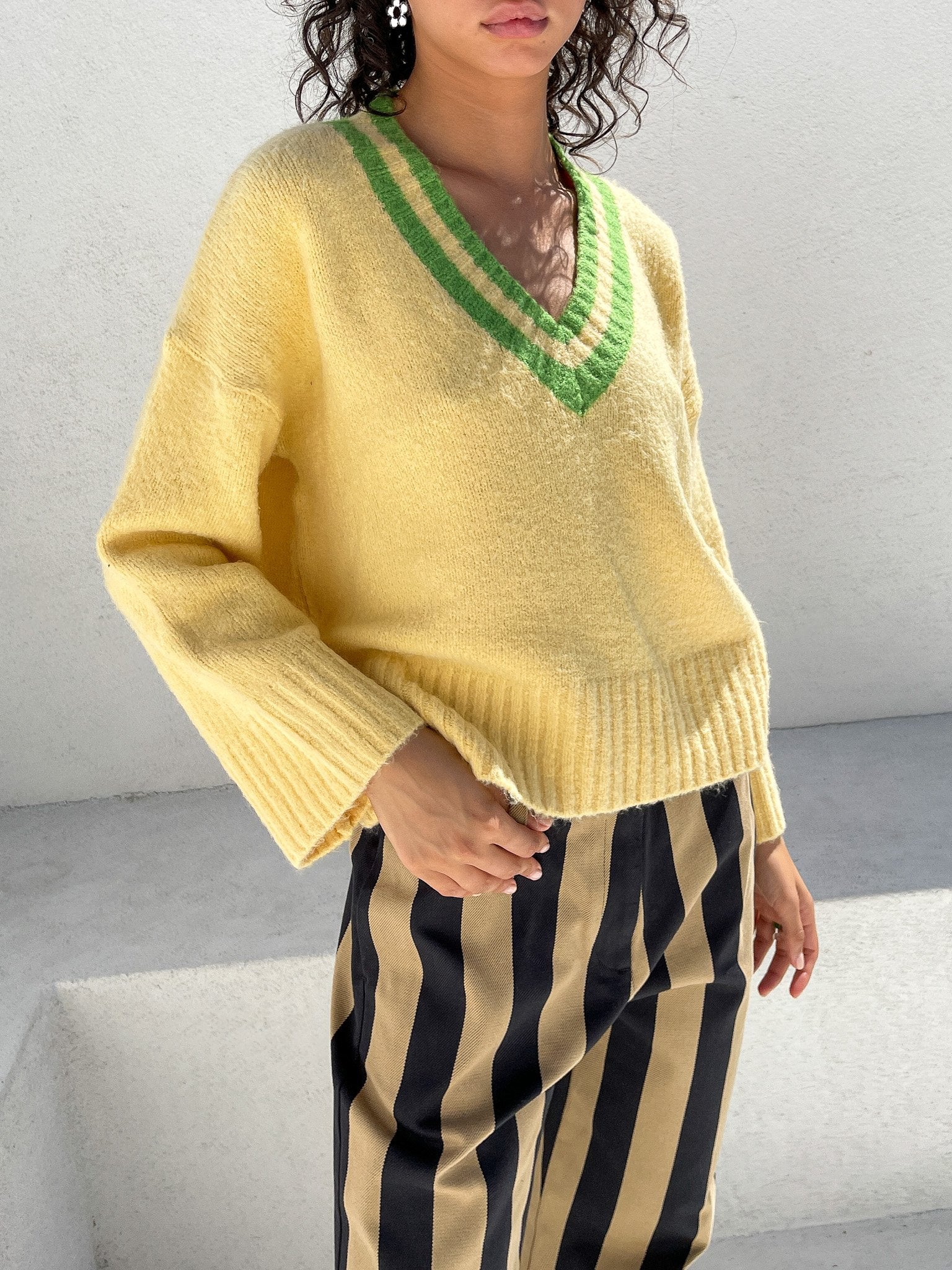 This buttery HELENA knit is a super soft, not itchy collegiate-inspired v-neck sweater featuring a green varsity stripe.