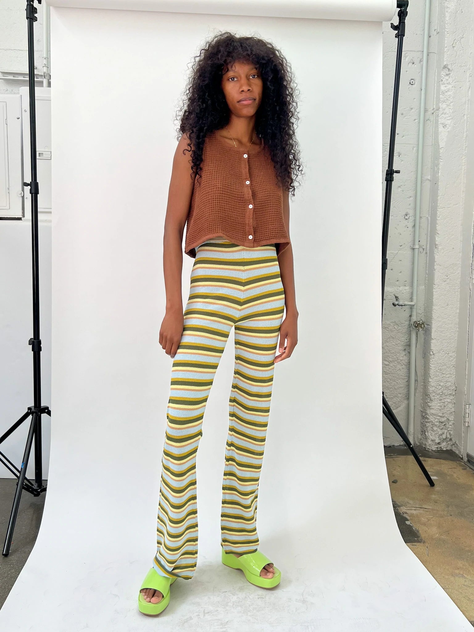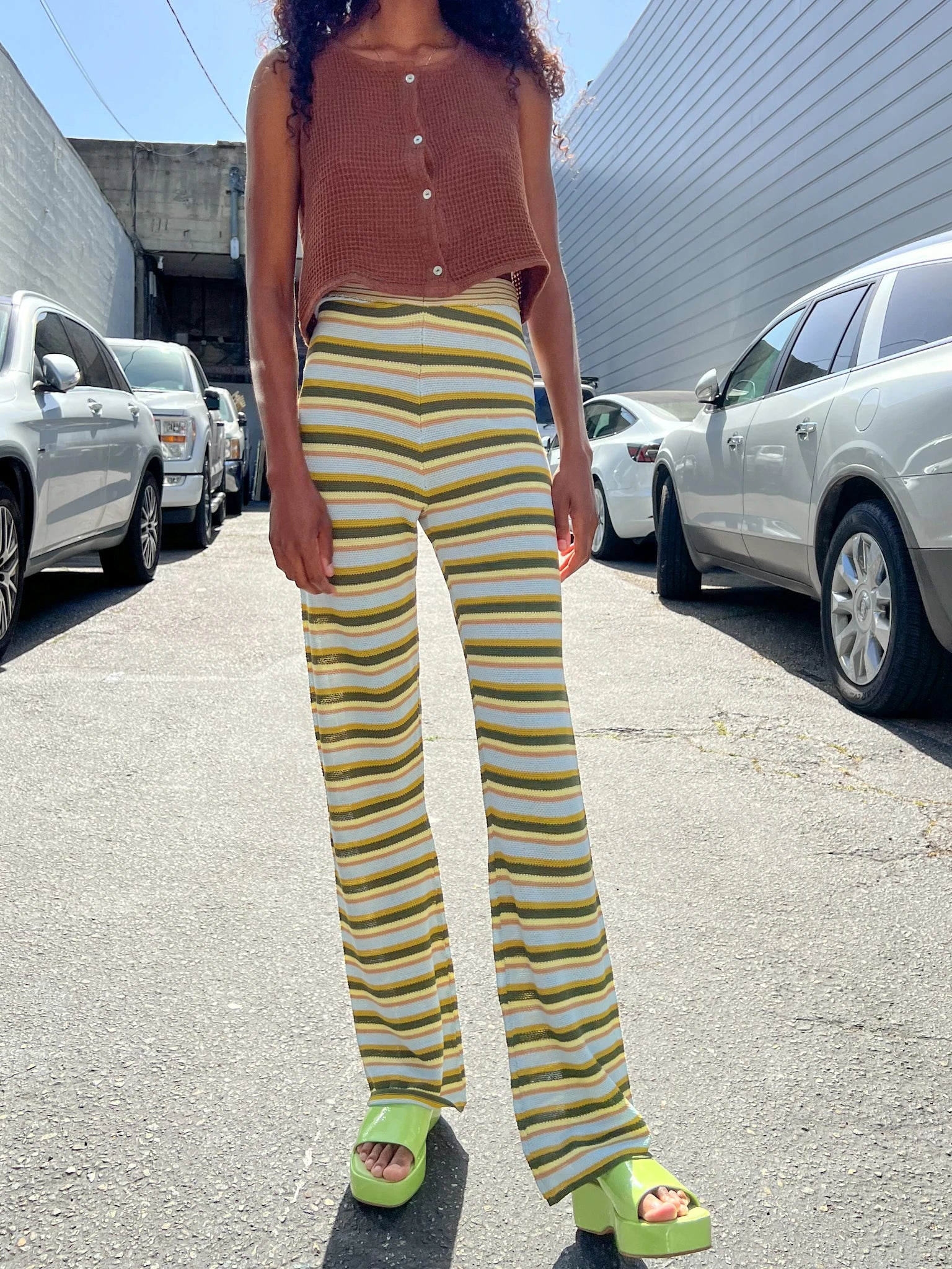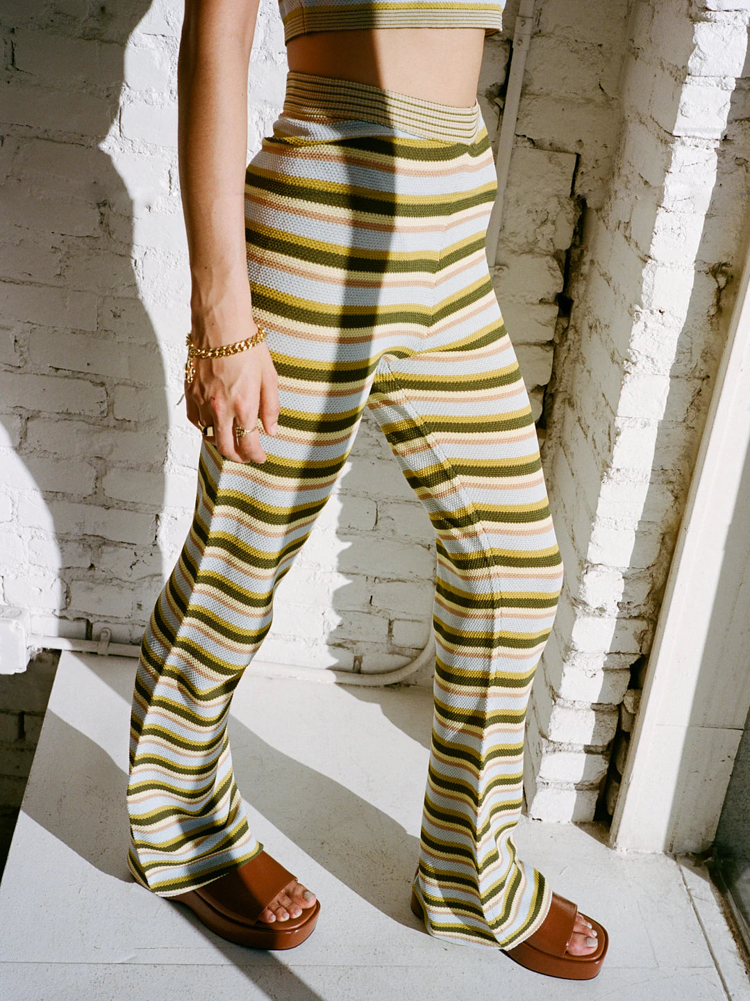 High-waisted straight-leg stretchy pants in the LSG super luxe Sky Stripe texture knit, featuring light blue, green and yellow hues. Match with the Britt top you can shop here.
