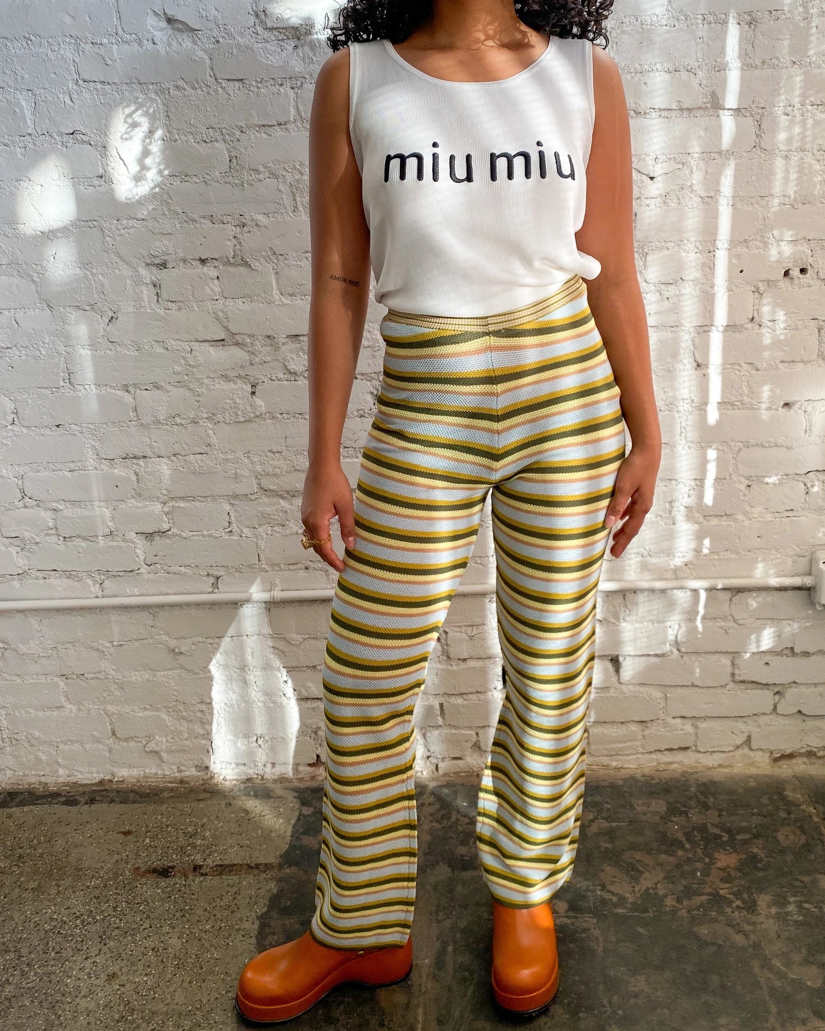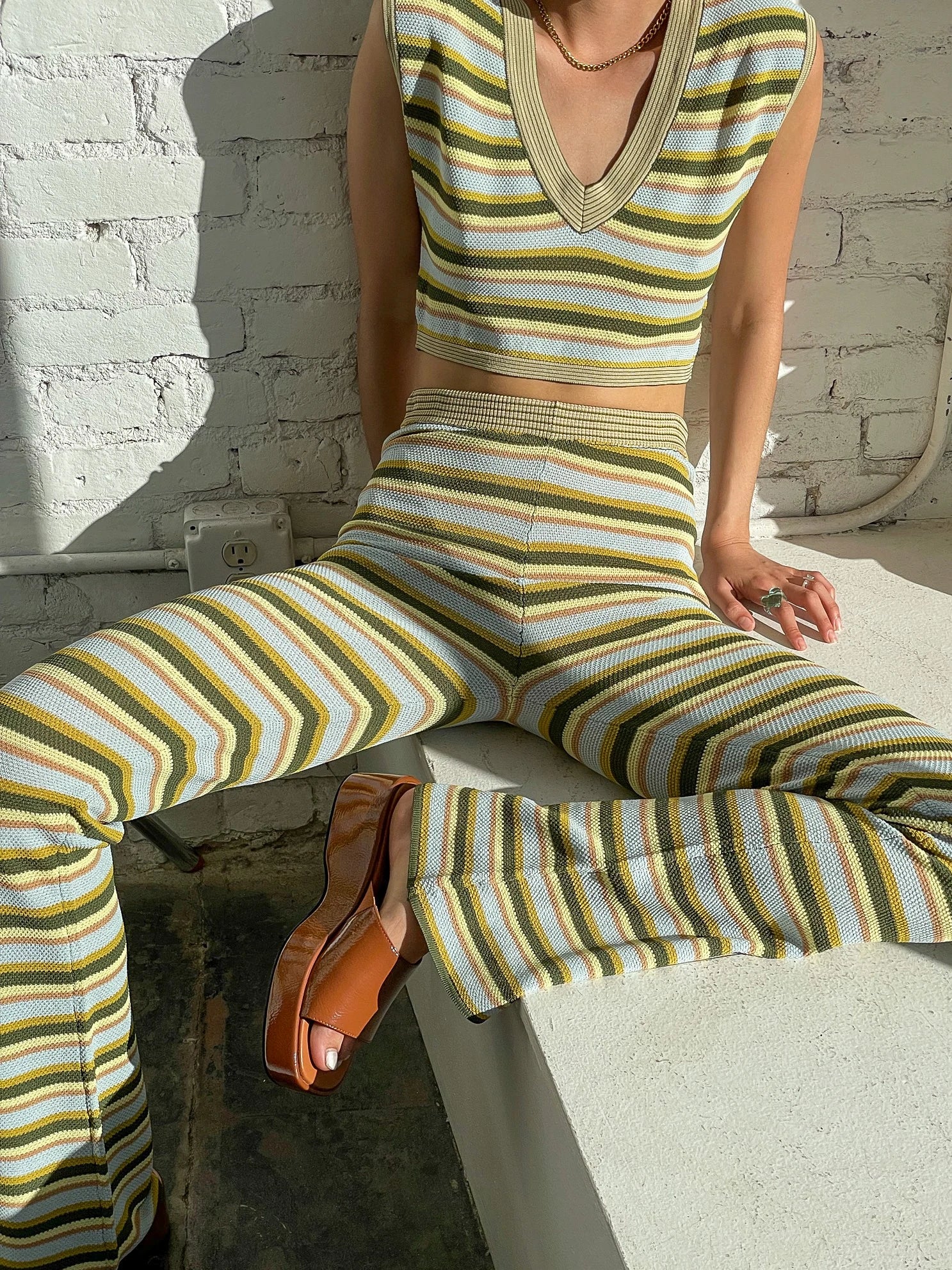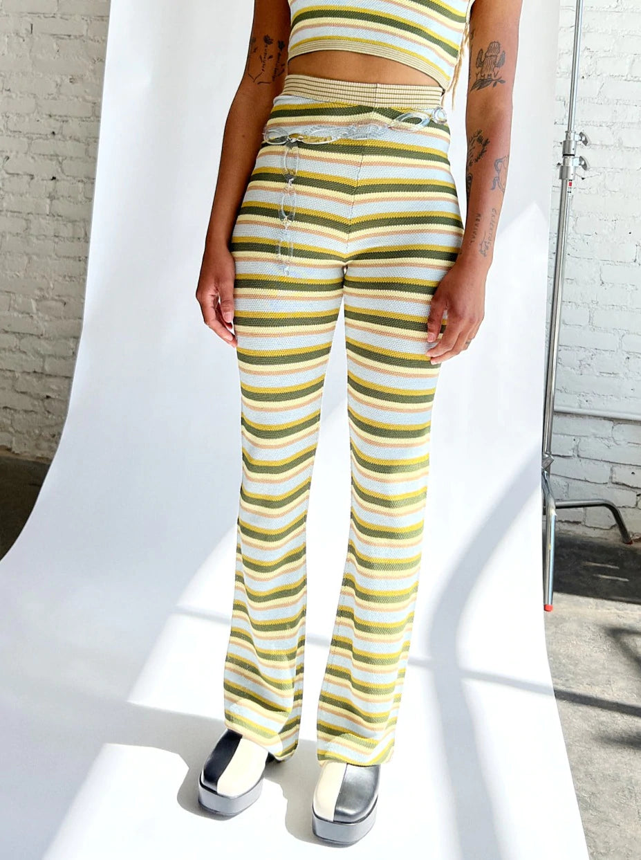 High-waisted straight-leg stretchy pants in the LSG super luxe Sky Stripe texture knit, featuring light blue, green and yellow hues. Match with the Britt top you can shop here.