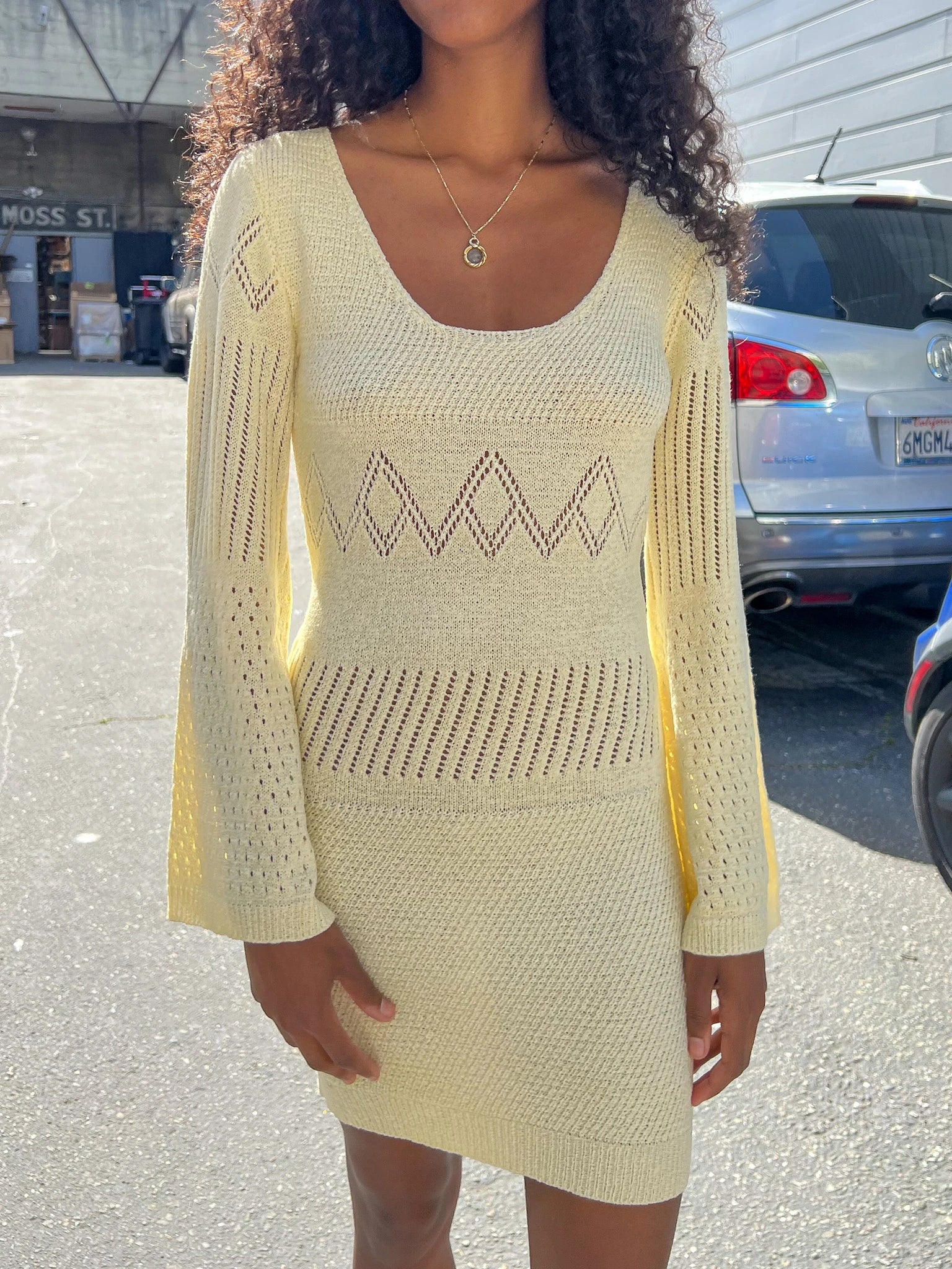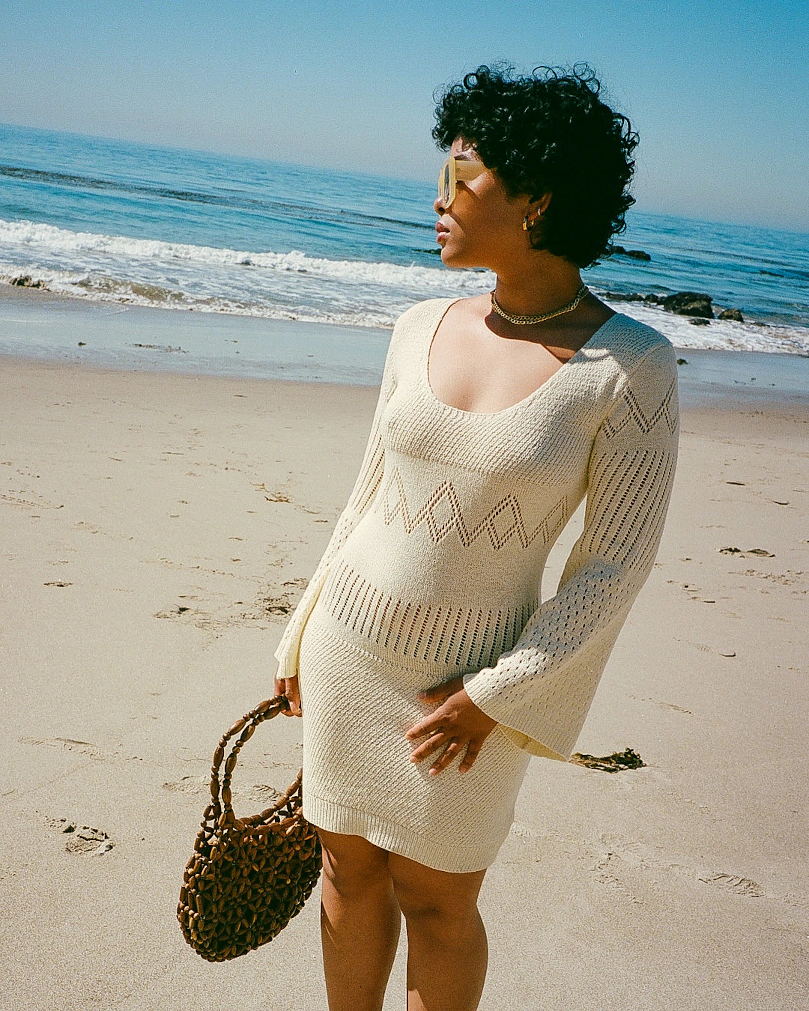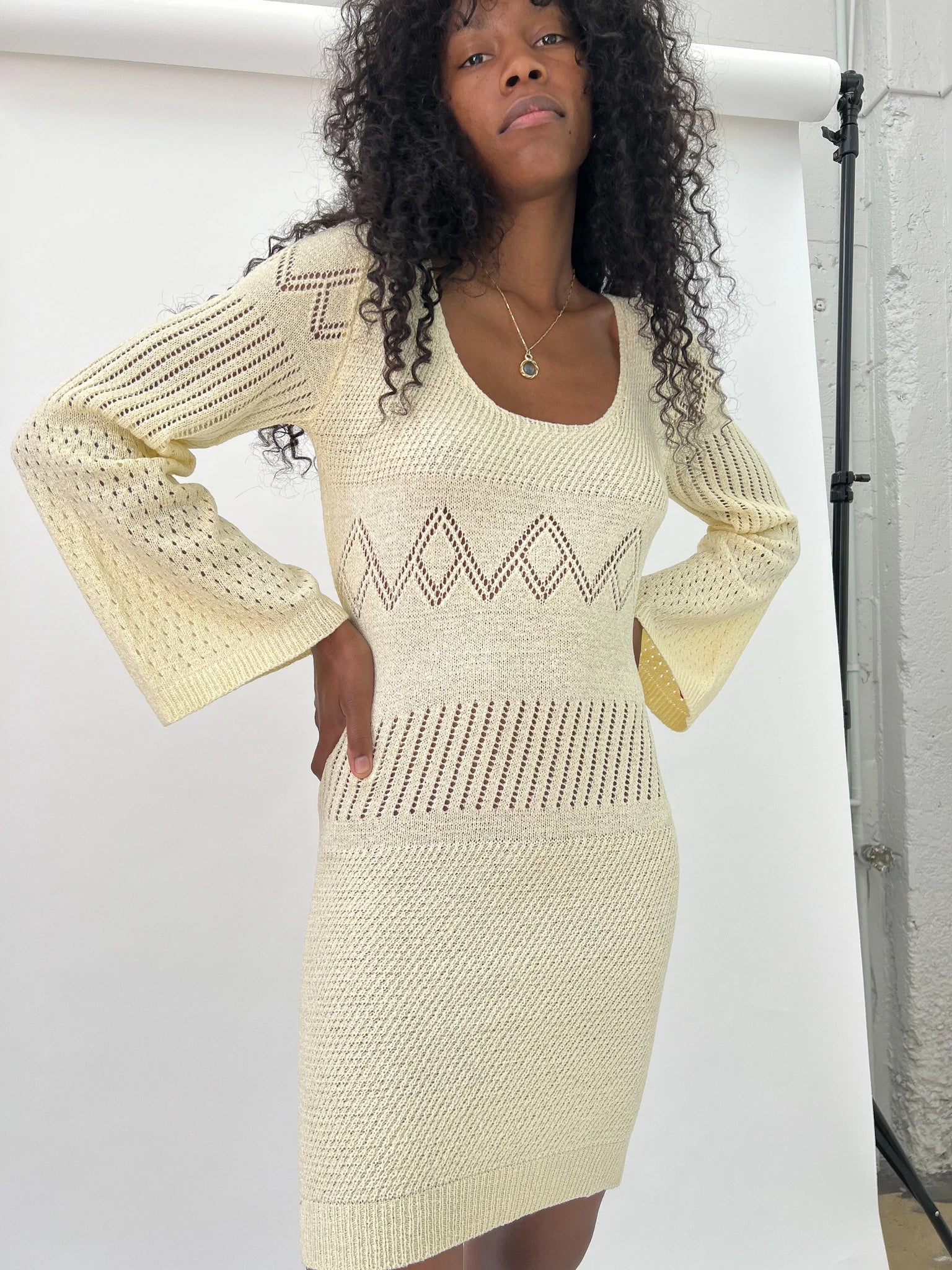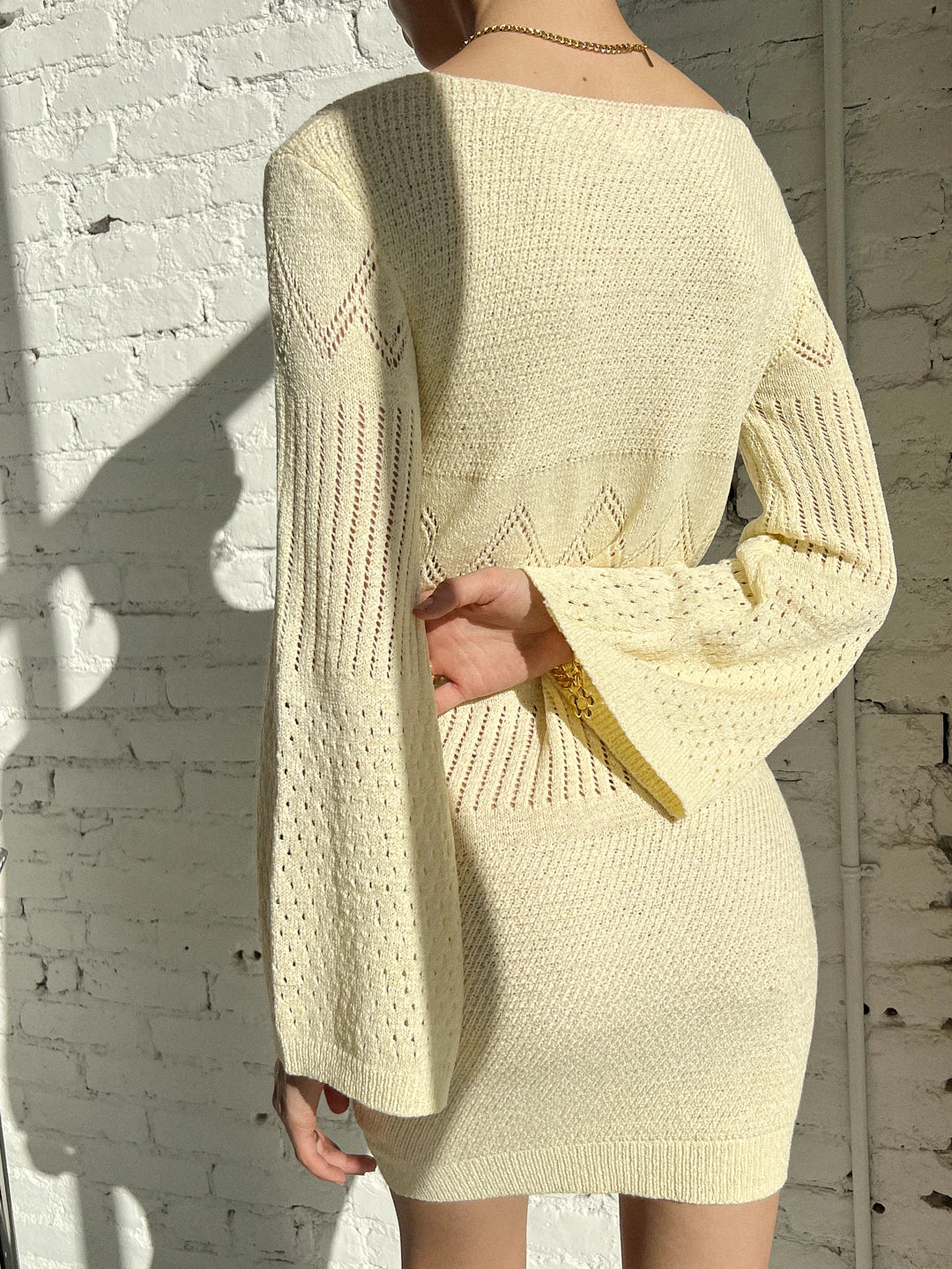 Sixties inspired crochet knit mini dress in a buttery ivory colour. Features bell sleeves and diamond-knit detailing.