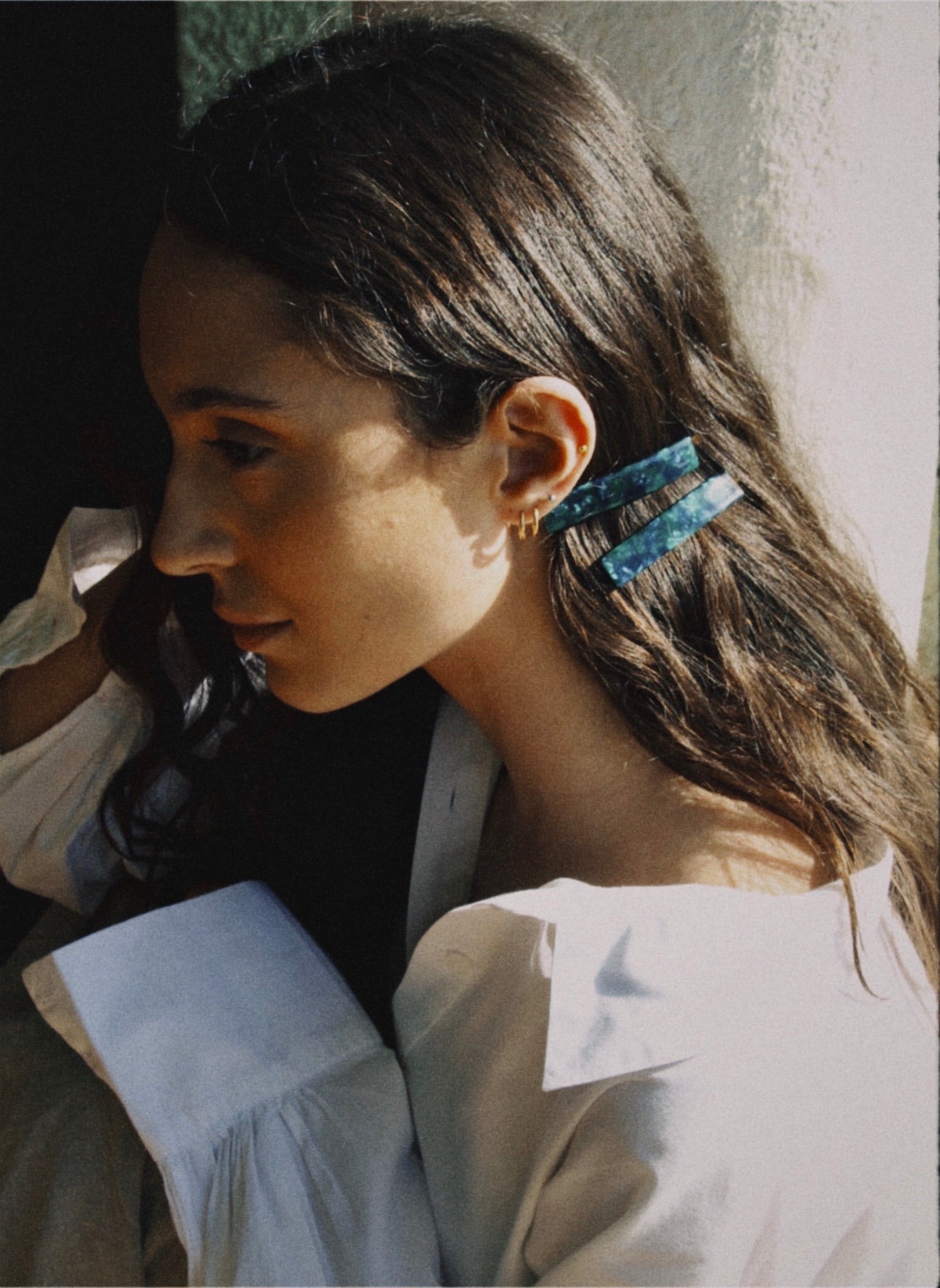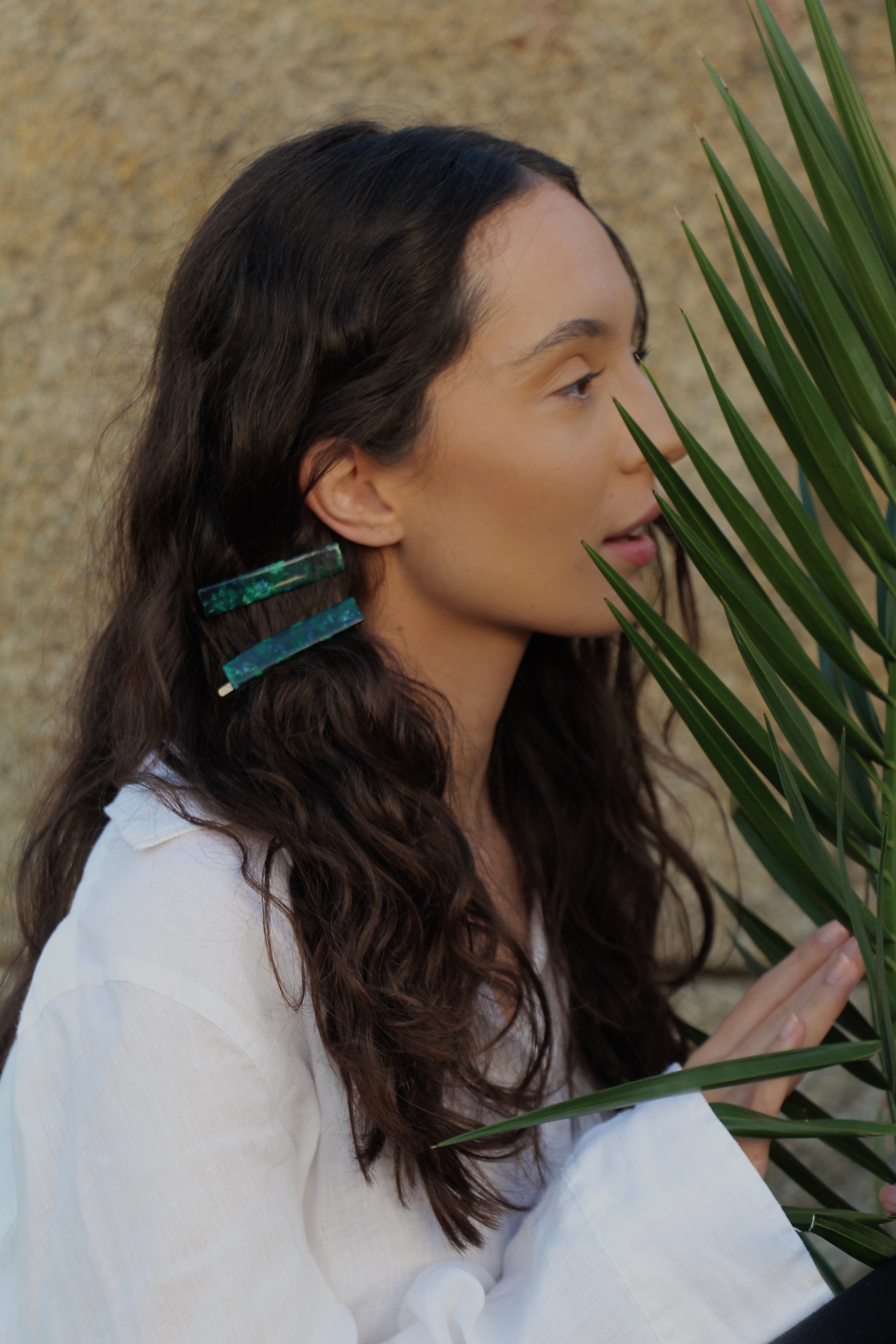 JUNO hair accessories are made from high quality and eco-friendly cellulose acetate materials. Due to the hand-poured production method, there will be a slight variation in the pattern of each clip, and each one will be unique in appearance.