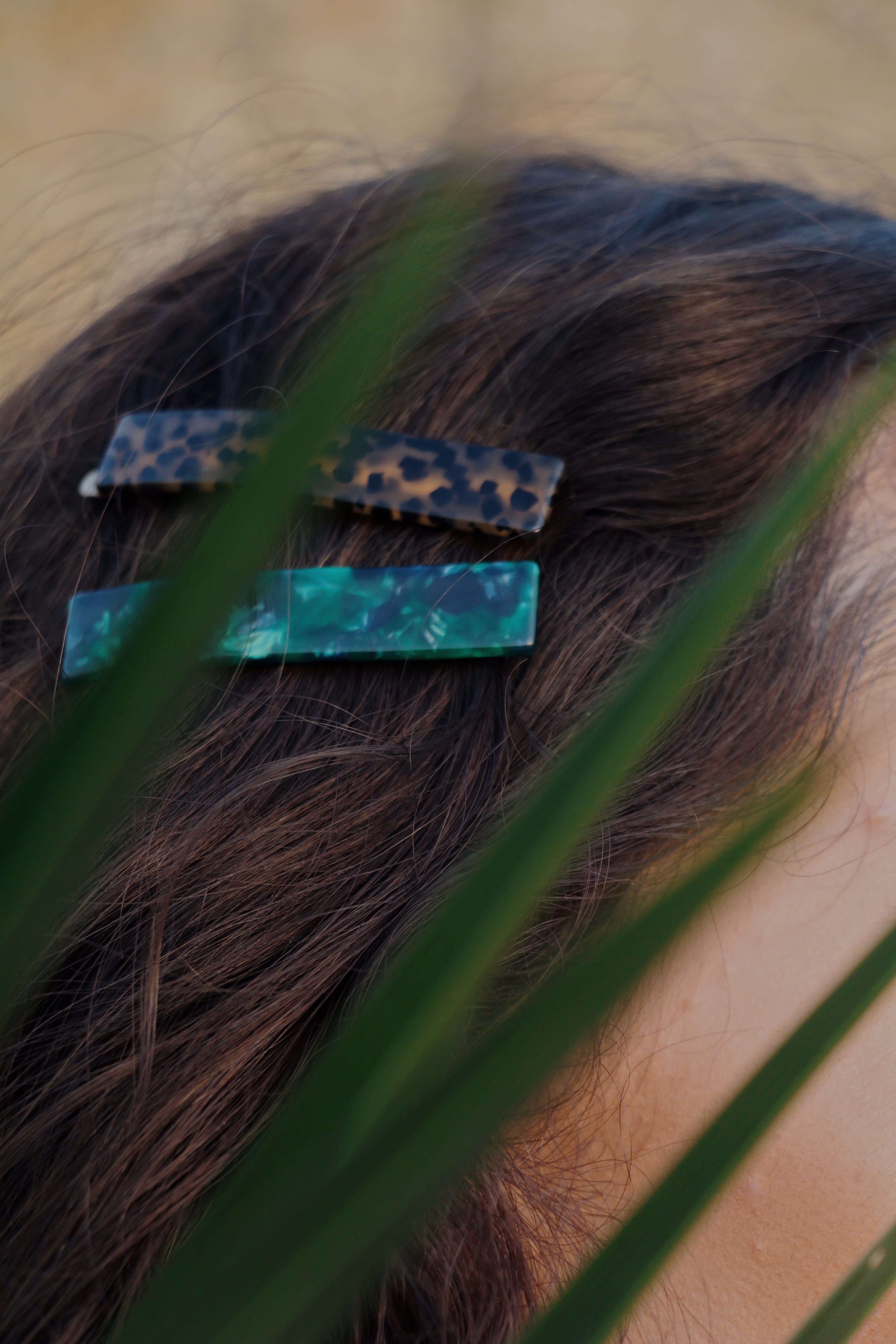 JUNO hair accessories are made from high quality and eco-friendly cellulose acetate materials. Due to the hand-poured production method, there will be a slight variation in the pattern of each clip, and each one will be unique in appearance.
