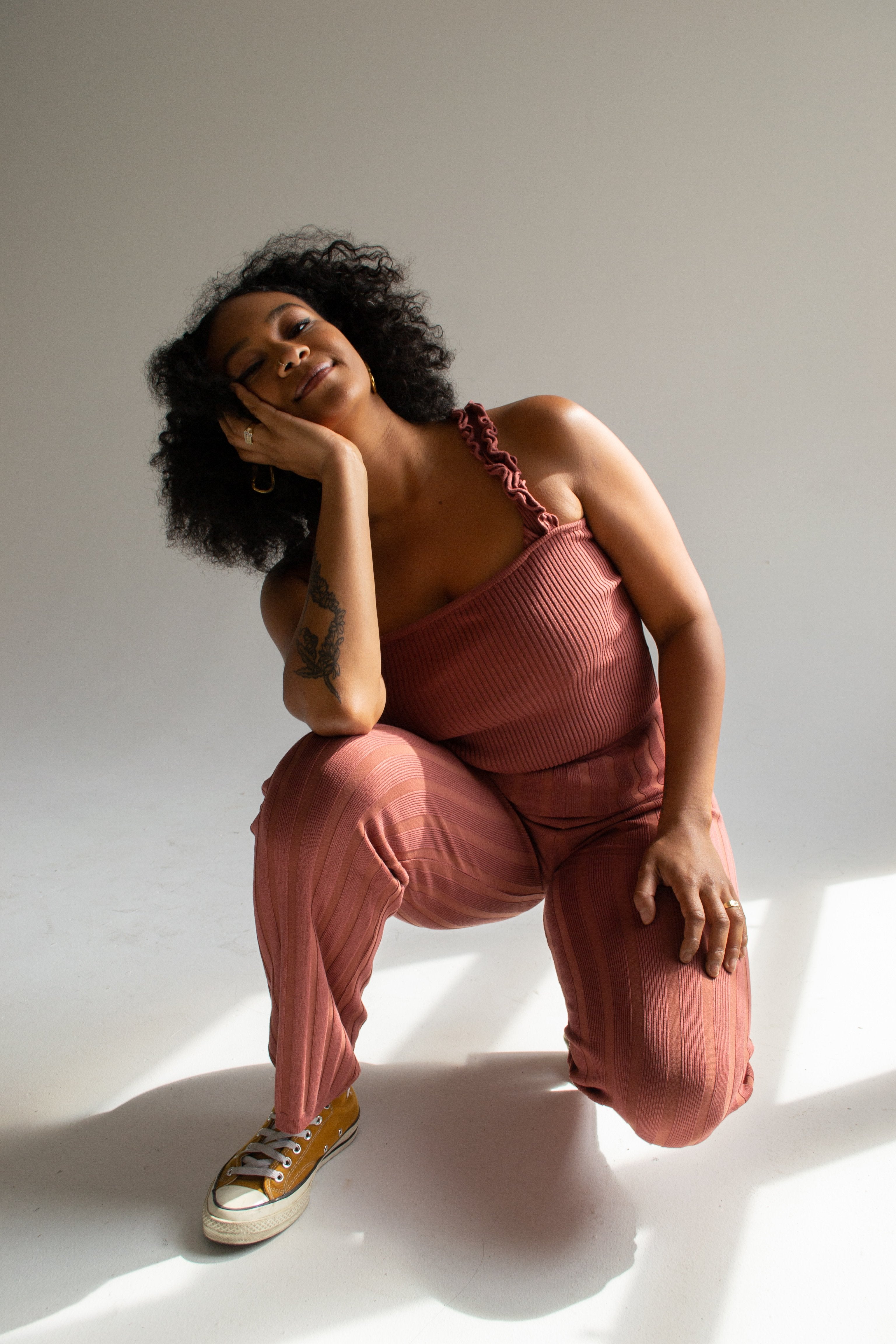 Chunky ribbed tank top with square neck and ruffle strap. Complete the look with the Dale trousers which you can find here. Keep it casual and relaxed with some converse, but we we think this Autumnal colour looks great dressed up too!