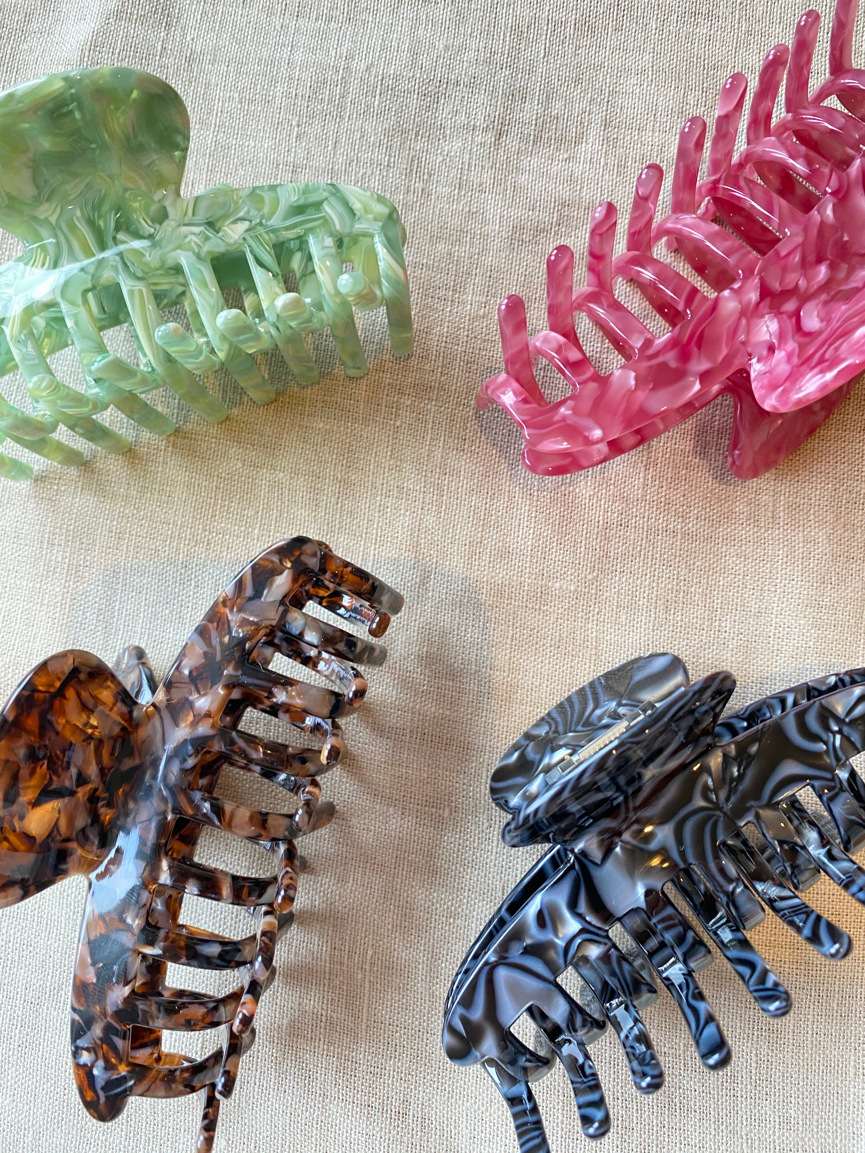 JUNO hair accessories are made from high quality and eco-friendly cellulose acetate materials. Due to the hand-poured production method, there will be a slight variation in the pattern of each clip, and each one will be unique in appearance.