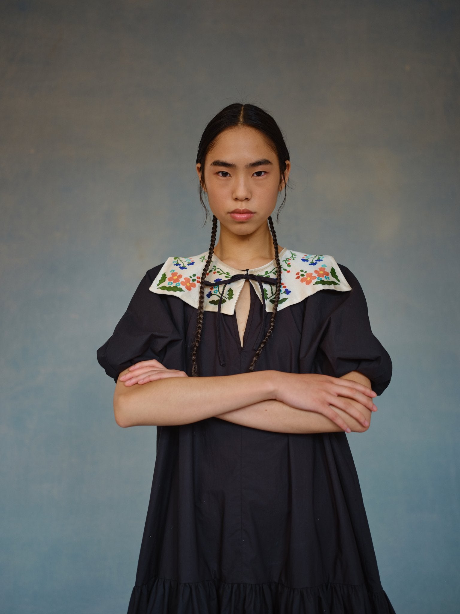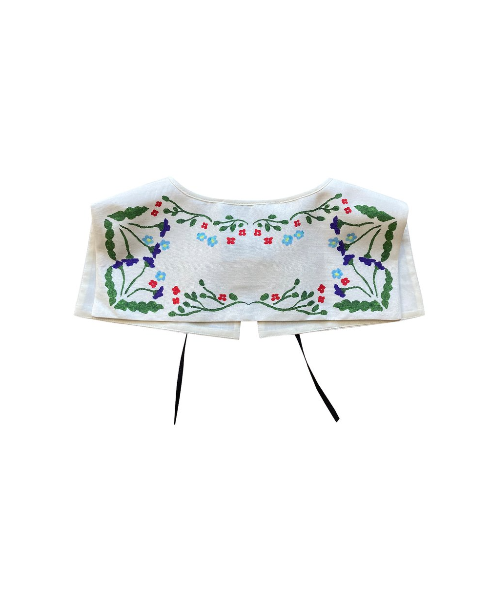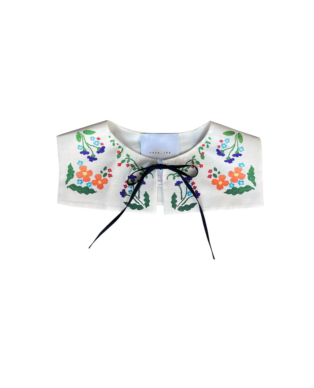 This silk collar is one of those special pieces you will treasure in your wardrobe forever. Made in delicate off-white colour silk; the floral pattern is hand drawn by Naya Rea and screen printed. Fasten with silk ties on the front; it's a perfect pairing with any dress, top or knitwear item. Pictured with the Naya Rea Calina Dress which you can view here.
