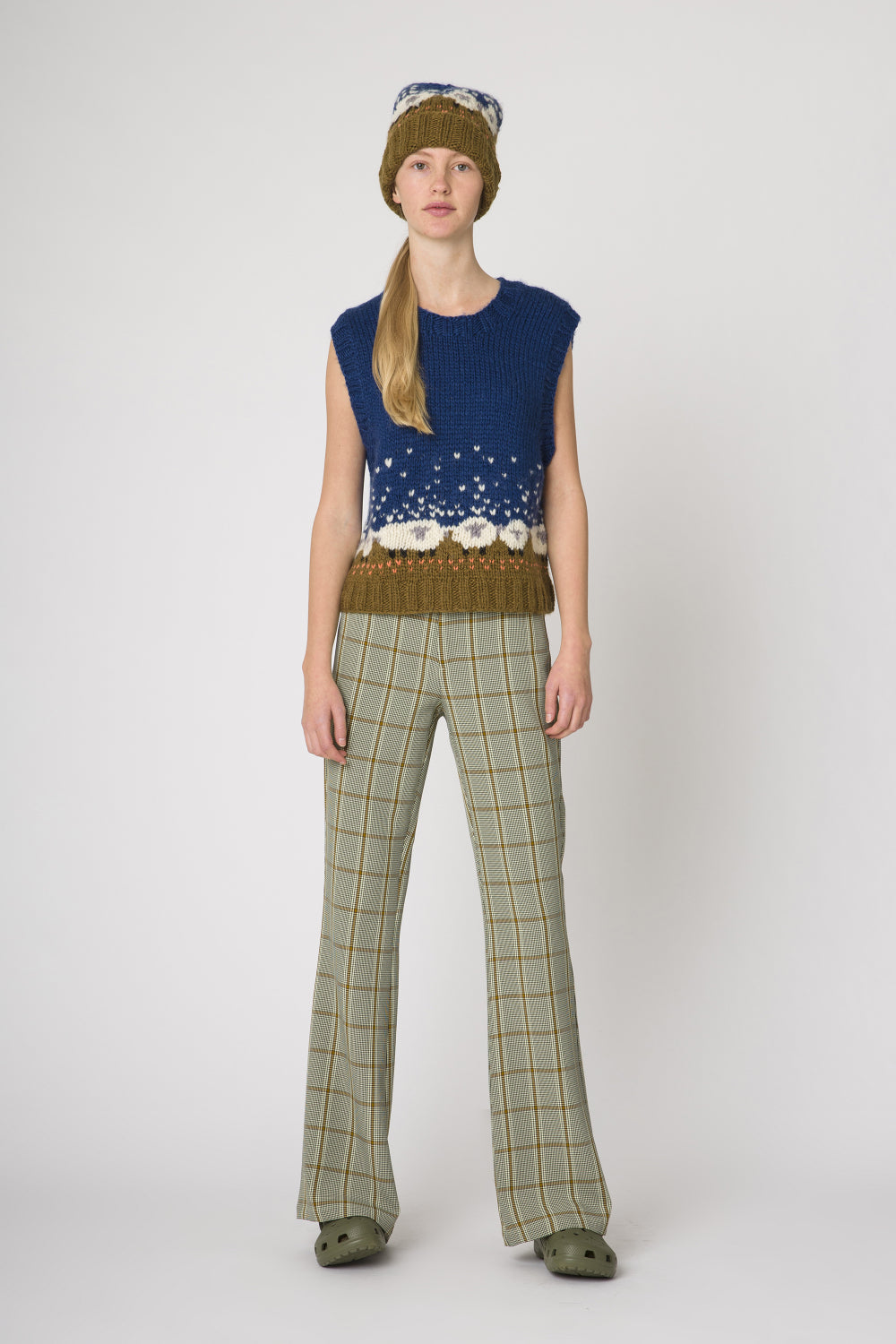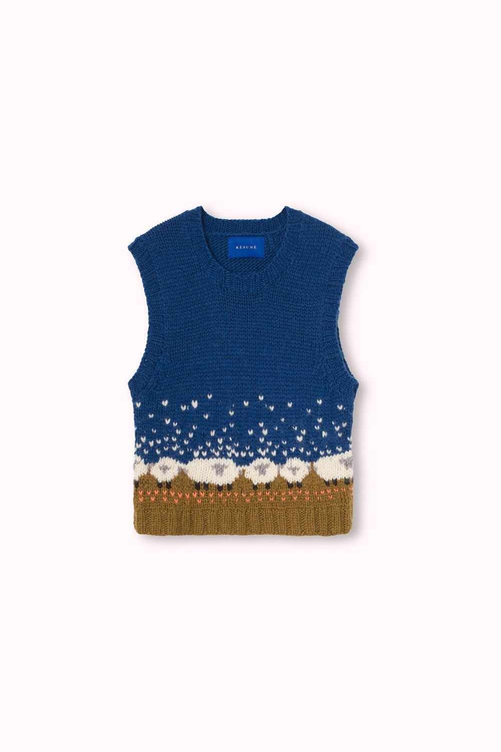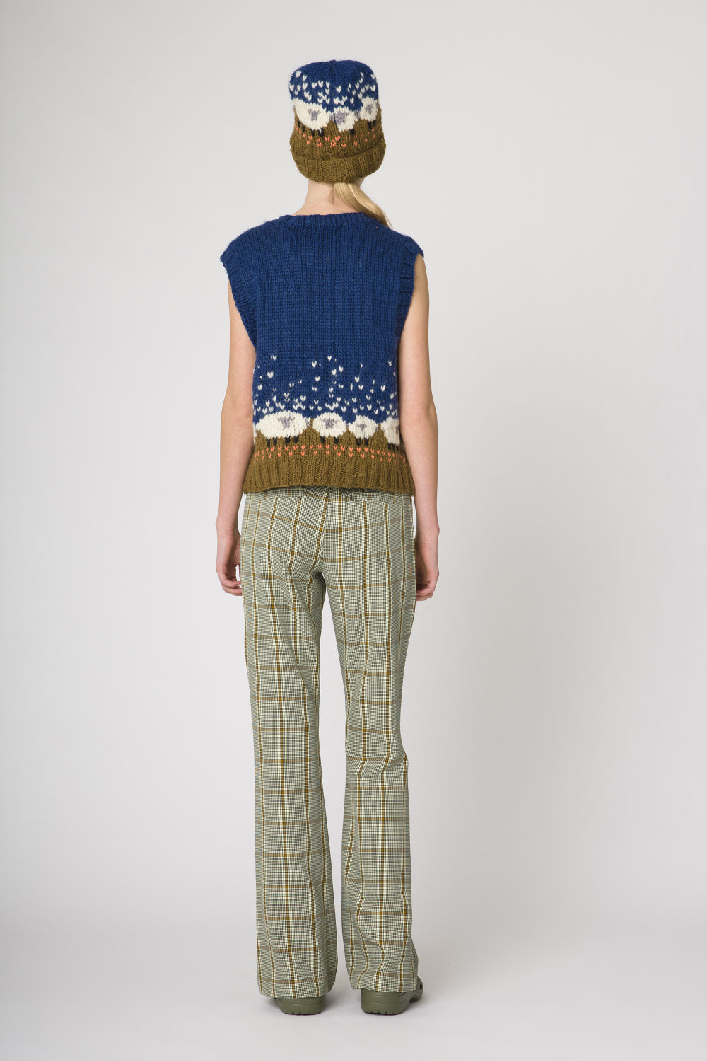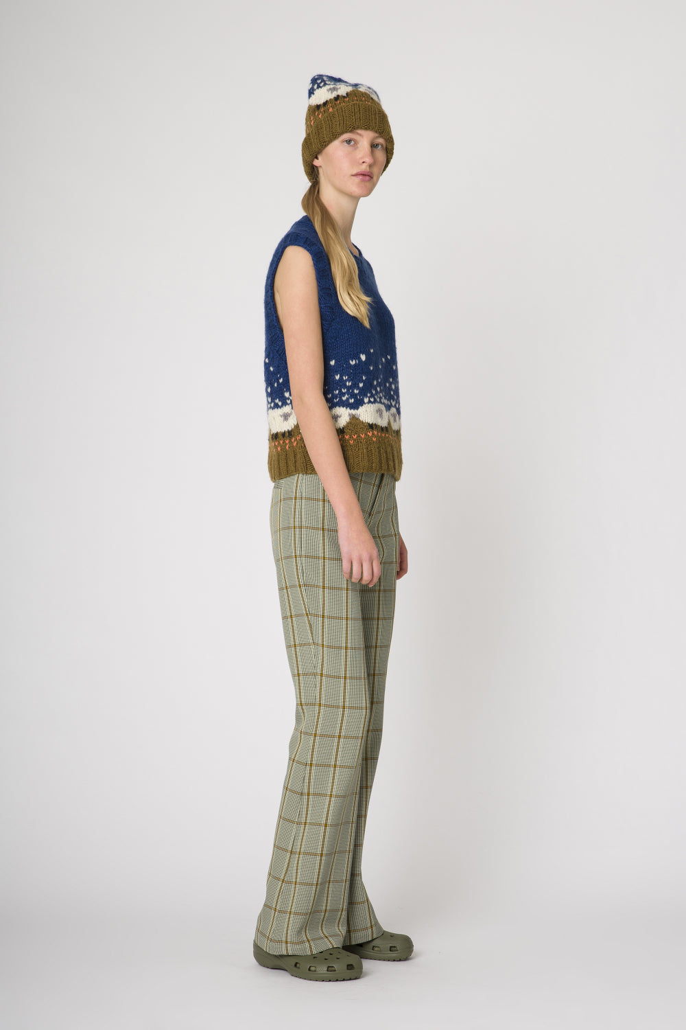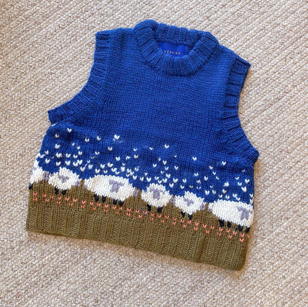 This hand knitted vest features a sheep farm landscape design on a navy blue base.