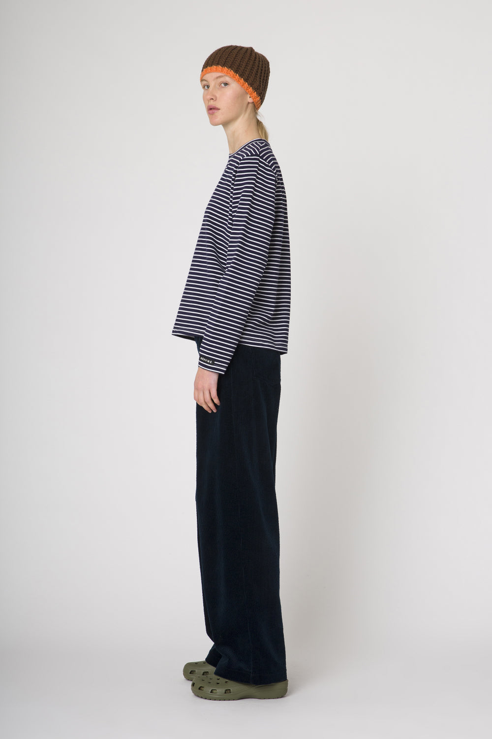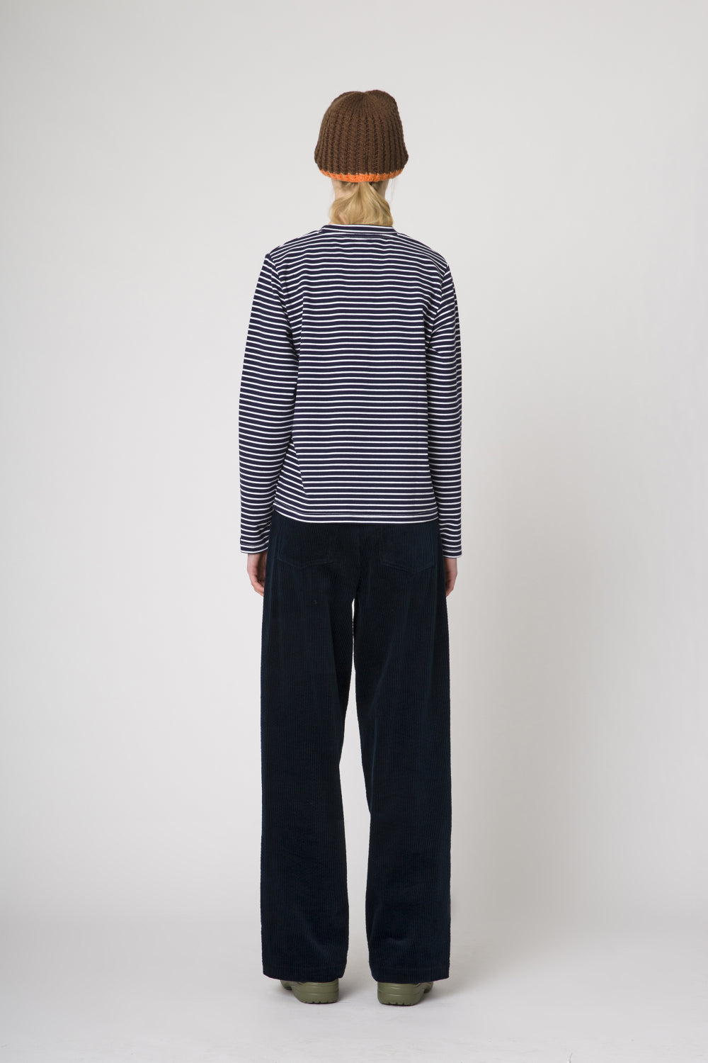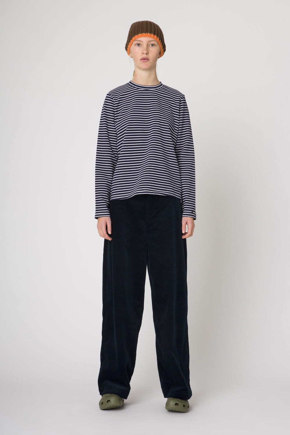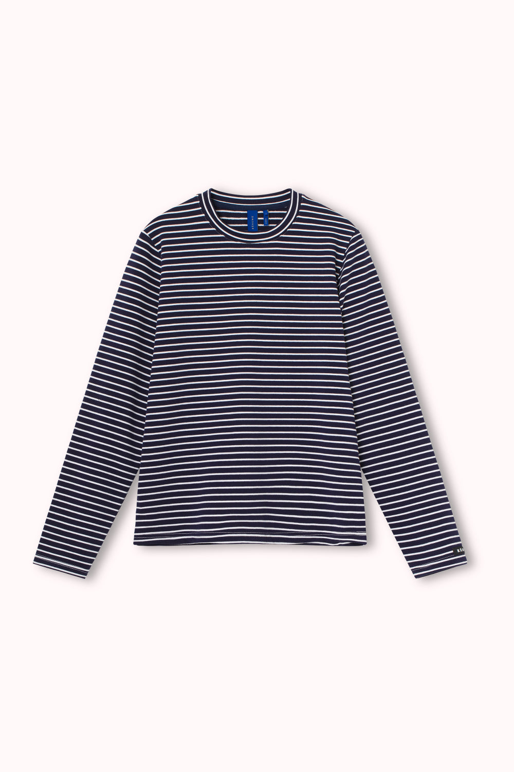GertieRS tee by Resume Copenhagen. A navy base stripe long sleeve t-shirt. The material is a thick cotton/elastane quality so it's nice and warm for the colder months. A relaxed cut without being too baggy, it's a great everyday item for your wardrobe.