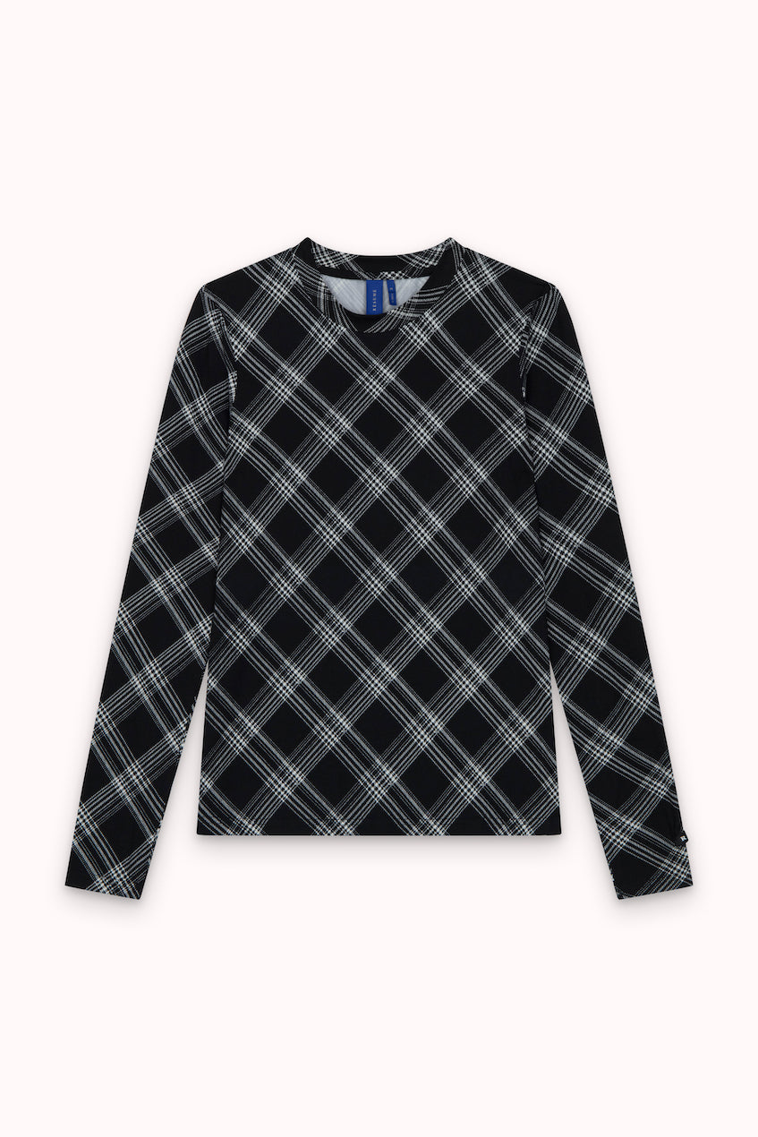 The Gunhild top is a super flattering fitted jersey top made from a poly/elastane mix. It comes in this black base check print, and features a short polo neck and long sleeves.
