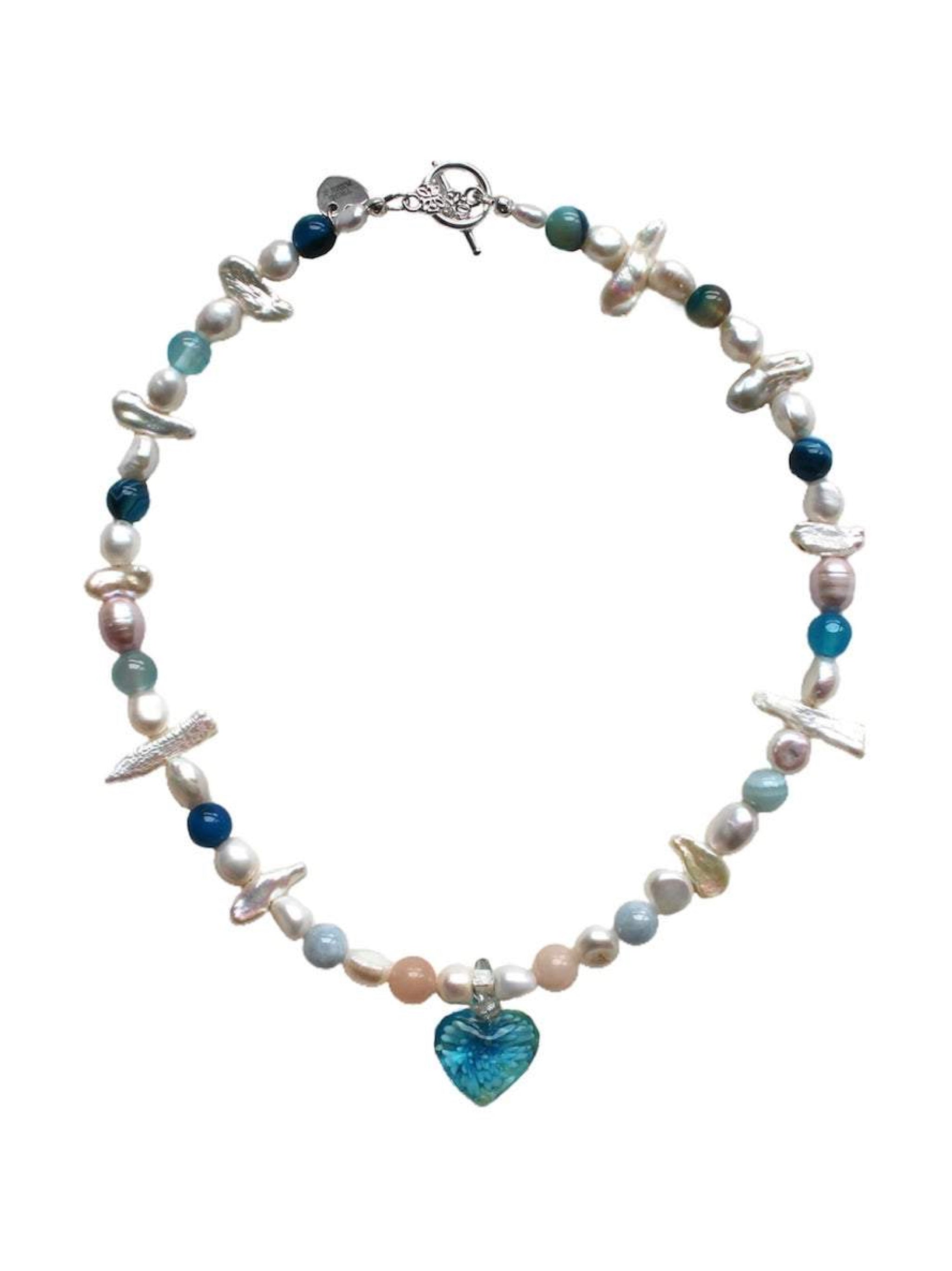 One of a kind! 16 “. Authentic precious striped agate gemstones are paired with delicate baroque, white & soft pink pearls finished with a light blue deadstock murano glass heart pendant. Finished with a 925 sterling silver plated toggle, complete with the custom engraved True Middle logo tag.