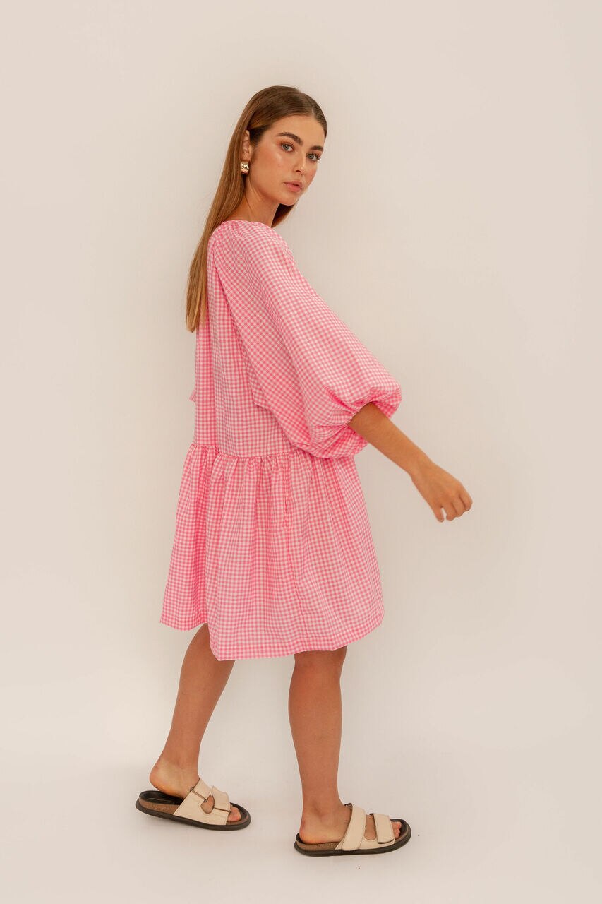 TILLY is an oversized boxy style dress made in 100% cotton. This loose and relaxed dress features gorgeous balloon sleeves with elasticated edges, panel seam details and a v-neck. This one is the mini length, and comes in pink gingham. Handmade in Indonesia.