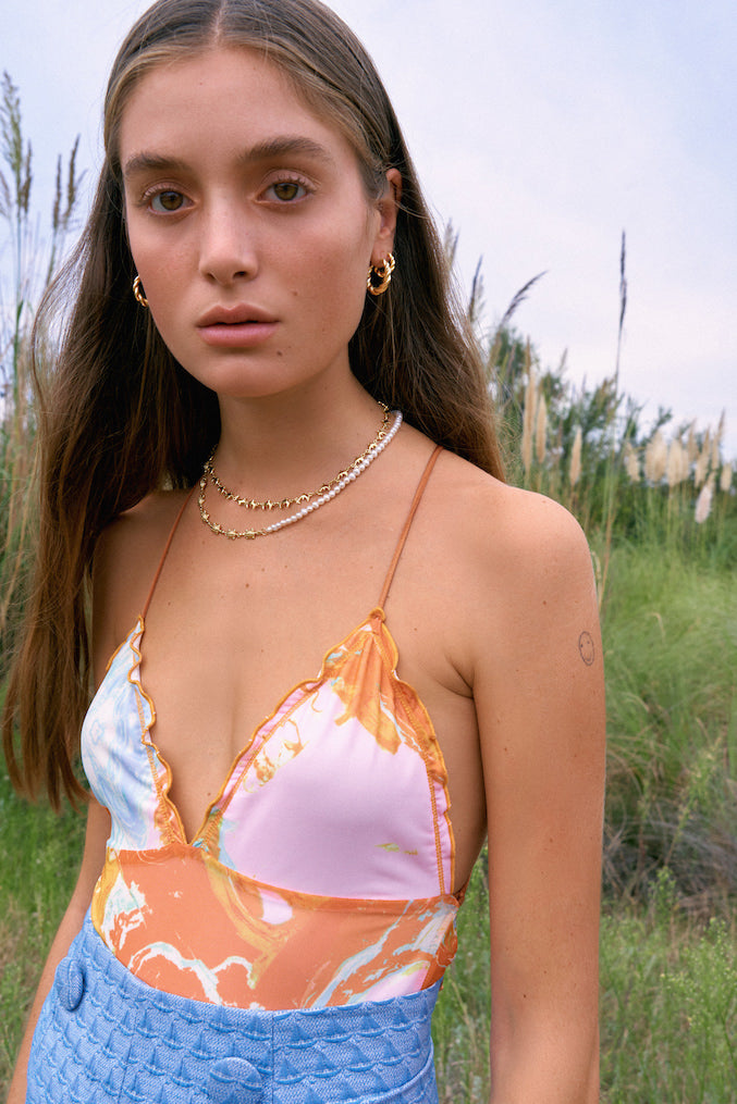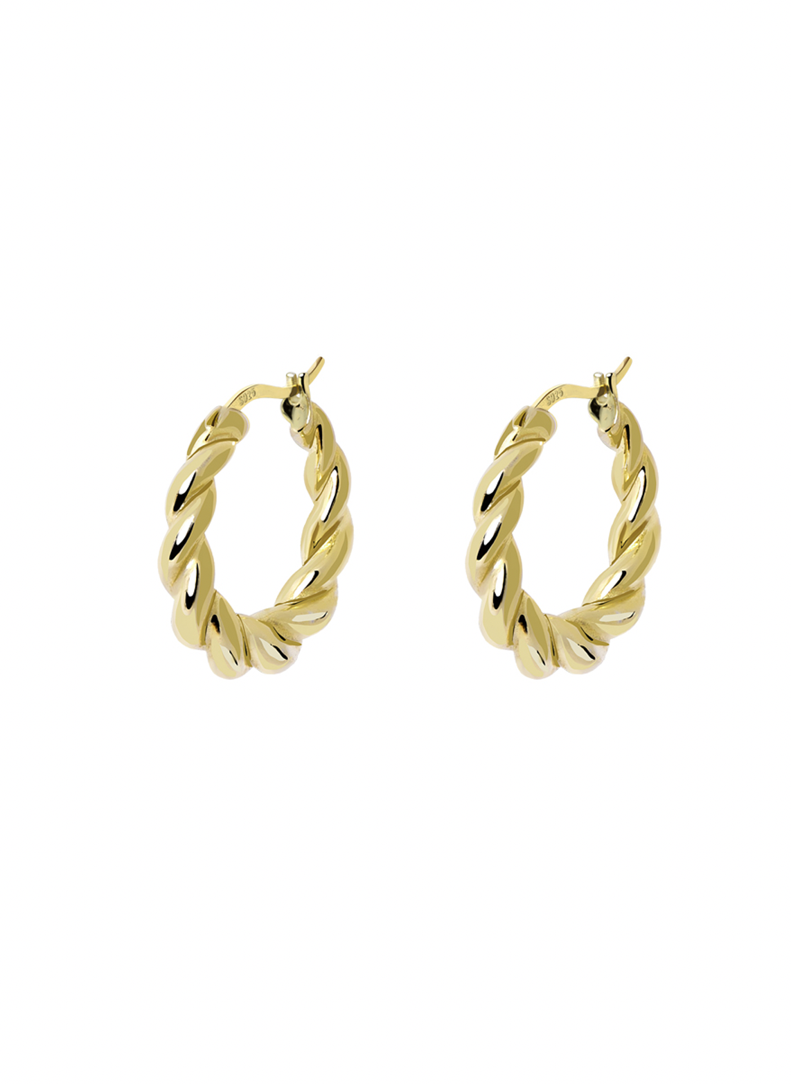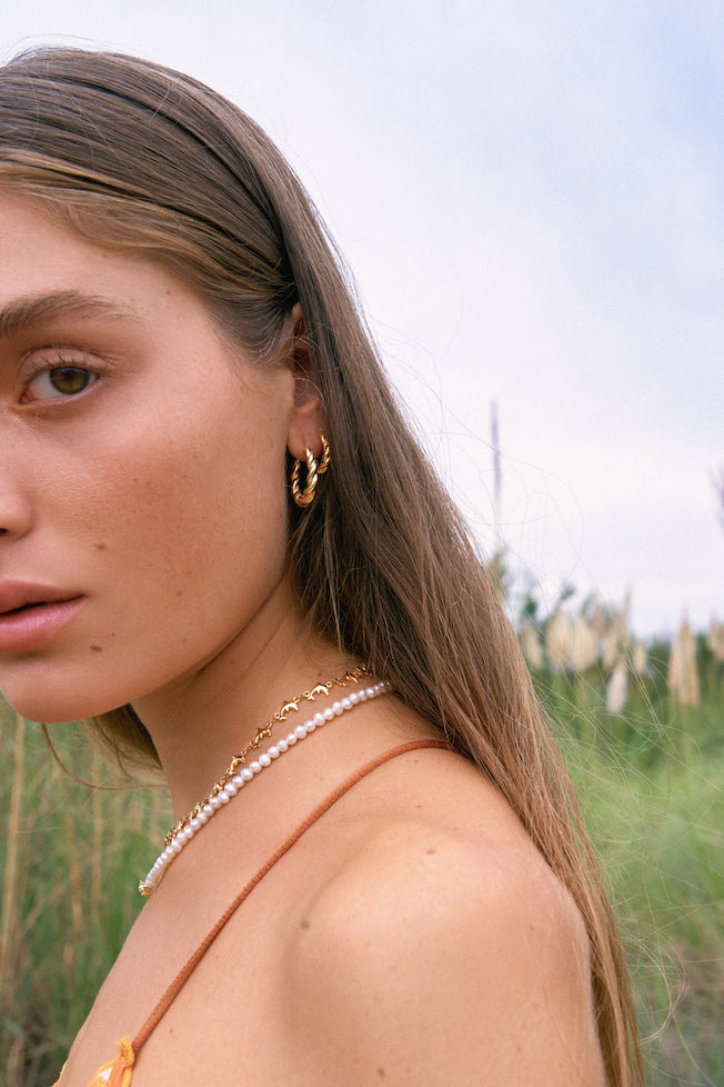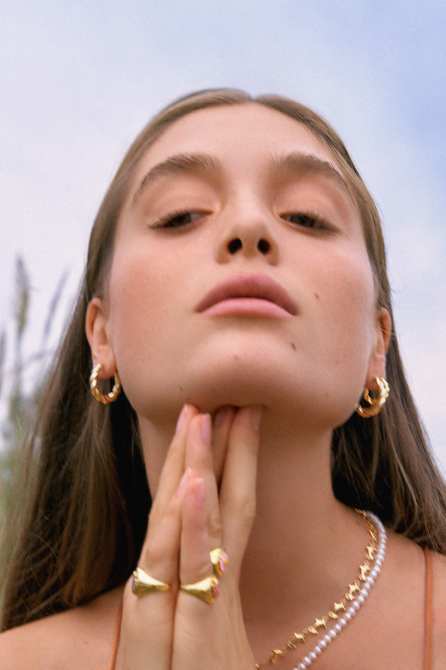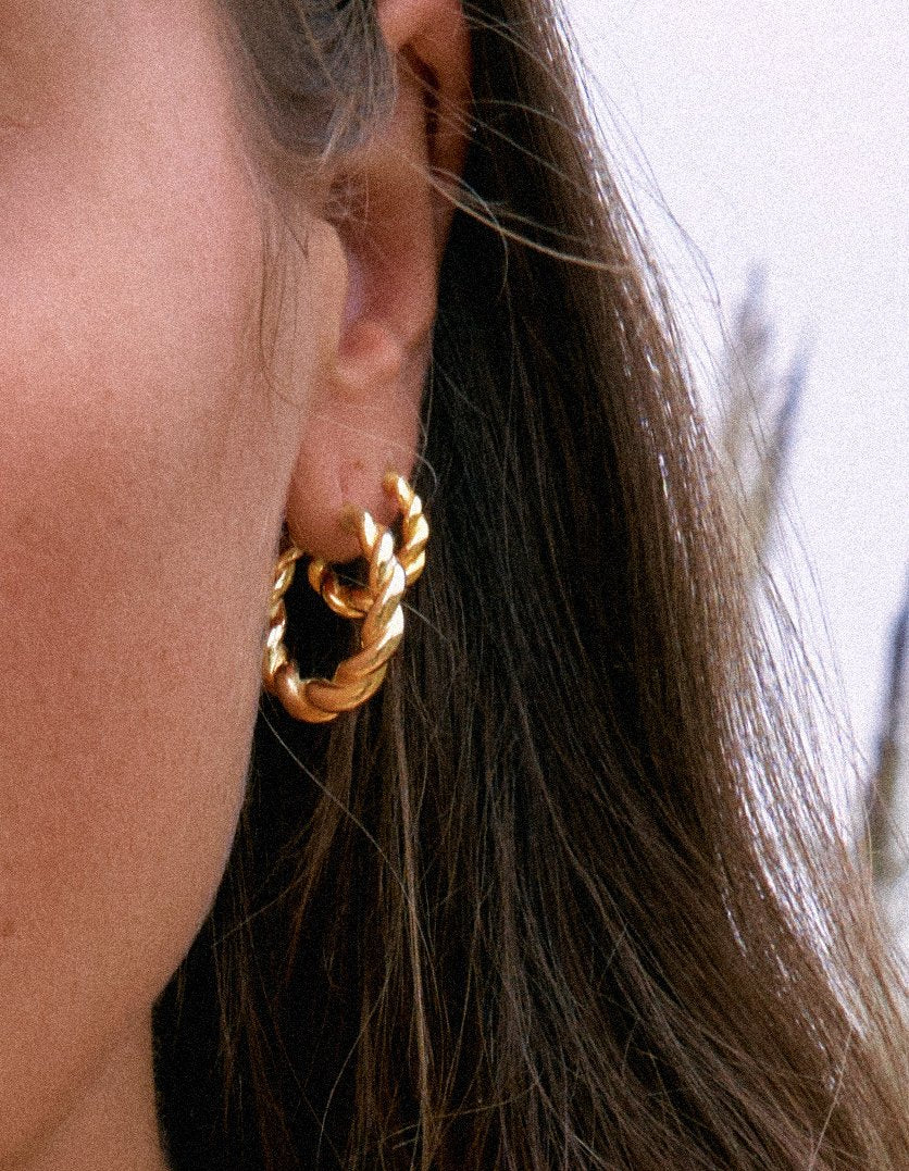 An update on your classic gold hoop, but still the perfect everyday staple! These are the Wilhelmina Garcia swirl hoops in the small size, plated with 18k gold. These are the small hoop size pictured.