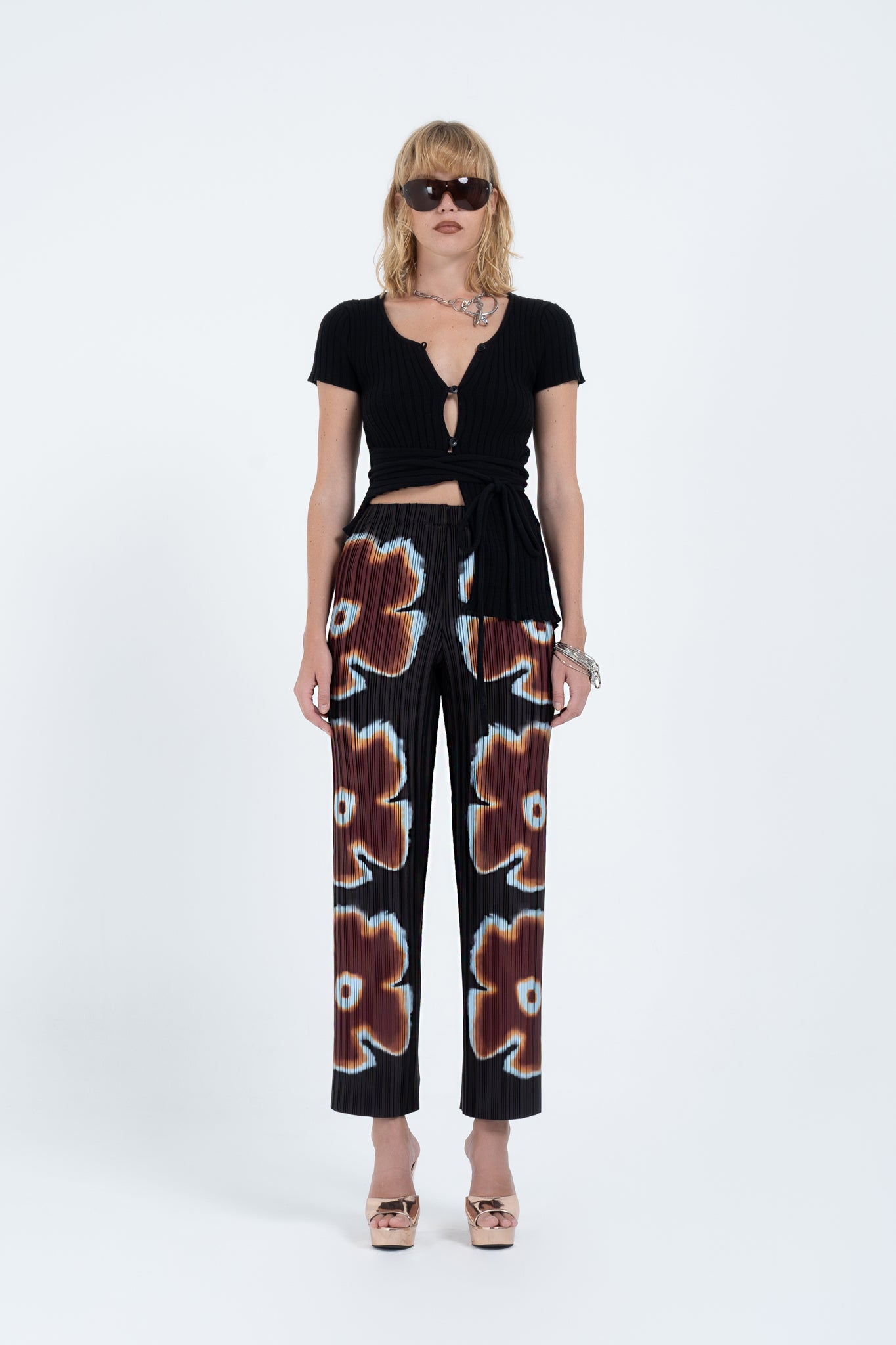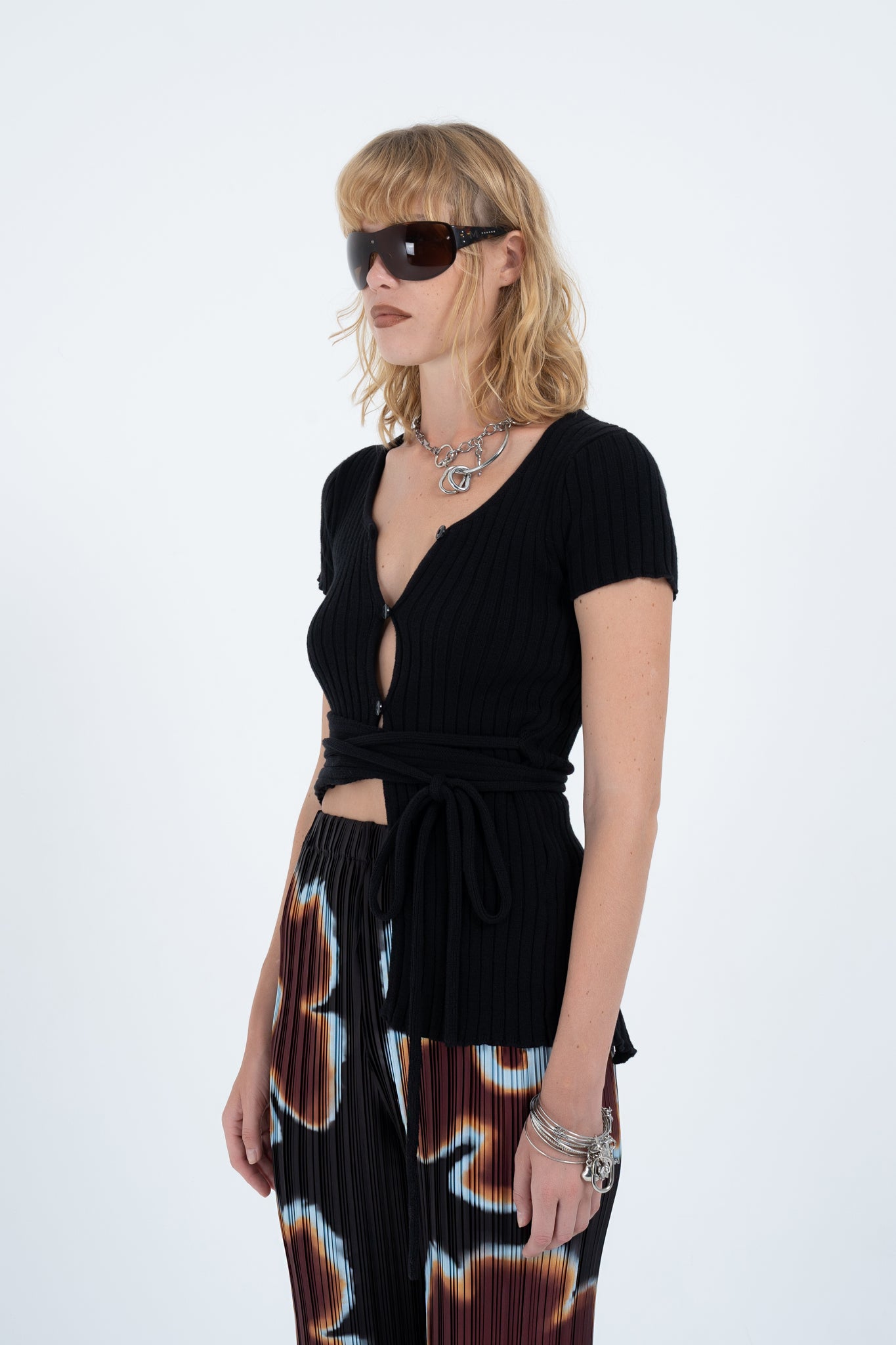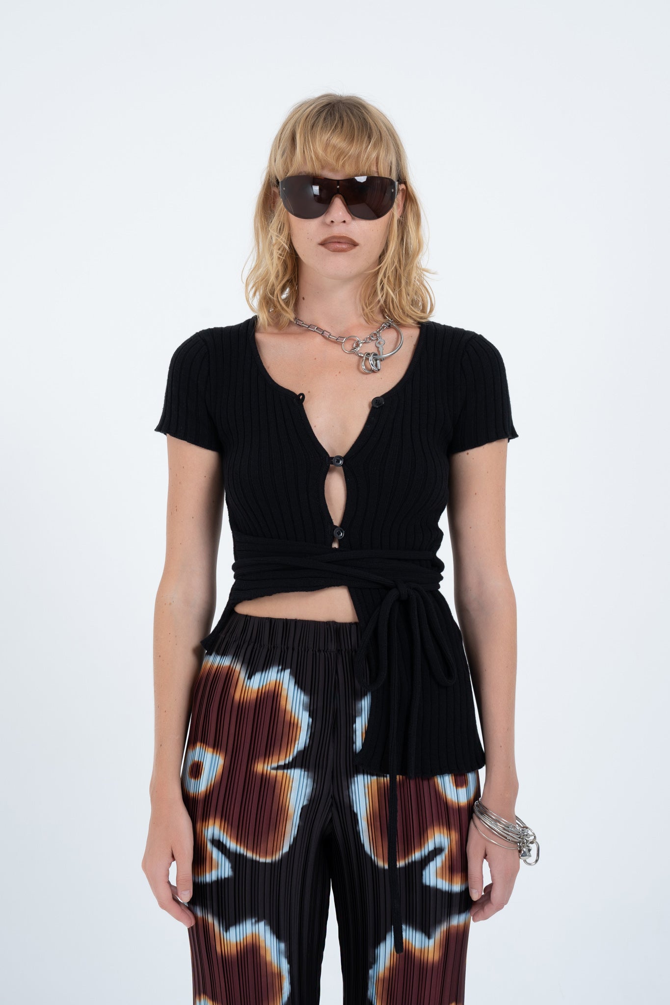 Three button centre front closure, front wrap and tie detail and contrast rib finish on hem.