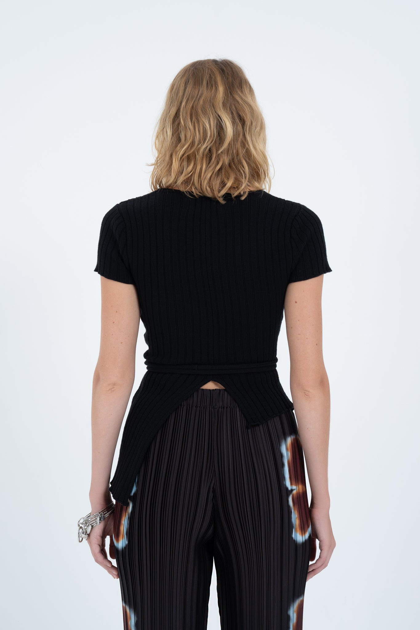 Rib knit top with asymmetric hem. Featuring a v-neck line and short t-shirt sleeves.