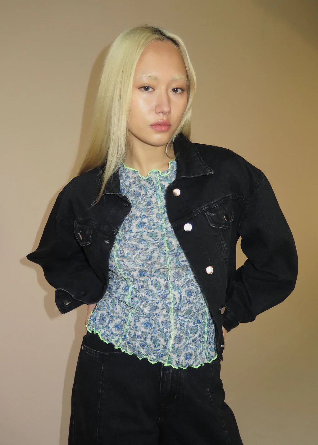 A subtly sheer stretch mesh tank with an intricate paisley print and external babylocked seam detail. Double layer at front for coverage, panelled seams throughout and babylocked edges.