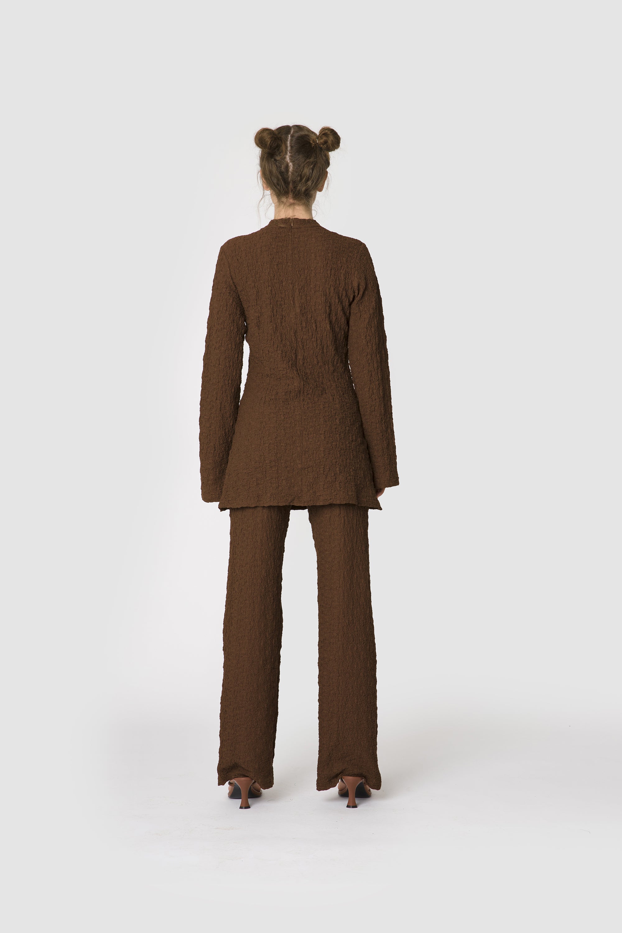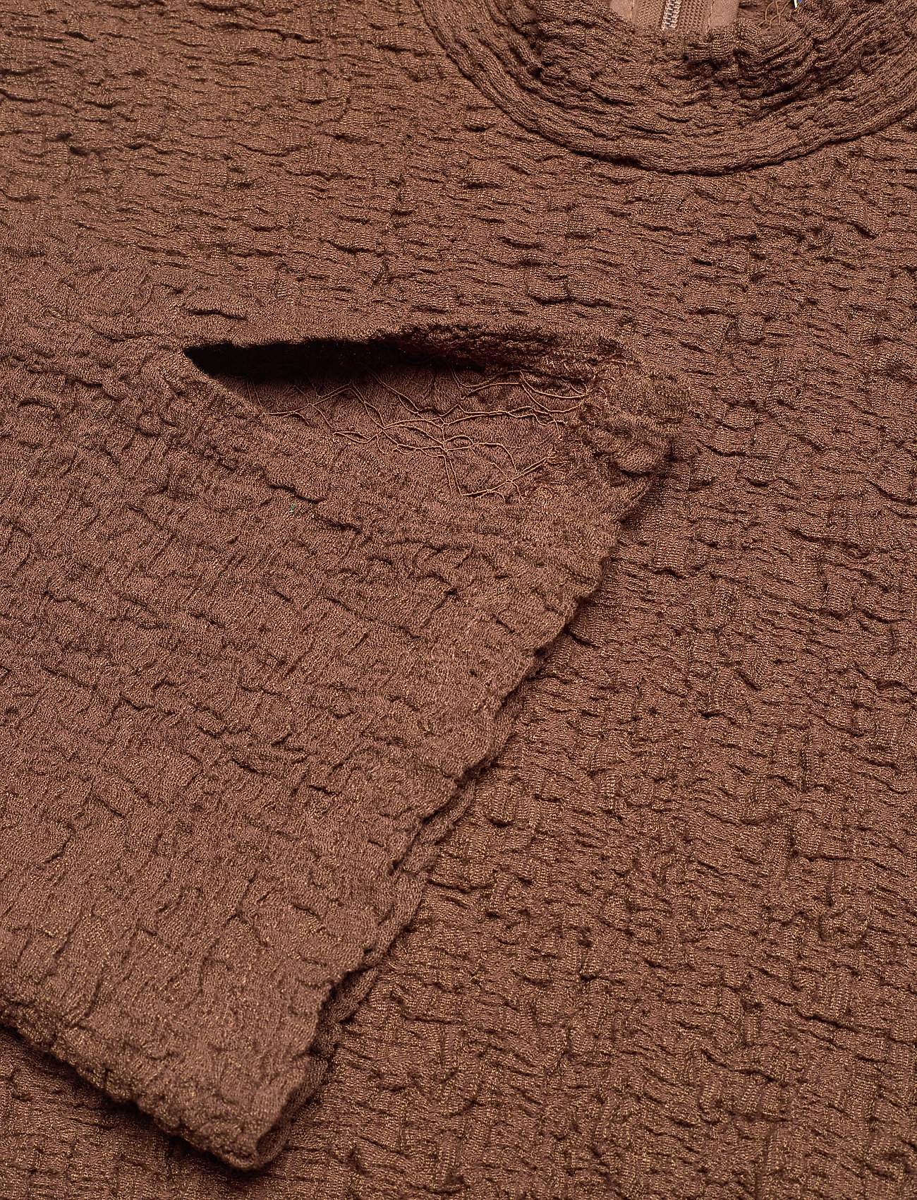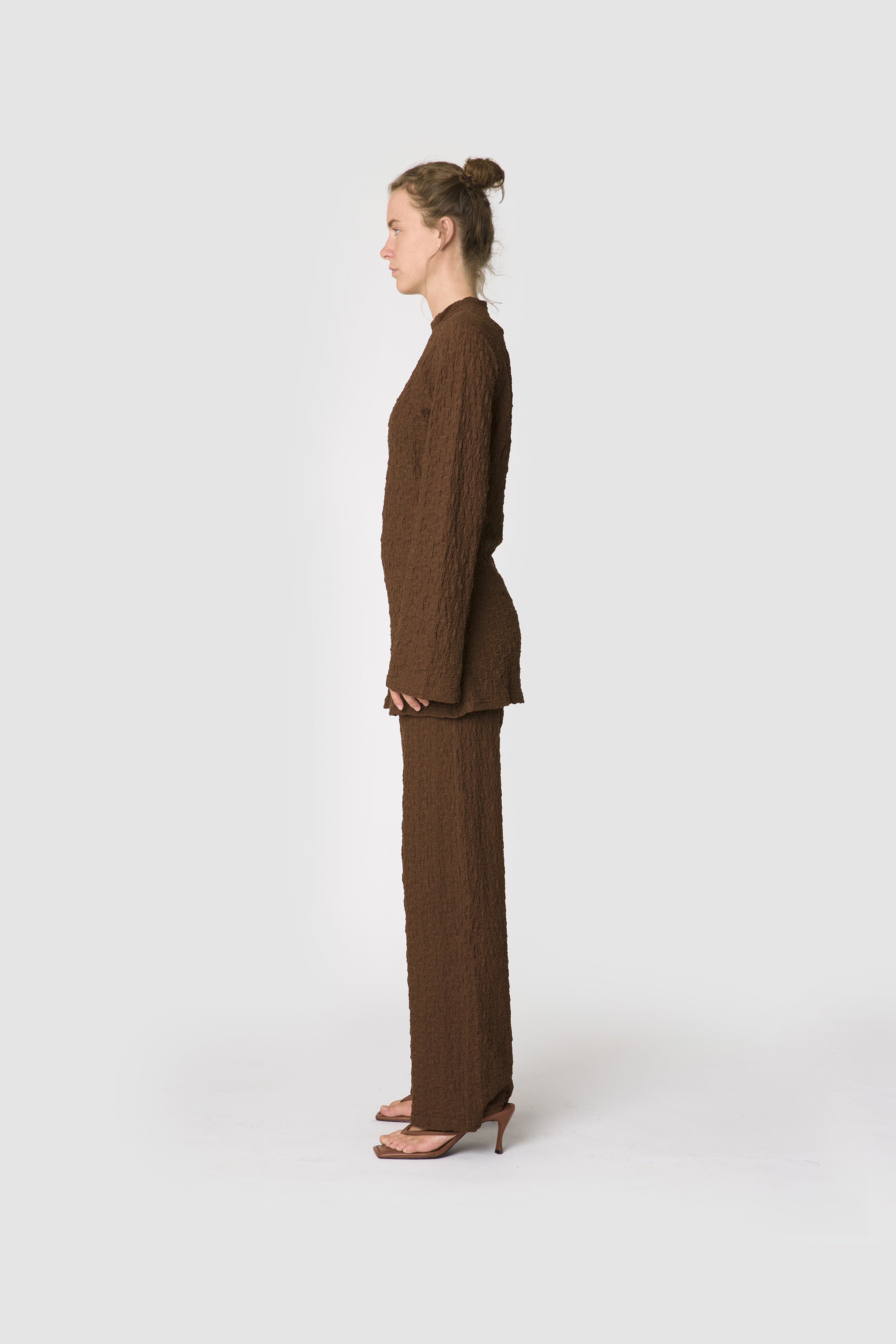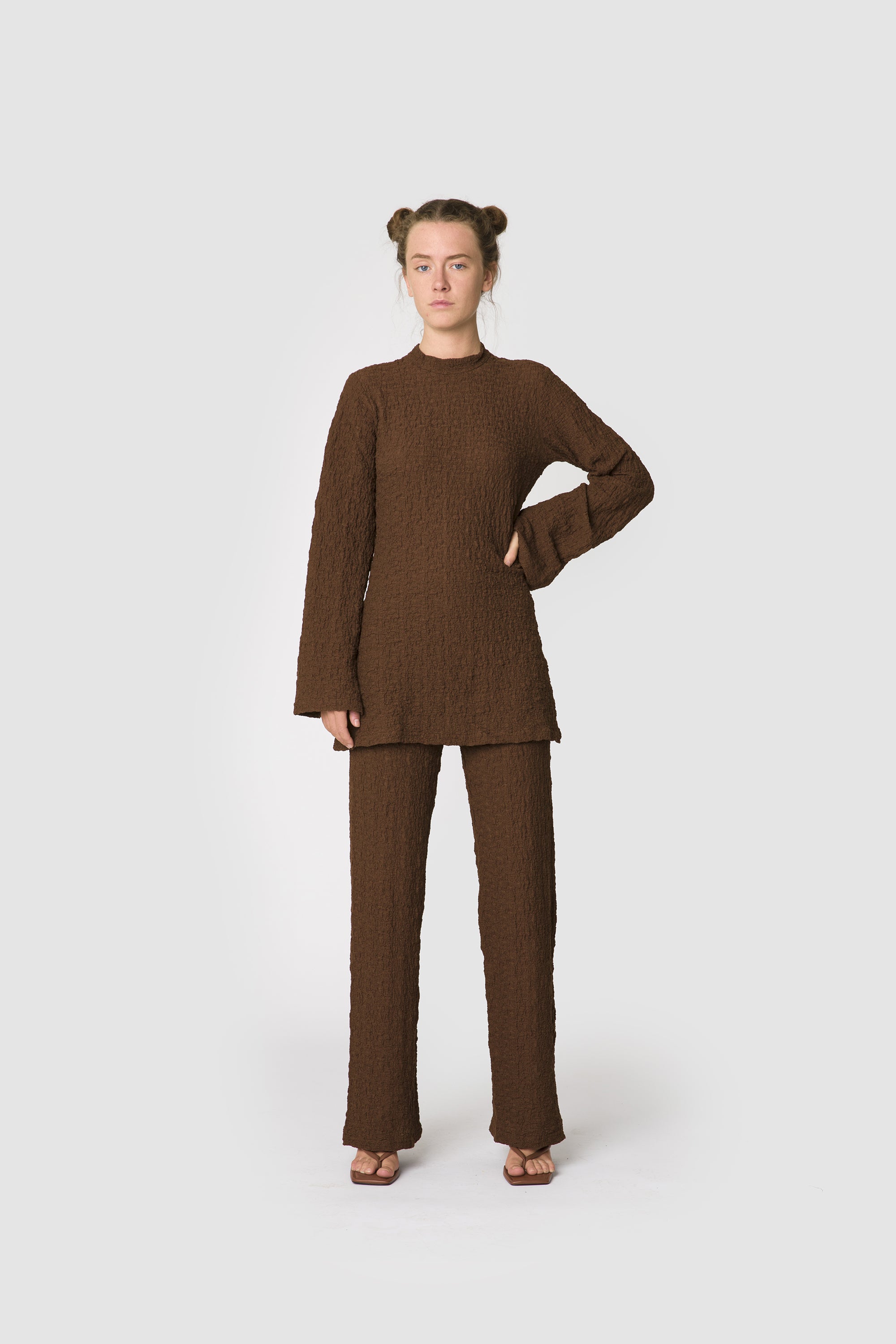 JodiRS Blouse by Resume Copenhagen. Long sleeve tunic style top in brown crinkle crepe fabric. Longline length with wide bell sleeves and featuring a short round collar. Slightly cinched at the waist making it extra flattering. Hidden back zip. Looks great paired with the matching trouser Jeremi. If you love a super mini length you could also wear this one as a dress, pair with some thick tights and chunky heels!