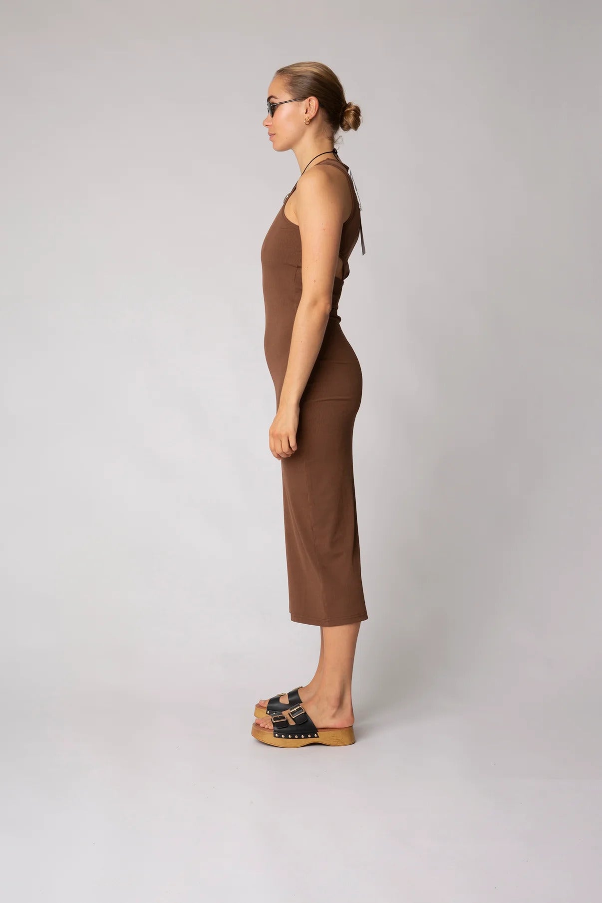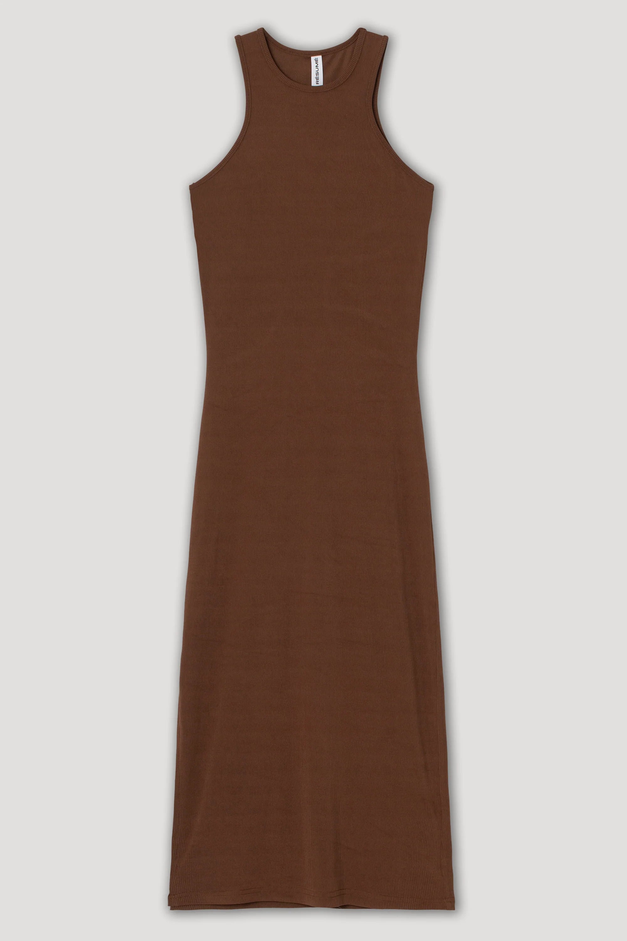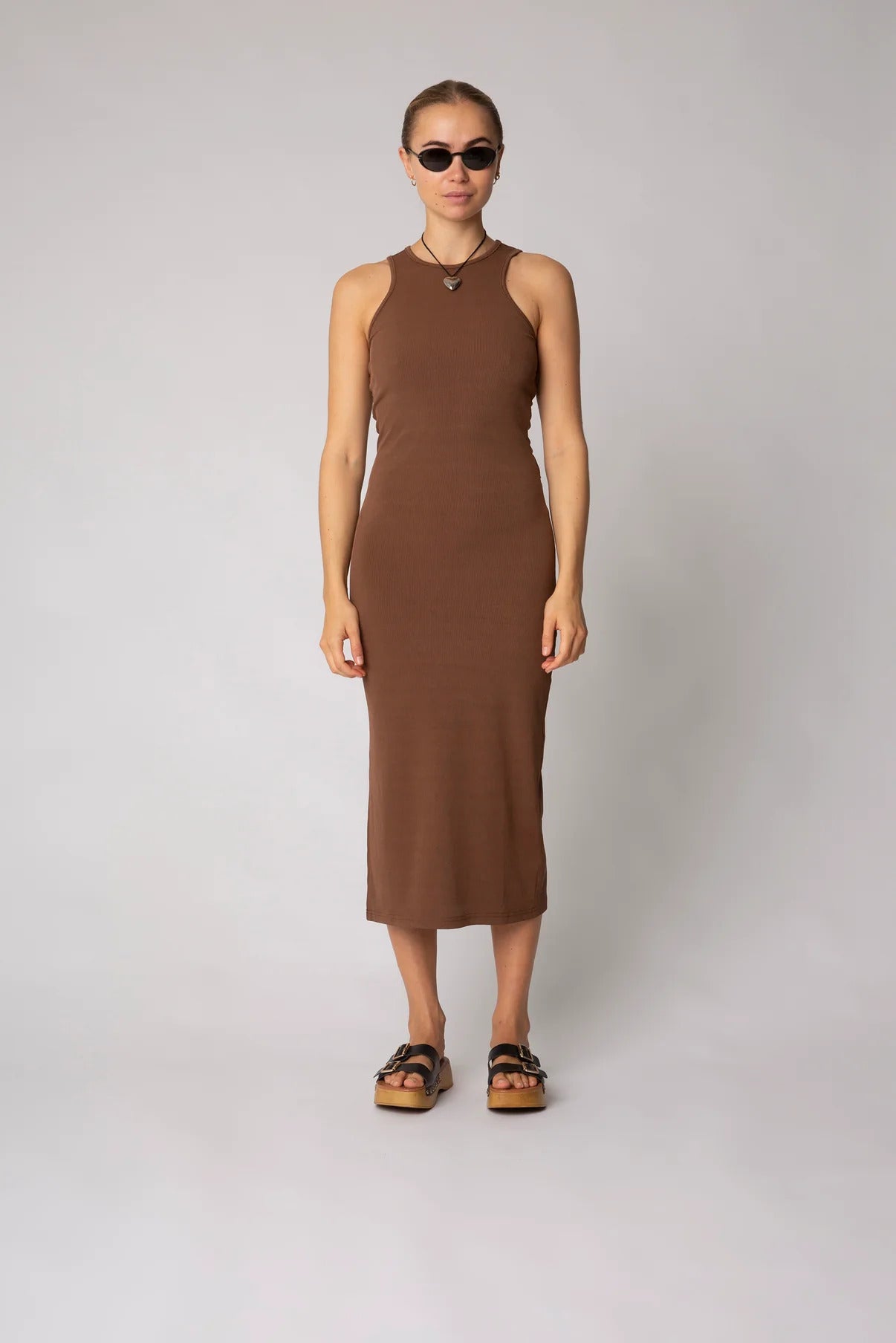 SapphireRS is a long tank-top dress in brown with the trademark Résumé logo at the back neck and a cut away detail at back waist.